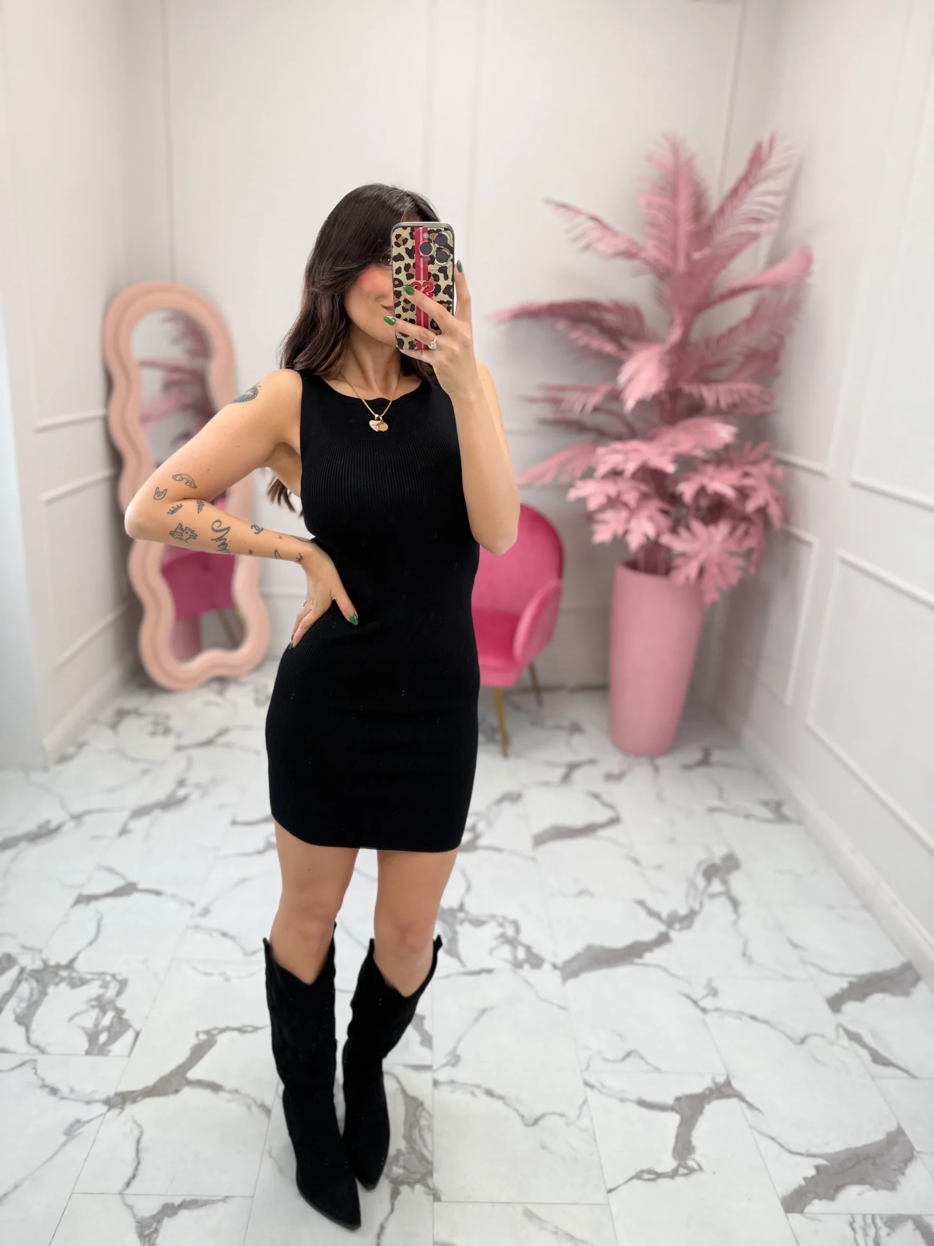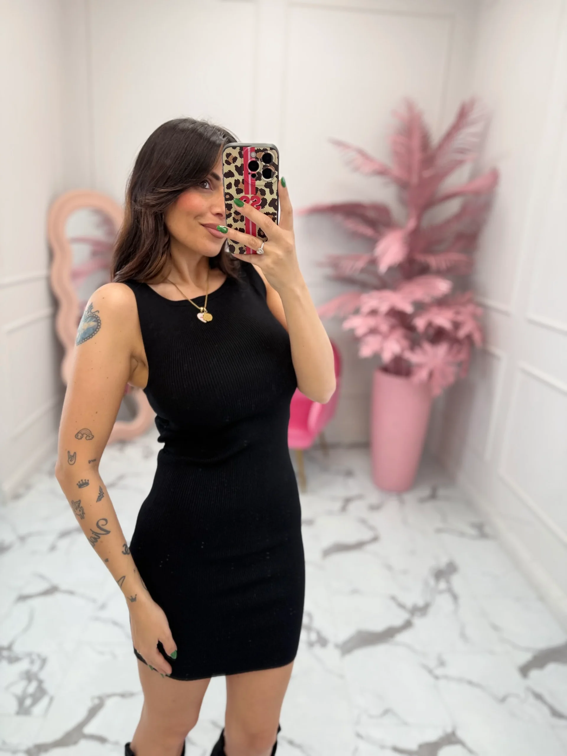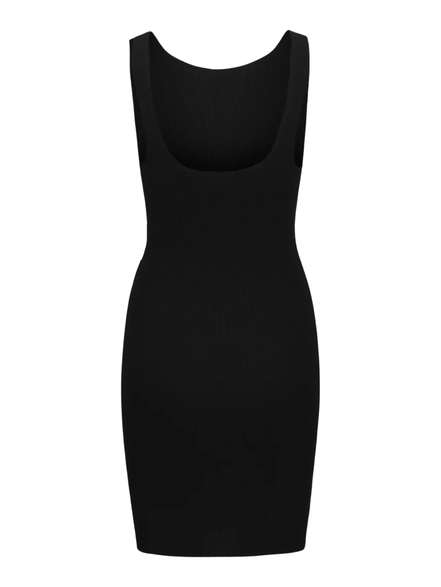 Abito a costine fini, girocollo, smanicato, scollo squadrato, ampio nella parte posteriore. Super stretch, vestibilità regolare. La modella è alta 160cm e indossa la taglia S. composizione: 72% viscosa-28% nylon