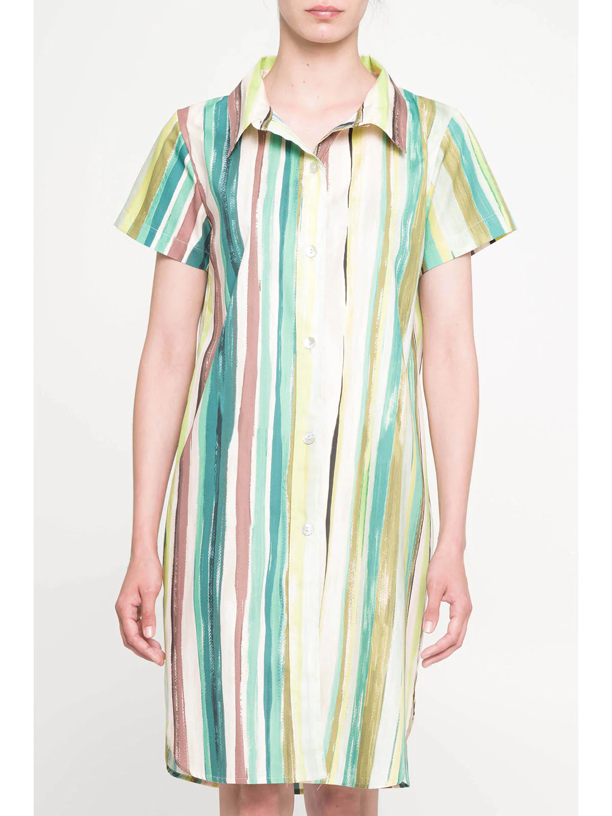 Abito donna in fresco tessuto a navetta di puro cotone. Davanti e dietro in stampa all over righe. Modello con colletto e abbottonatura sul davanti. Interamente apribile. La compattezza del tessuto conferisce freschezza e stile. ABITO IN FANTASIA RIGATA INTERAMENTE APRIBILE MANICA CORTA FRESCO POPELINE DI PURO COTONE LINEA “NATURAL”