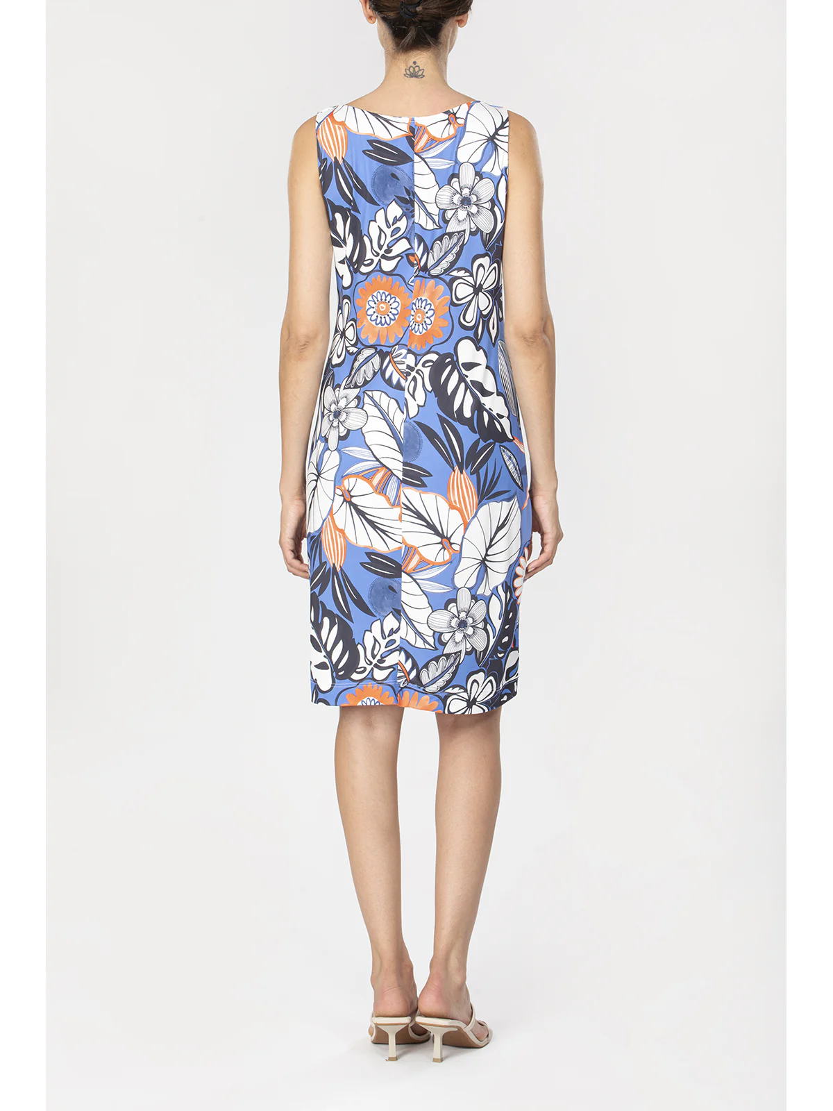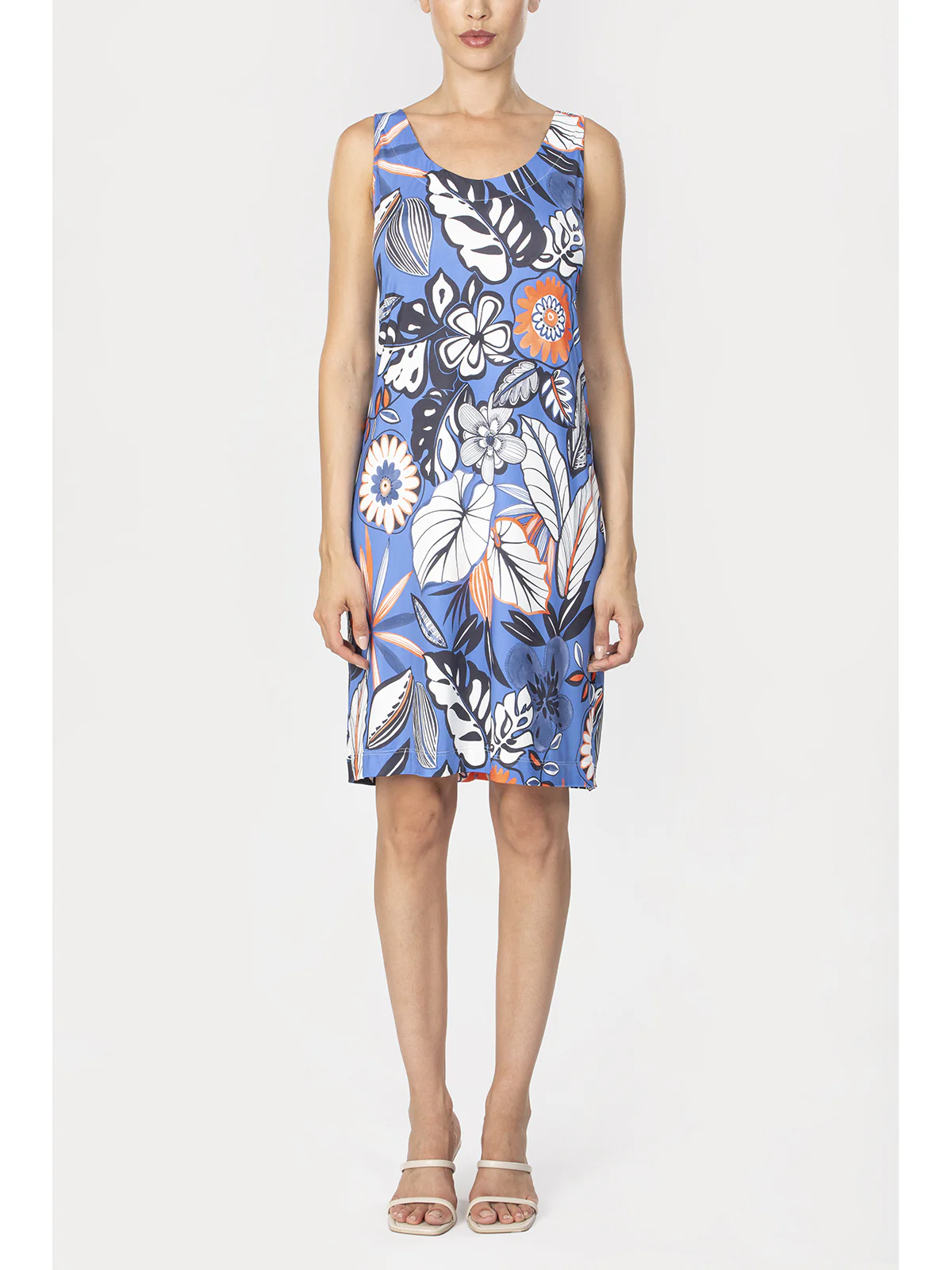 Abito donna in tessuto lucido in confortevole jersey elasticizzato. Davanti e dietro in stampa all over. Modello senza maniche con ampio scollo rotondo. La lucentezza del tessuto conferisce brillantezza dei colori e stile. Vestibilità e qualità firmata Alpina.