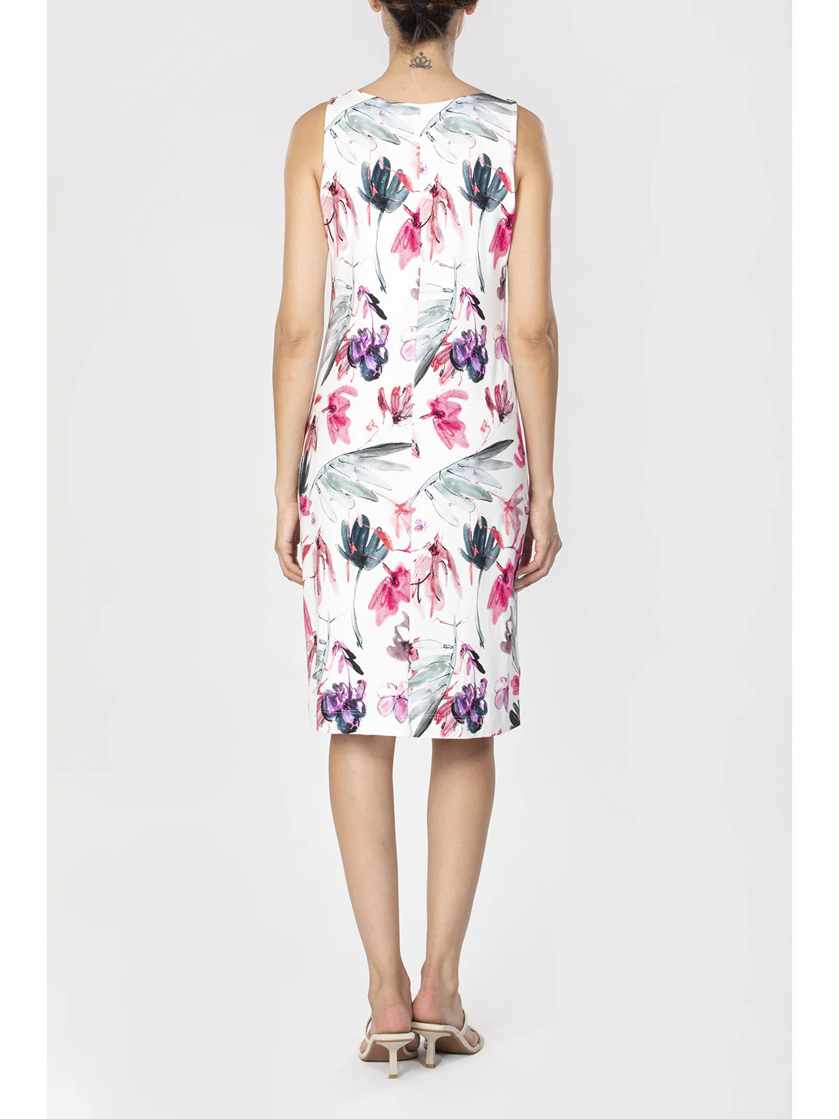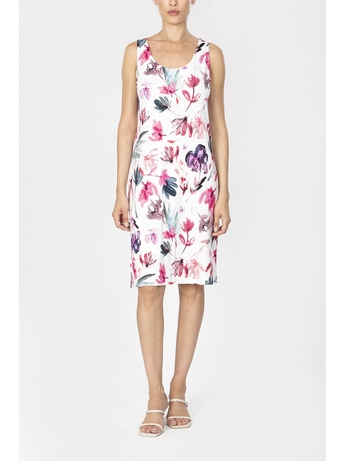 Abito donna in tessuto opaco in confortevole viscosa elasticizzata. Davanti e dietro in stampa all over. Modello senza maniche con ampio scollo rotondo. L’opacità del tessuto conferisce eleganza e stile. Vestibilità e qualità firmata Alpina.
