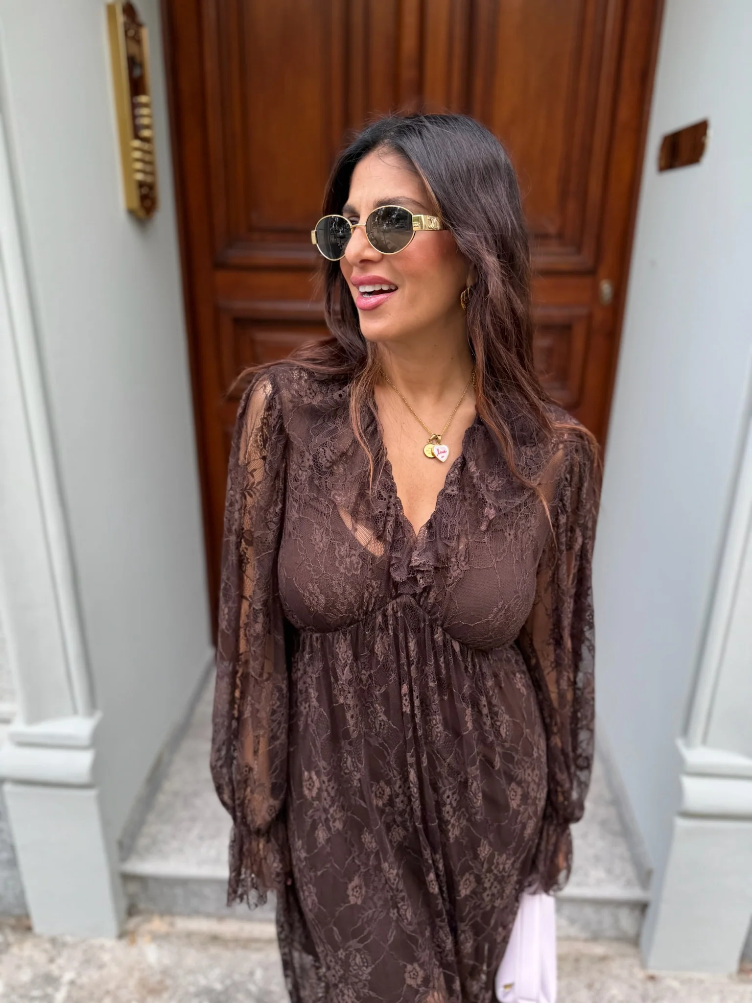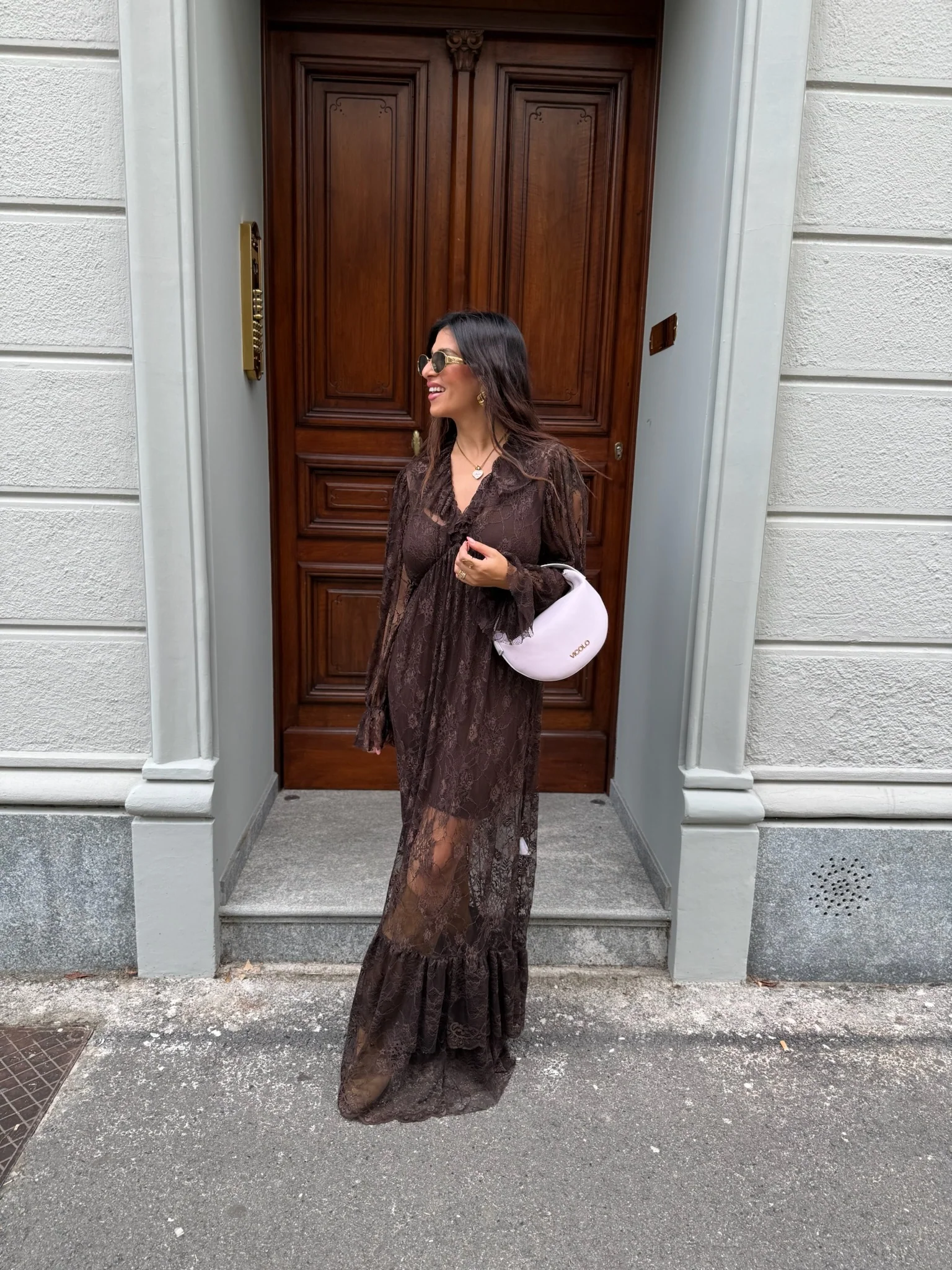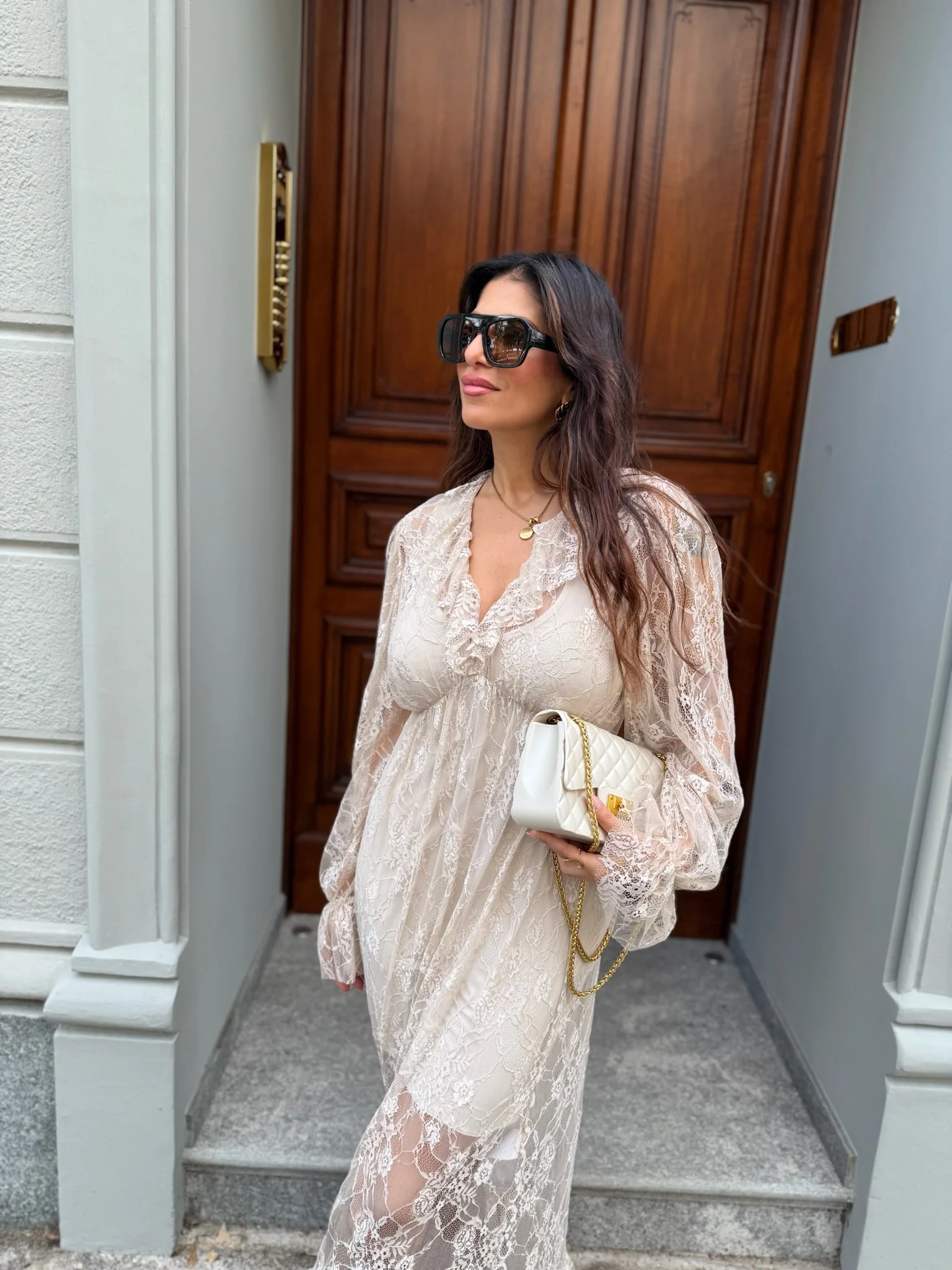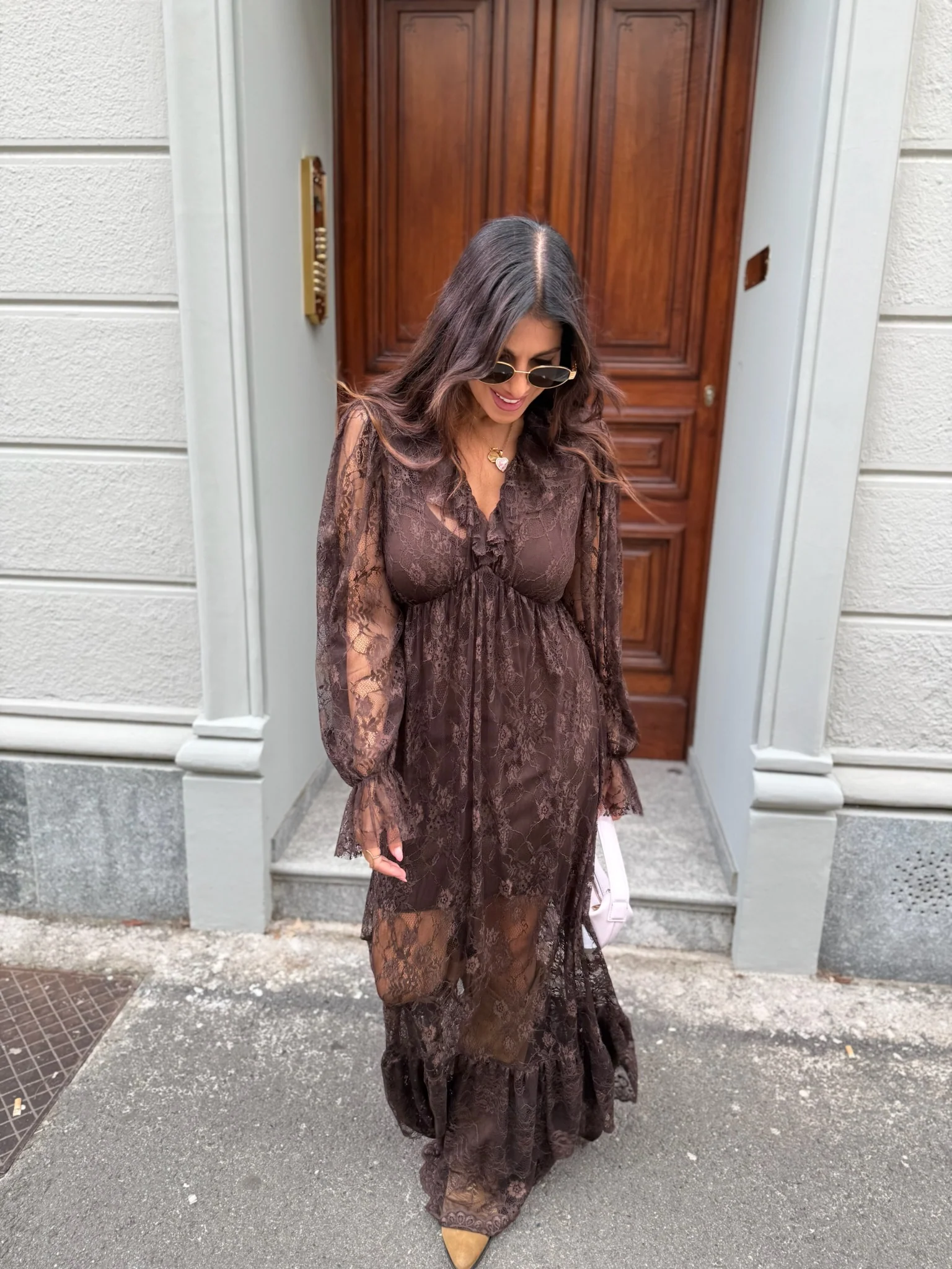 Abito lungo in pizzo con scollatura ad incrocio e rouches, manica lunga con polsino ampio. Abito sottogonna corto e balza al fondo. Vestibilita’ comoda. La modella indossa la S.