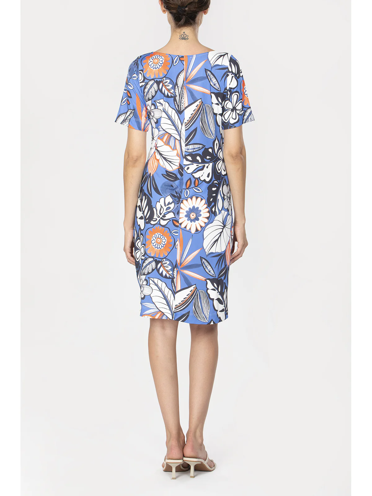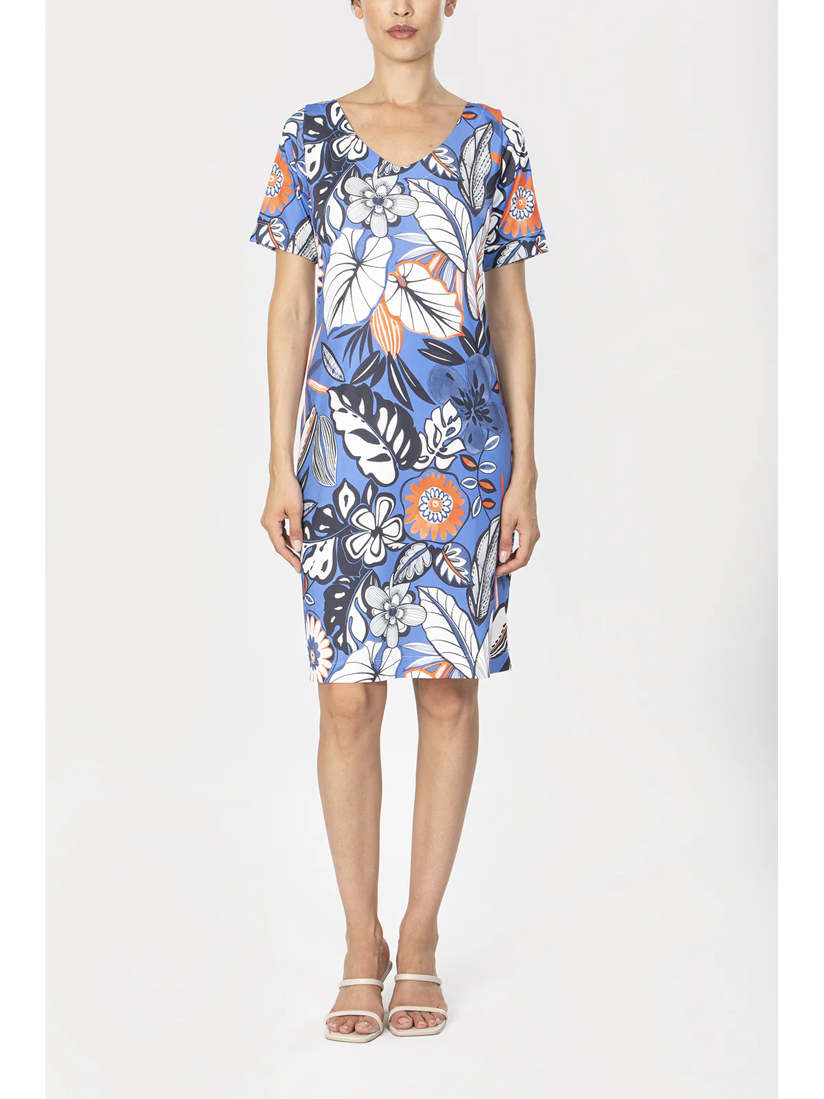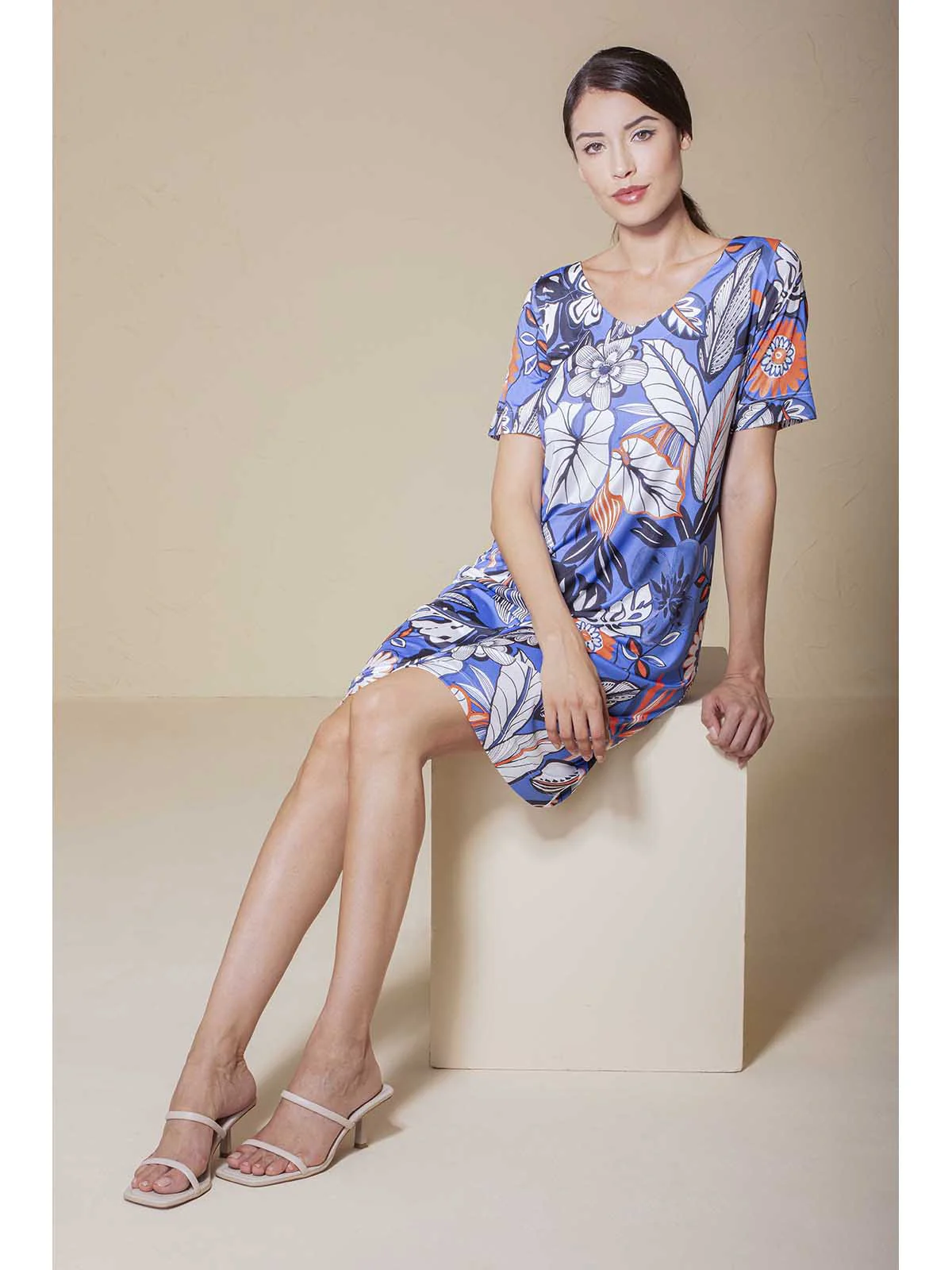 Abito donna in tessuto lucido in confortevole jersey elasticizzato. Davanti e dietro in stampa all over. Modello a manica corta con ampio scollo a V. La lucentezza del tessuto conferisce brillantezza dei colori e stile. Vestibilità e qualità firmata Alpina.