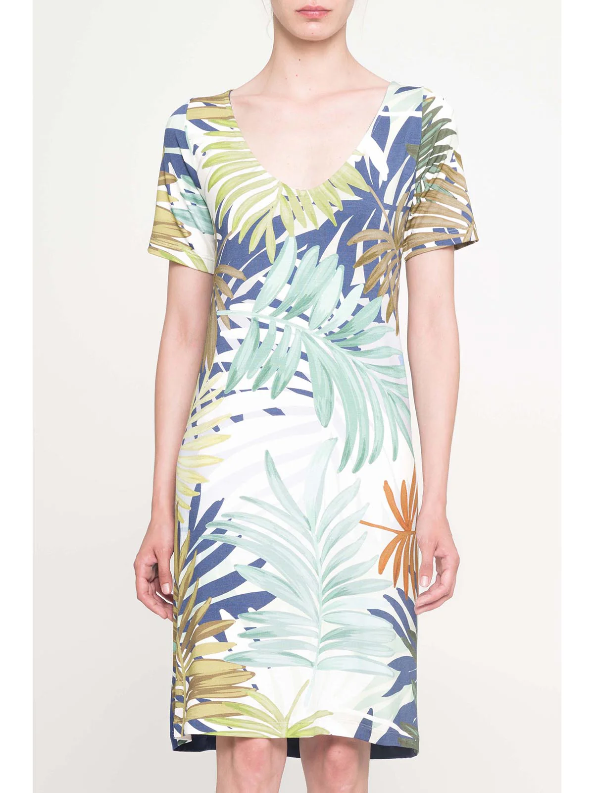 Abito donna in morbido tessuto elasticizzato di viscosa. Stampa all over disegno foglie. Davanti fantasia con disegno foglie, dietro in tinta unita. Modello con manica corta in fantasia. L’opacità del tessuto conferisce un gusto moderno, dall’eleganza discreta.
