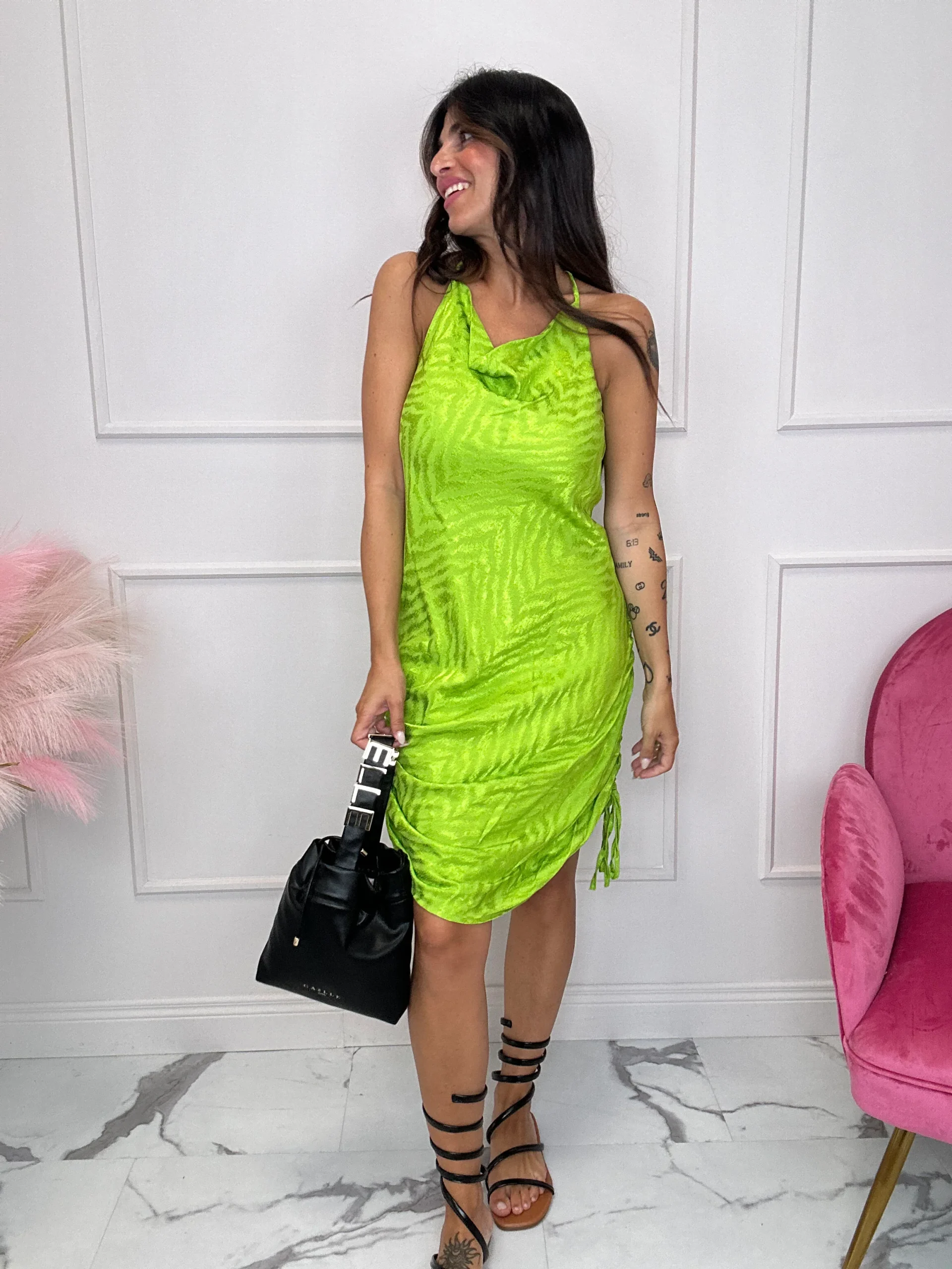 Abito in simil raso fantasia con spalline regolabili e fondo con effetto arricciato e coulisse. Vestibilitaโ regolare