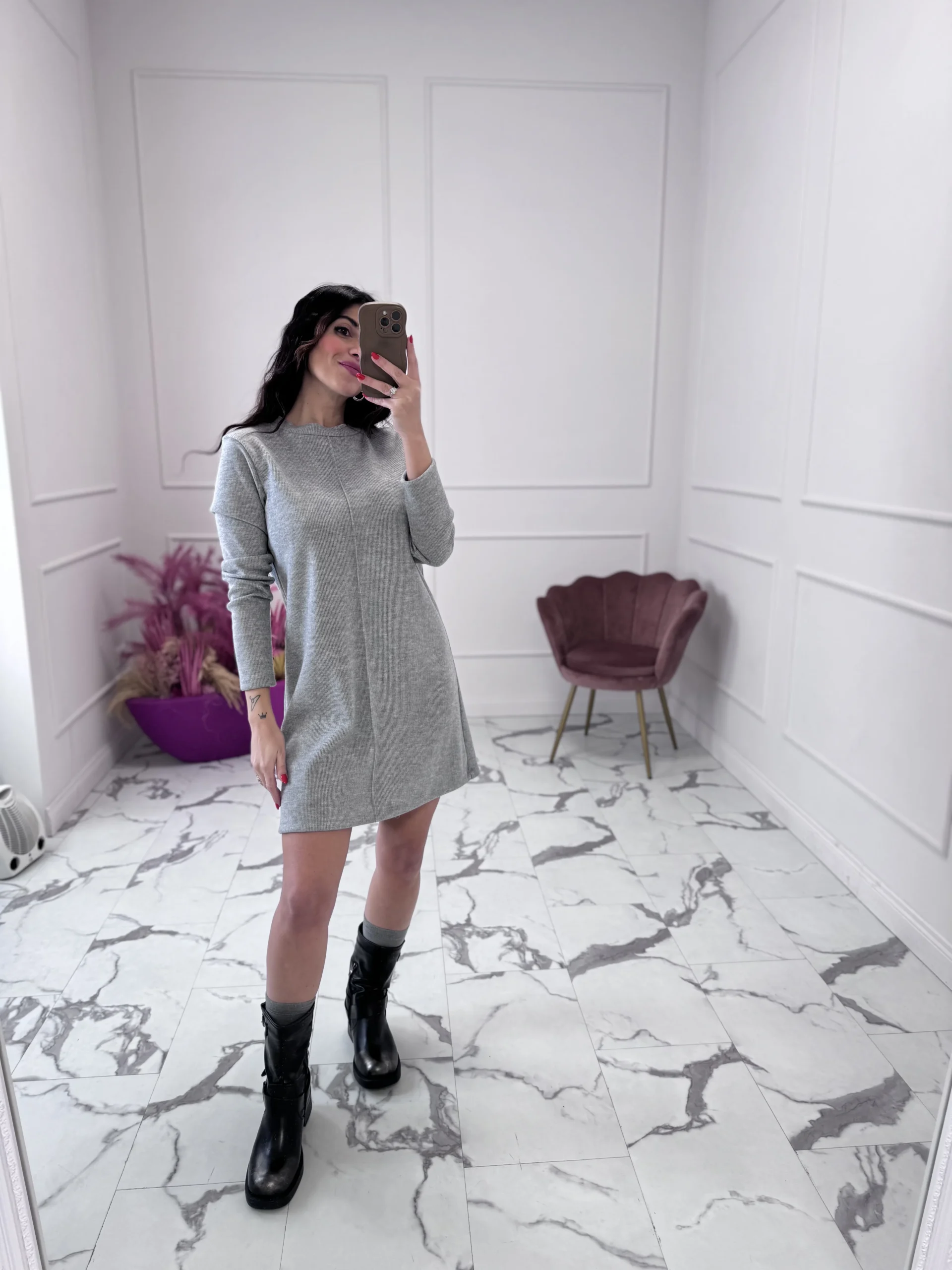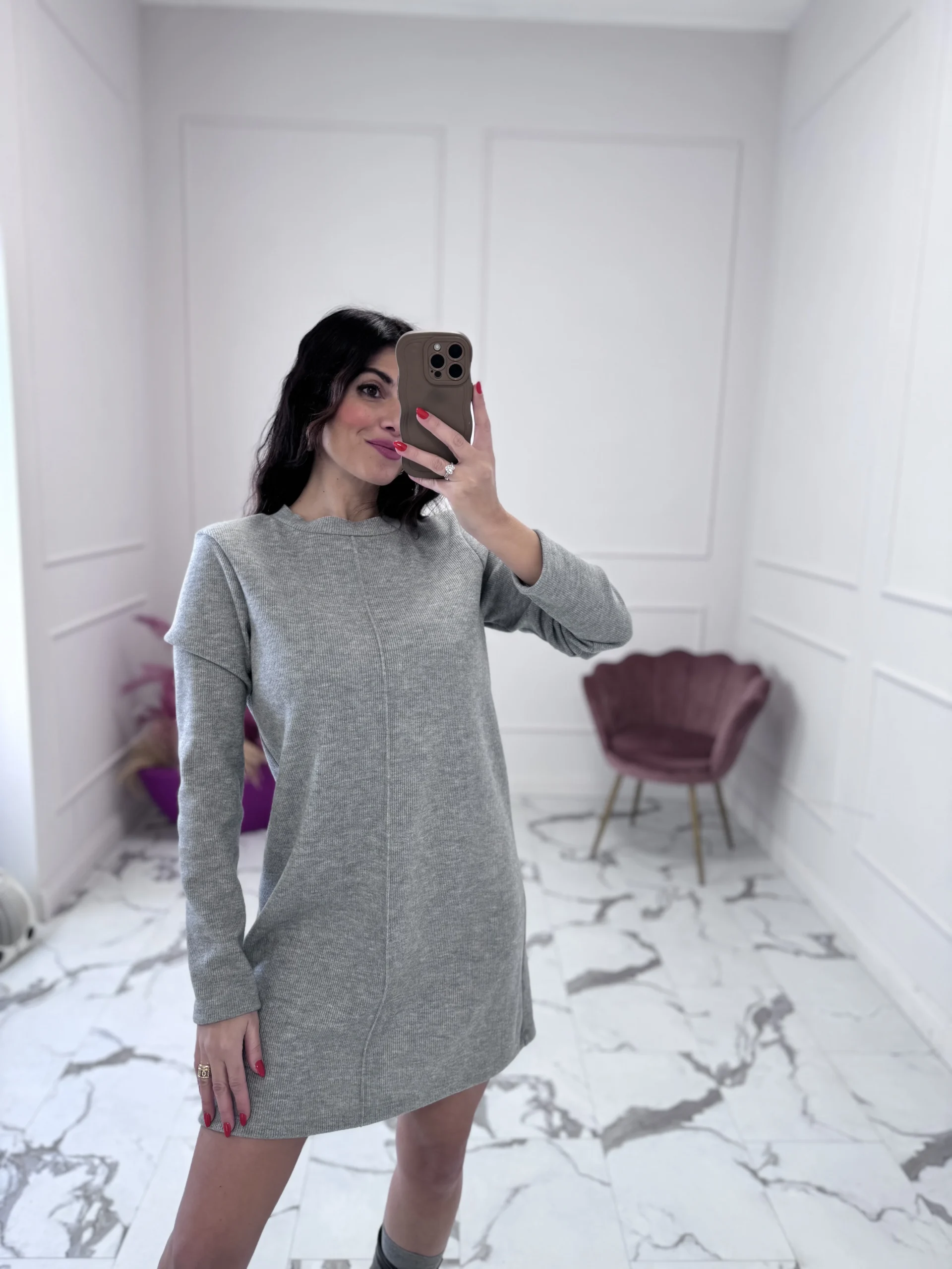 Abito in maglia a costine, girocollo, leggermente svasato, con manica lunga,variante unica grigio melange, vestibilità regolare. composizione: 60%poliestere-20%viscosa-20% acrilico la modella indossa taglia S