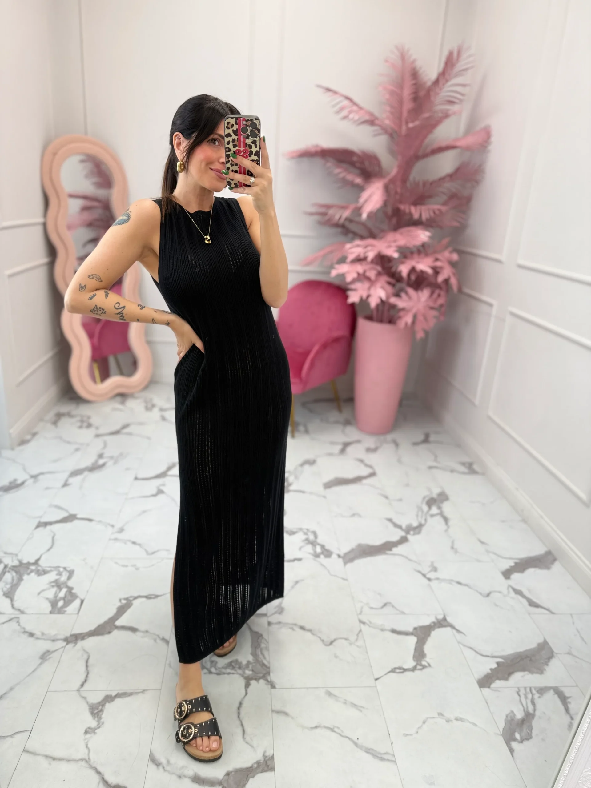 Abito in cotone, lungo, smanicato, girocollo, in maglia traforata, super stretch, spacco laterale al fondo dell’ abito. vestibilità regolare. La modella è alta 160cm e indossa la taglia XS.