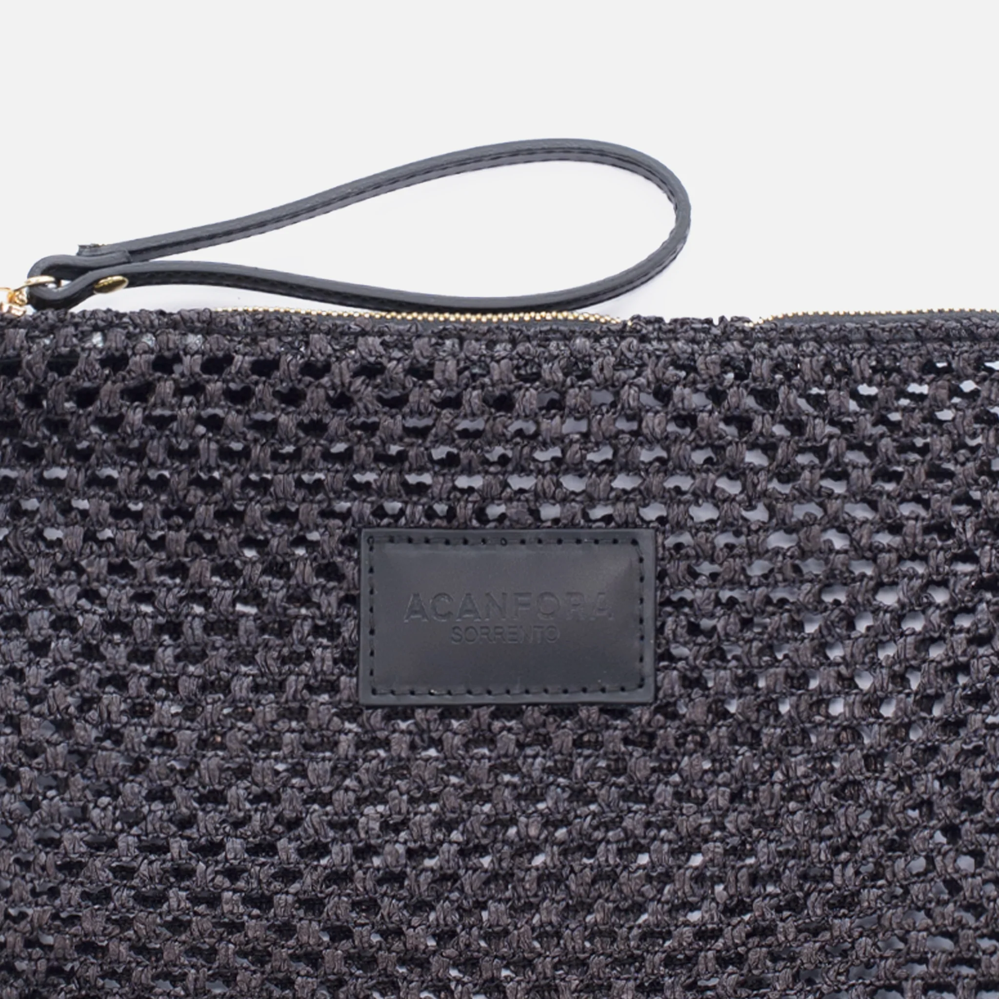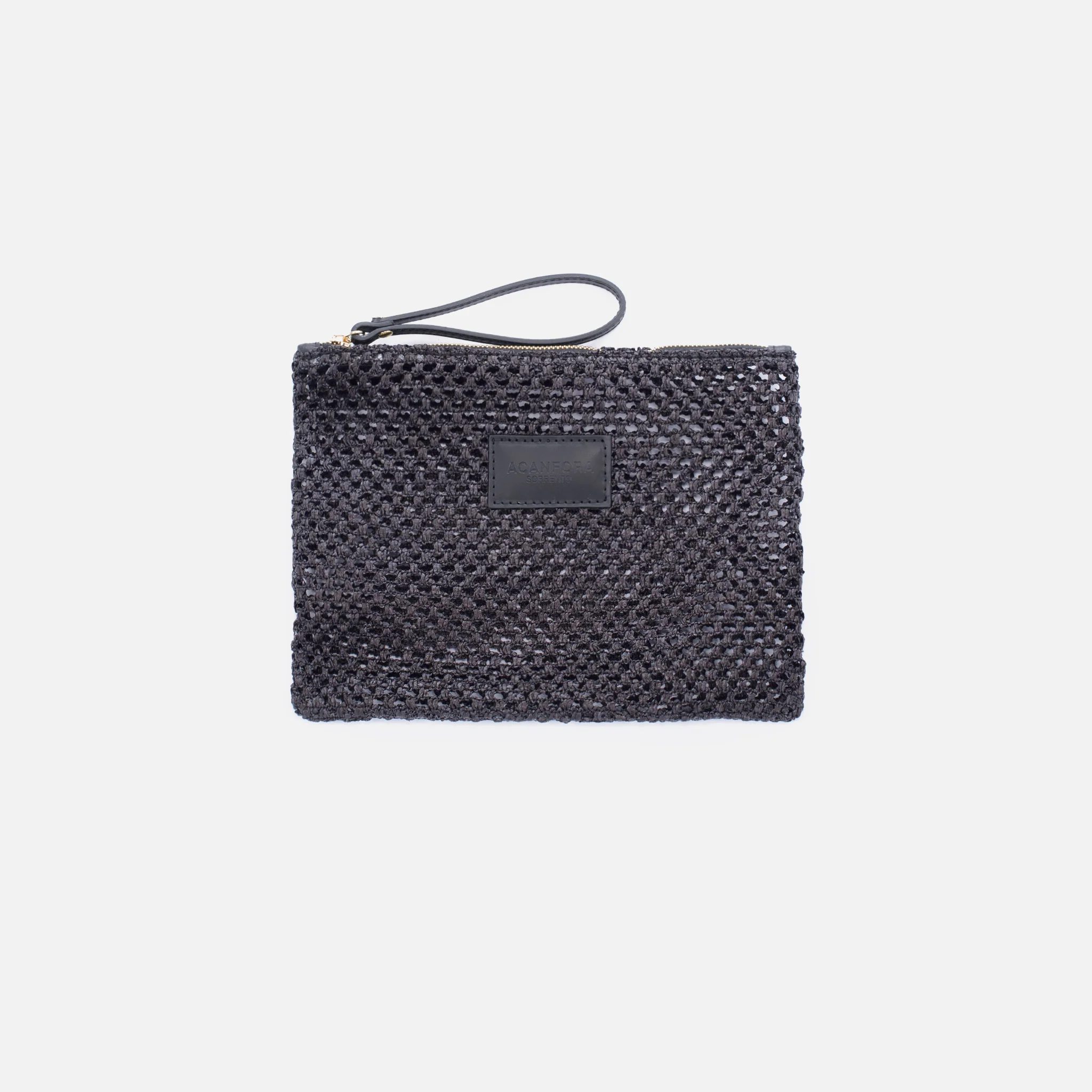 Pochette in rete di RafiaChiusura ZipRifiniture in pelleLogo ACANFORA Sorrento in pelleMade in Italy100% Rafia30x20x3 cm 4250-NERO
