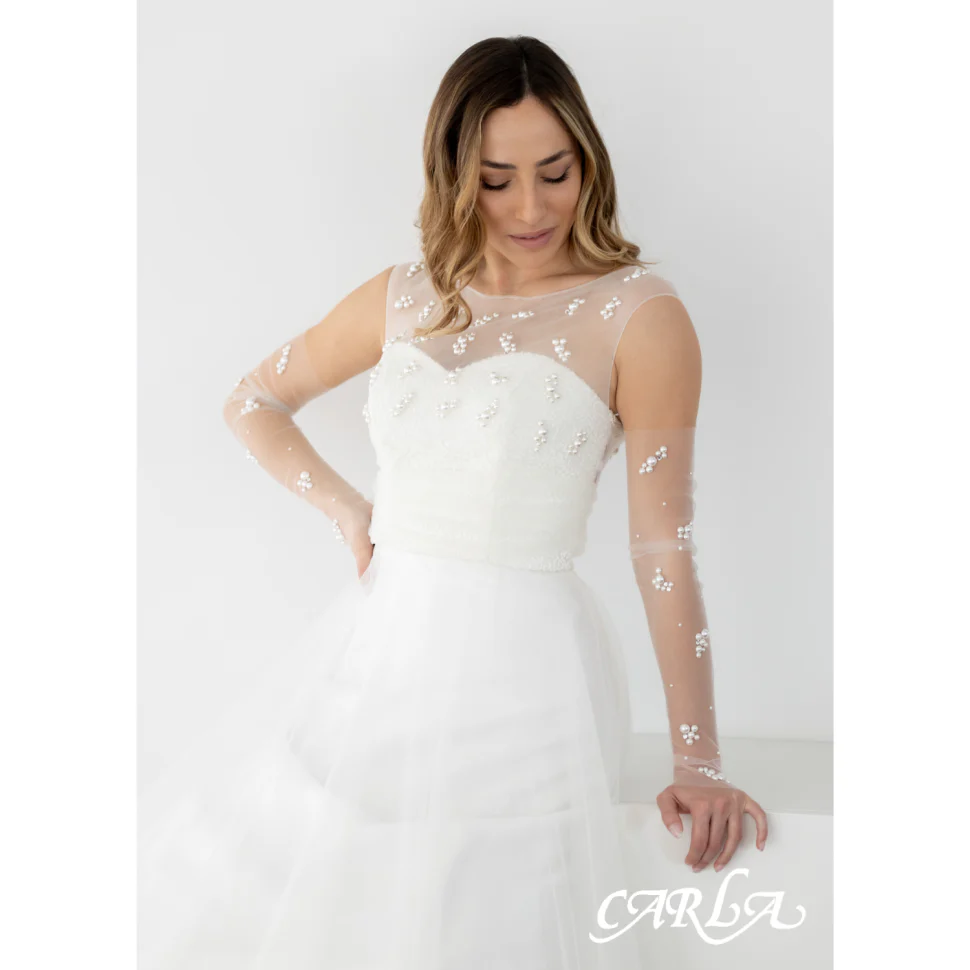 Manicotti in tulle co grappoli di strass e cabochon di perla misti.