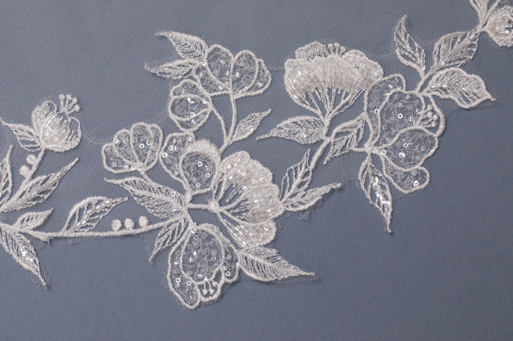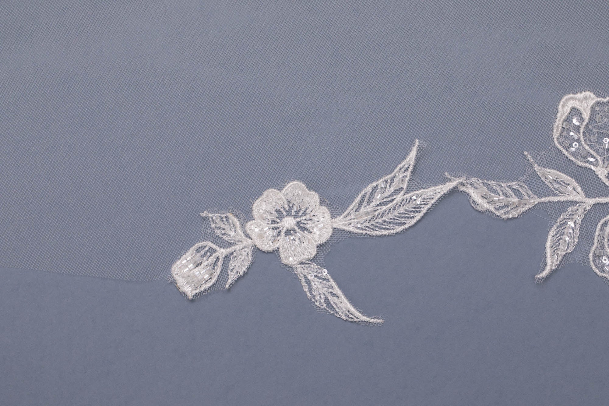 Velo lungo con bordo laser realizzato con inserto ramage in pizzo ricamato.