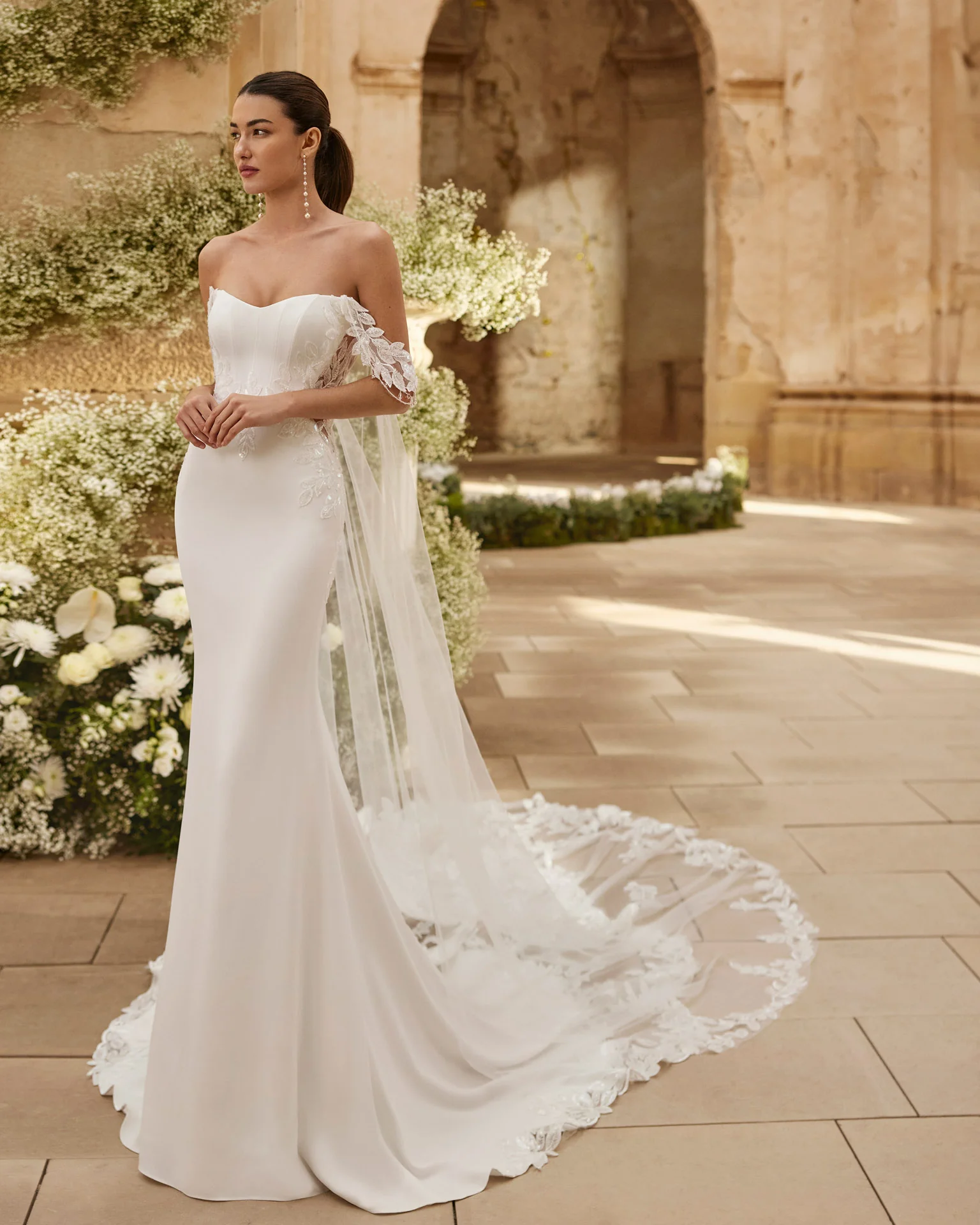 Abito da sposa a sirena in crepe con scollo a sorriso, intagli sensuali sul fianco e schiena scollata a tattoo. Completano il look spalline omerali in tulle e pizzo e una mantella in tulle che dona al look un tocco regale. #2026 #Collezione2026