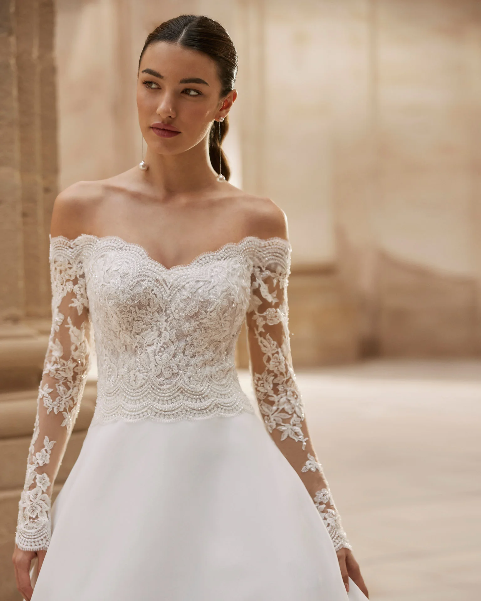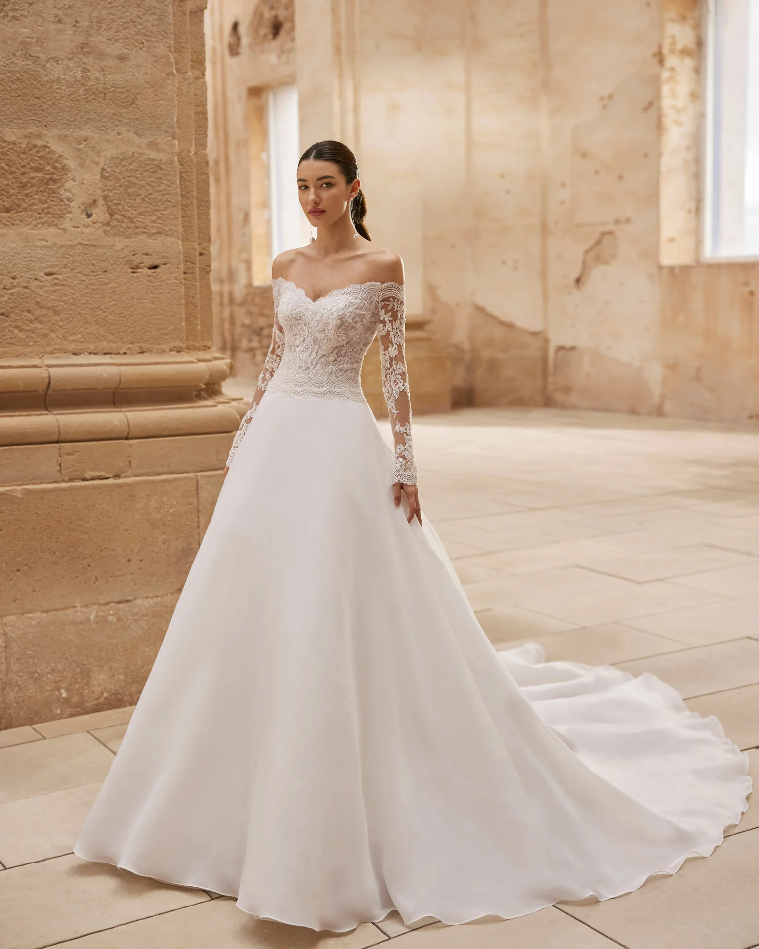 Abito da sposa da principessa in organza con corpino in pizzo e ricamo luminoso con scollo omerale e maniche lunghe.