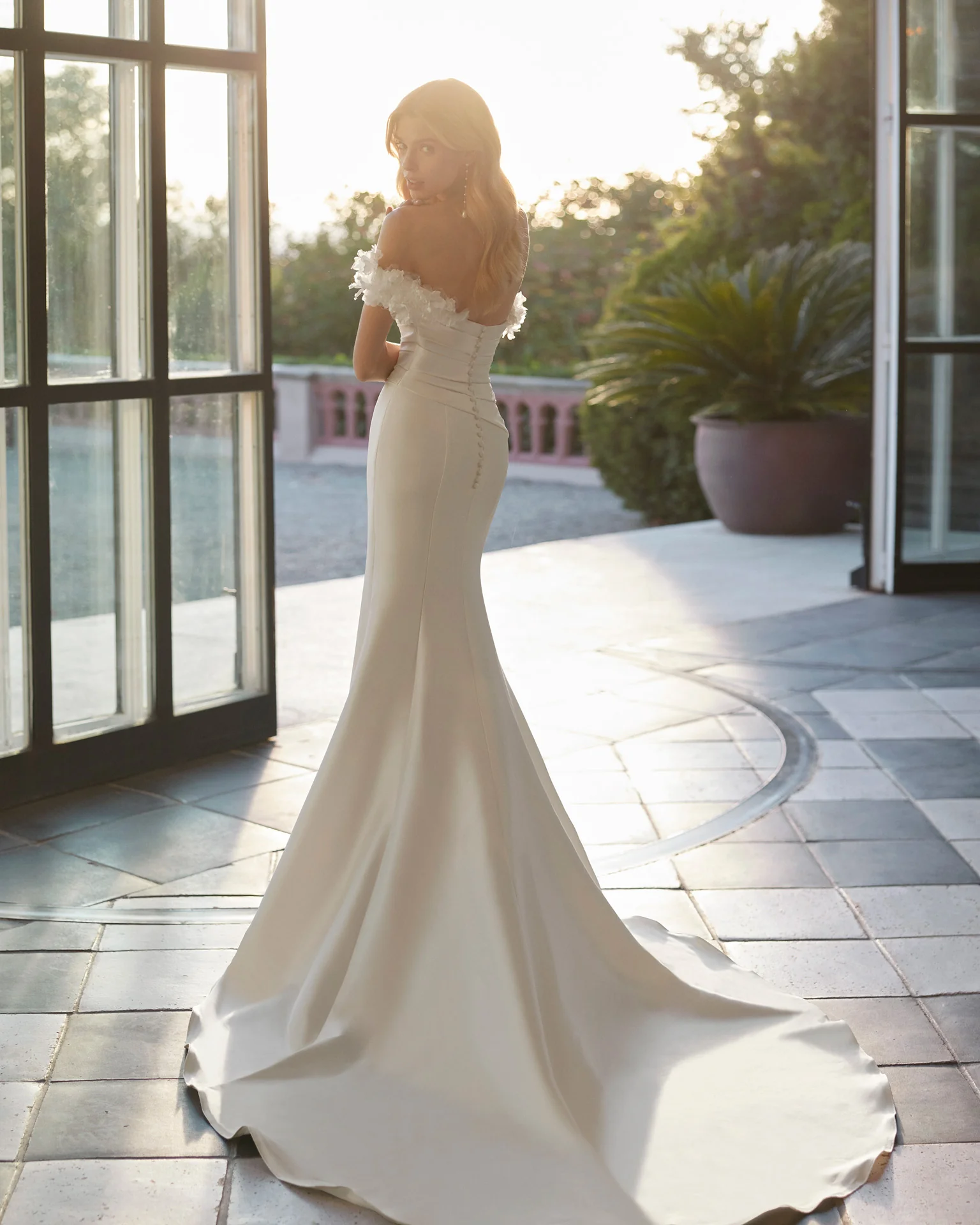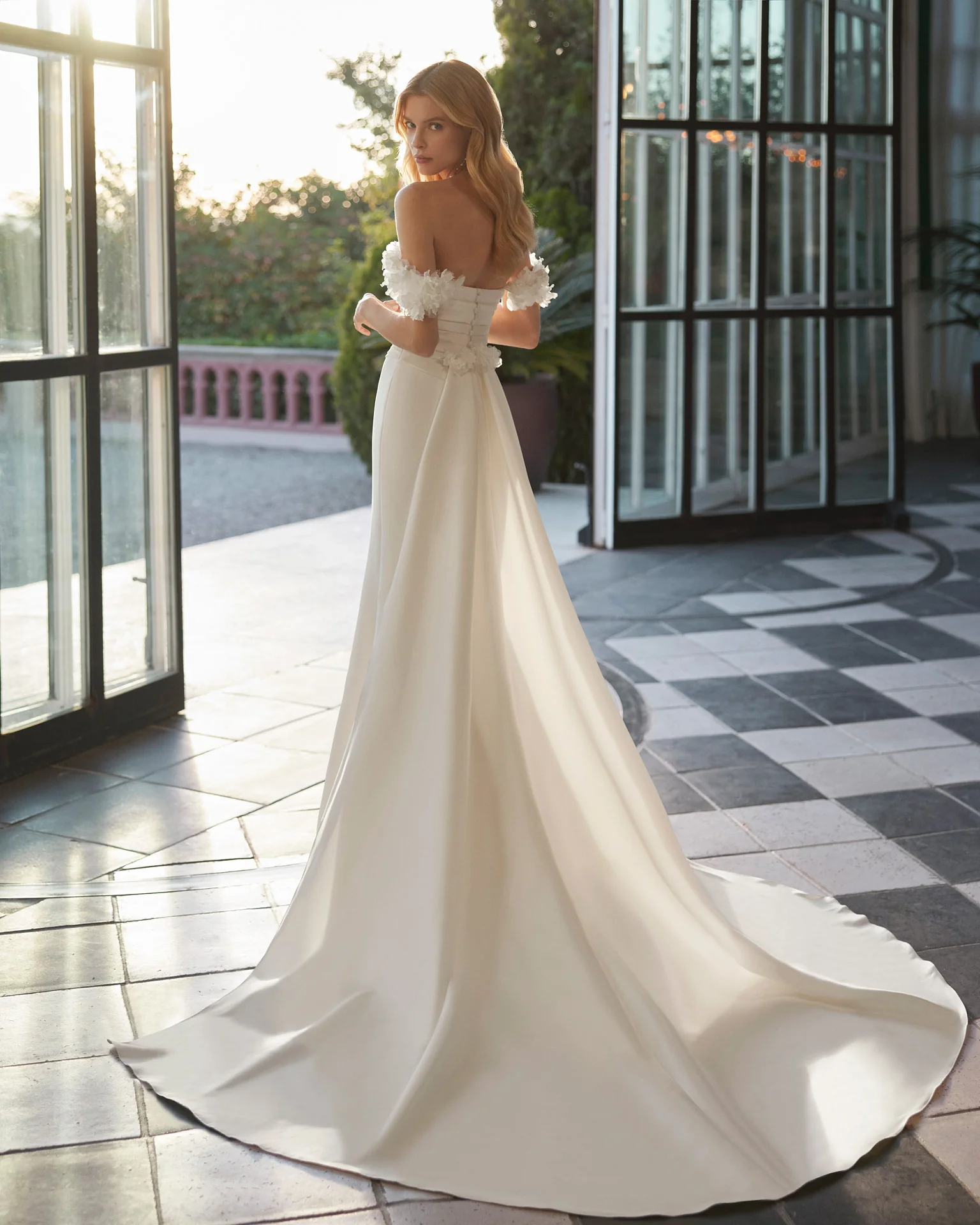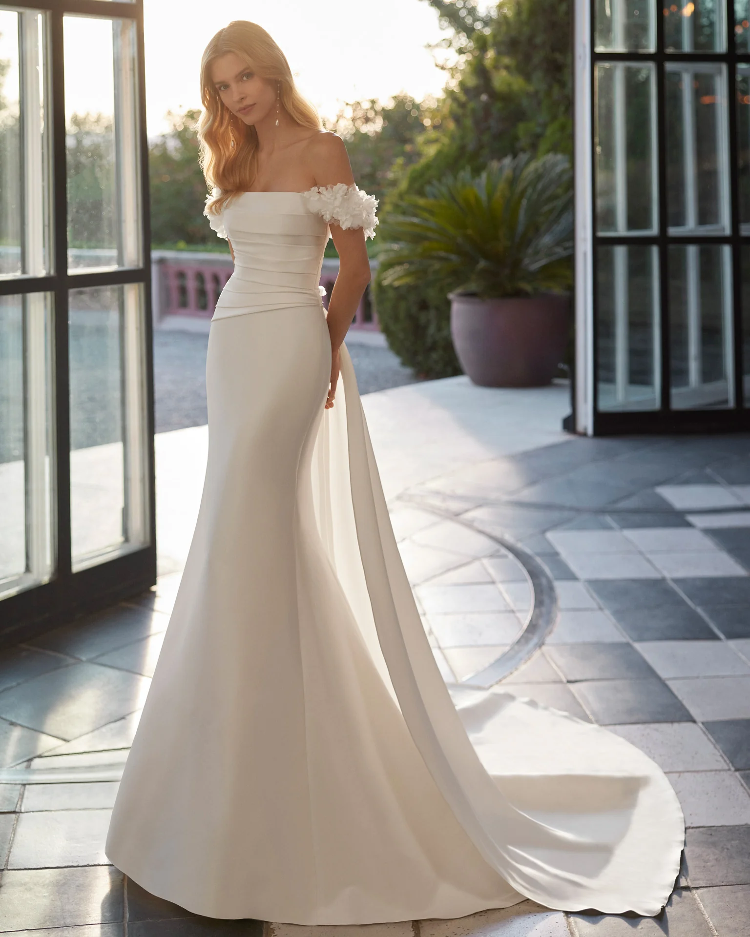 Abito a sirena realizzato in mikado con corpino drappeggiato, spalline omerale tridimensionali floreali e una coda staccabile in mikado a completare il look.