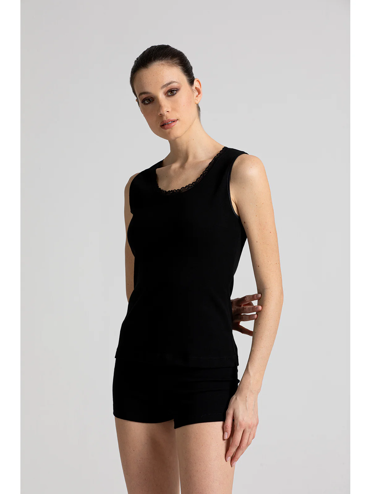 Maglietta intima modello con spallina larga in interlock di puro cotone felpato. La lavorazione della garzatura che subisce provoca la formazione di piccolissimi riccioli in cotone che rendono il tessuto più morbido, trattenendo il calore del corpo e dando una sensazione di tepore, per questo lo chiamiamo anche caldo cotone.