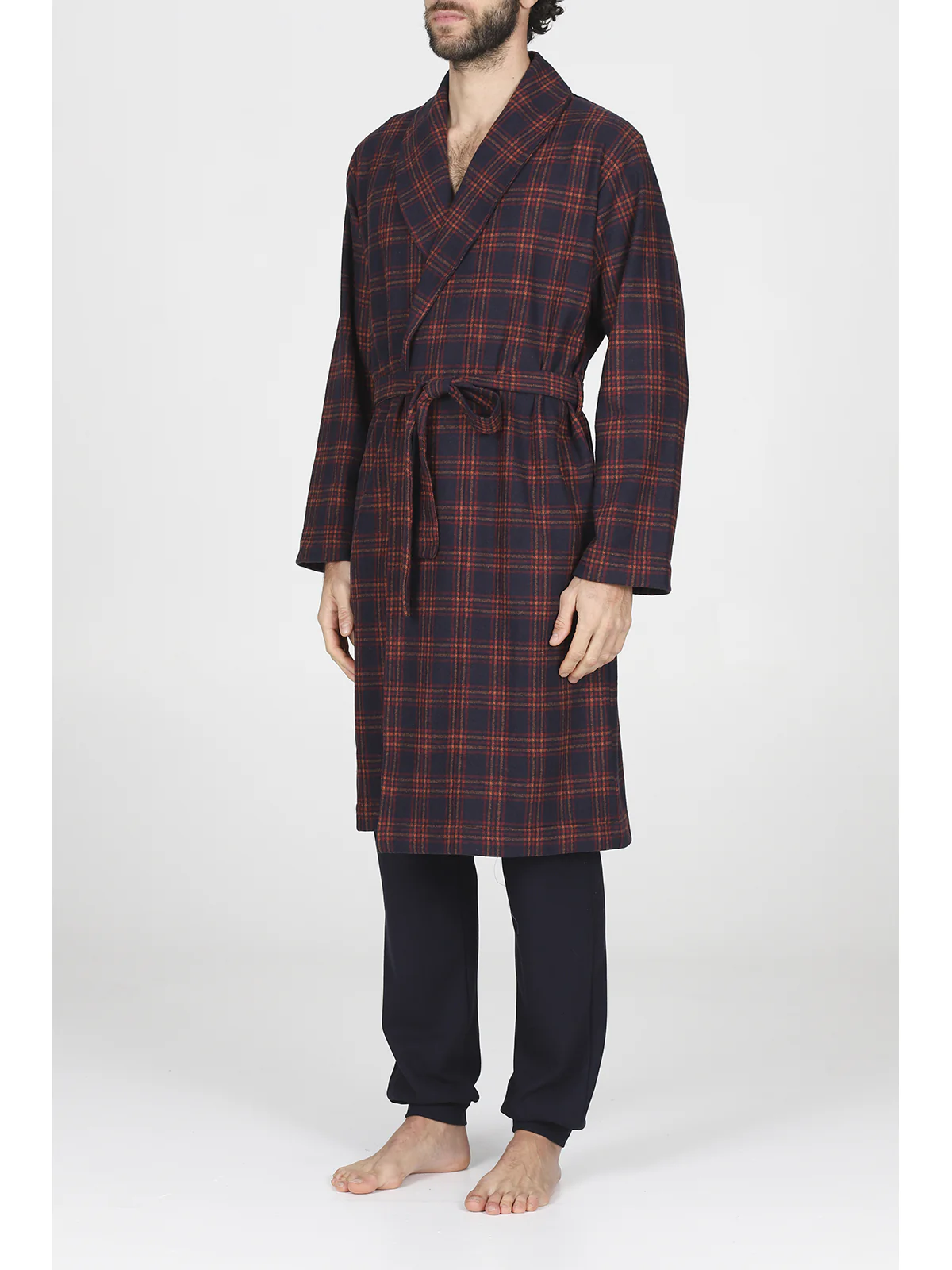 Vestaglia da uomo in jacquard di cotone: calda, morbida ed elegante. Modello lungo in elegante fantasia scozzese con collo sciallato e pratiche tasche laterali. Chiusura con cintura e passanti. Qualità e comfort a marchio Alpina.