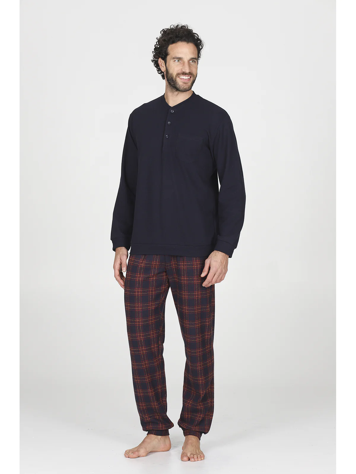 Pigiama da uomo in cotone caldo con collo serafino a 3 bottoni: comodo, morbido e versatile. Modello lungo con fantasia scozzese e giacca in tinta unita. Qualità e comfort firmati Alpina. MODELLO SERAFINO CON POLSINI MAGLIERIA IN FANTASIA SCOZZESE PURO COTONE ANALLERGICO PRATICO ED ELEGANTE PER LA NOTTE E IL GIORNO CALDO E MORBIDO