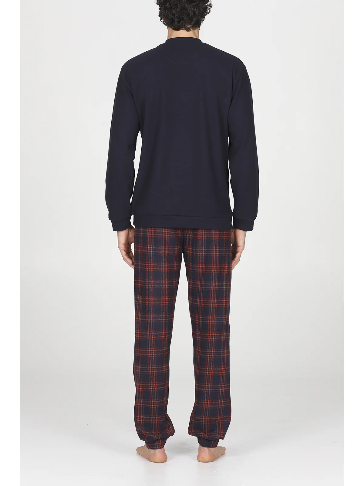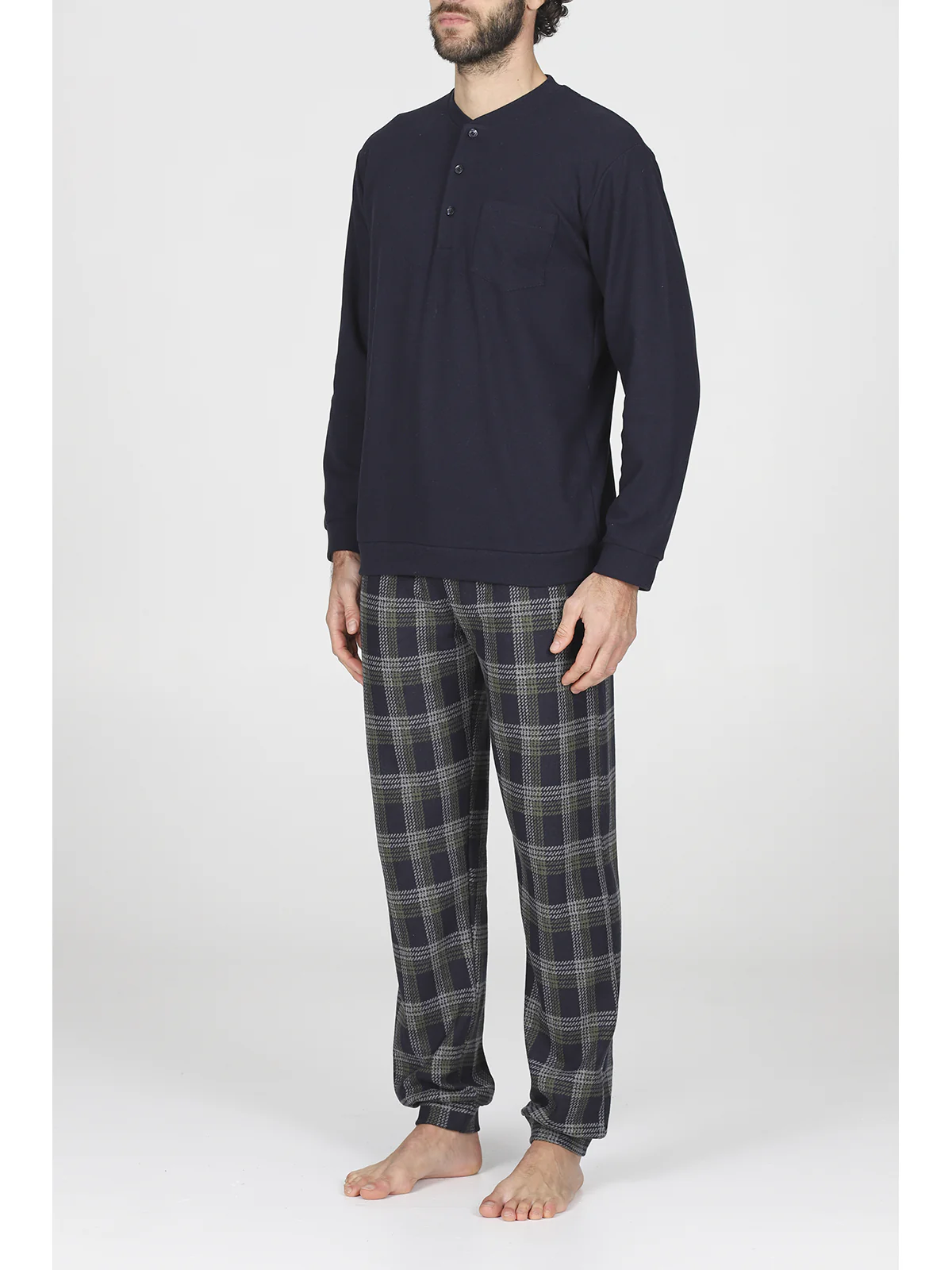 Pigiama da uomo in cotone caldo con collo serafino a 3 bottoni: comodo, morbido e versatile. Modello lungo con fantasia scozzese e giacca in tinta unita. Qualità e comfort firmati Alpina.
