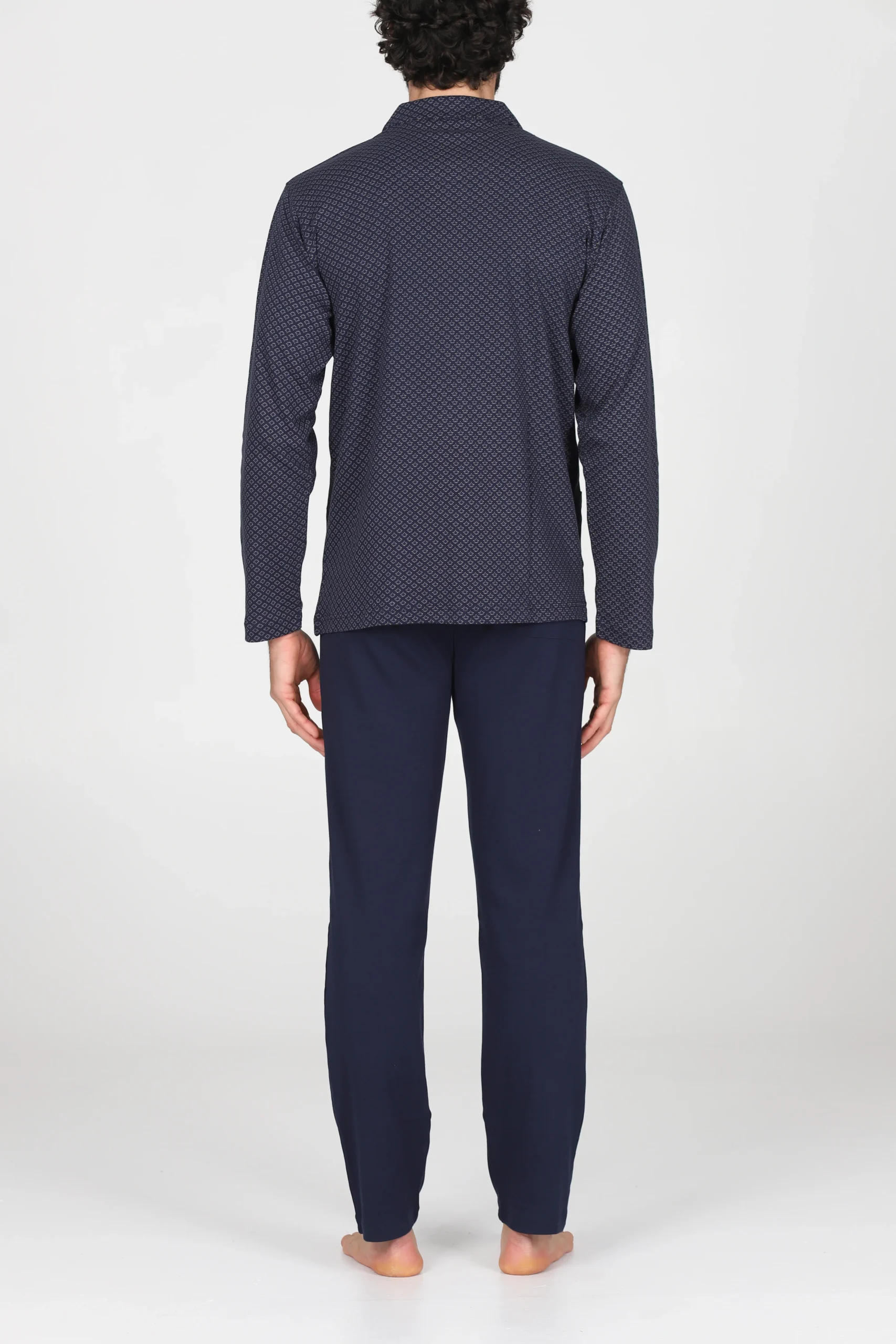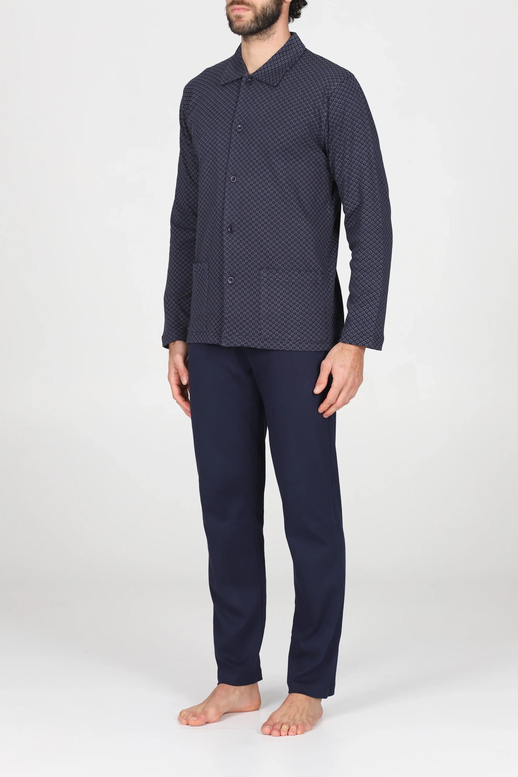Pigiama uomo in interlock 36/1 di puro cotone: naturale, morbido, caldo e confortevole. Modello cardigan con colletto. Giacca in elegante fantasia cravatteria e pantaloni in tinta unita. Adatto alle stagioni più fredde: un must have per l’inverno.