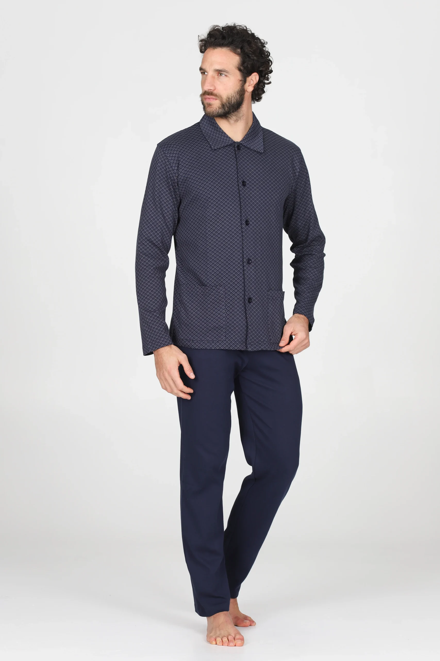 Pigiama uomo in interlock 36/1 di puro cotone: naturale, morbido, caldo e confortevole. Modello cardigan con colletto. Giacca in elegante fantasia cravatteria e pantaloni in tinta unita. Adatto alle stagioni più fredde: un must have per l’inverno. MODELLO CARDIGAN SENZA POLSINI FANTASIA CRAVATTERIA PURO COTONE ANALLERGICO CALDO E CONFORTEVOLE MORBIDO E NATURALE