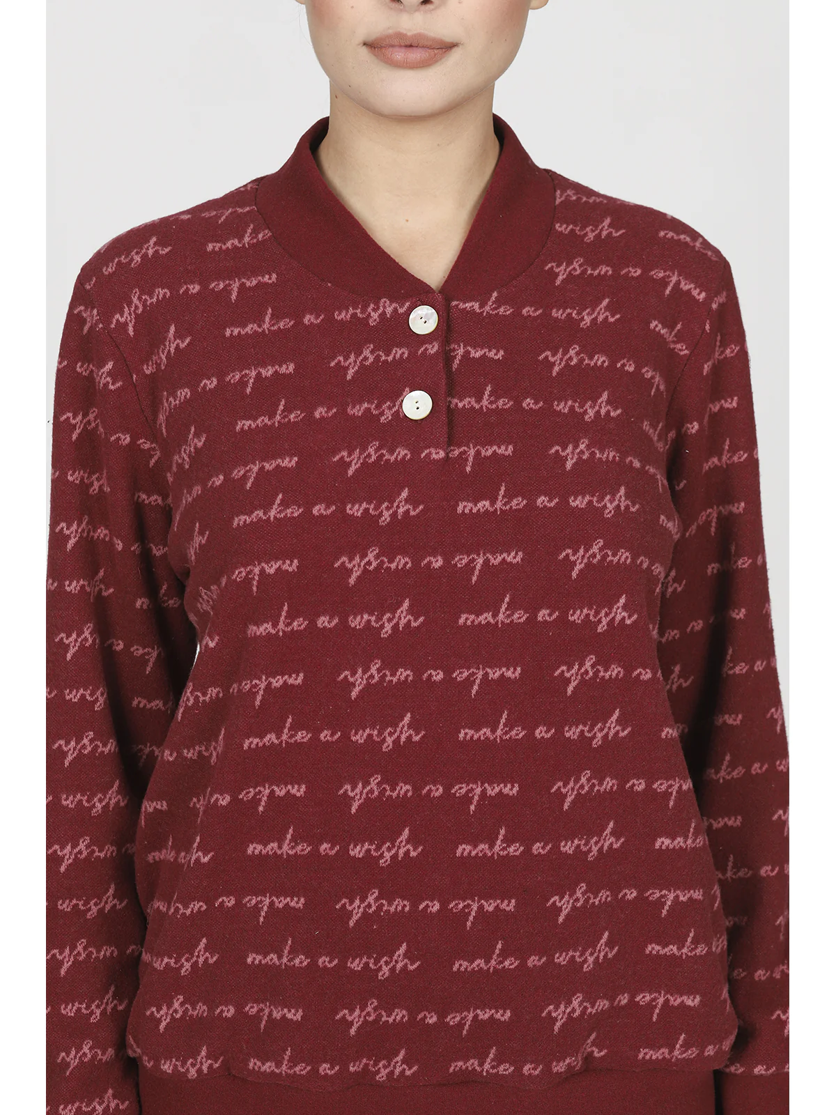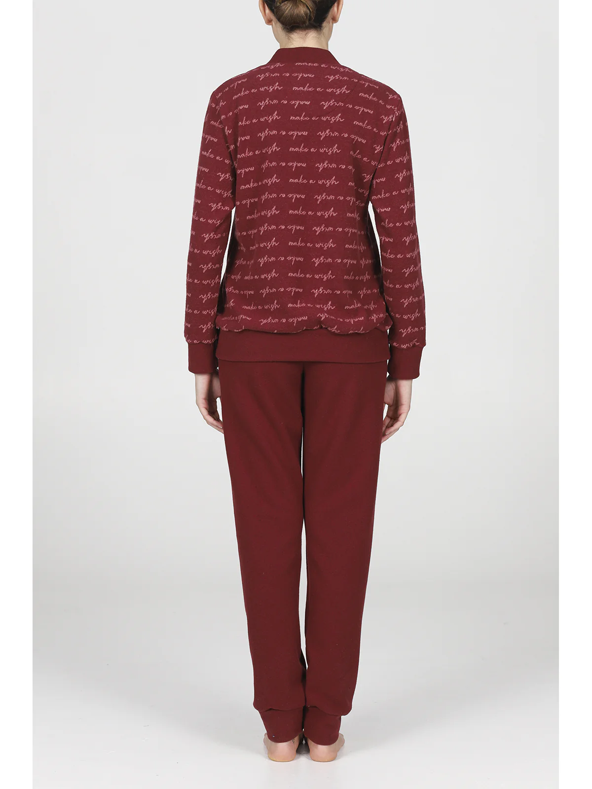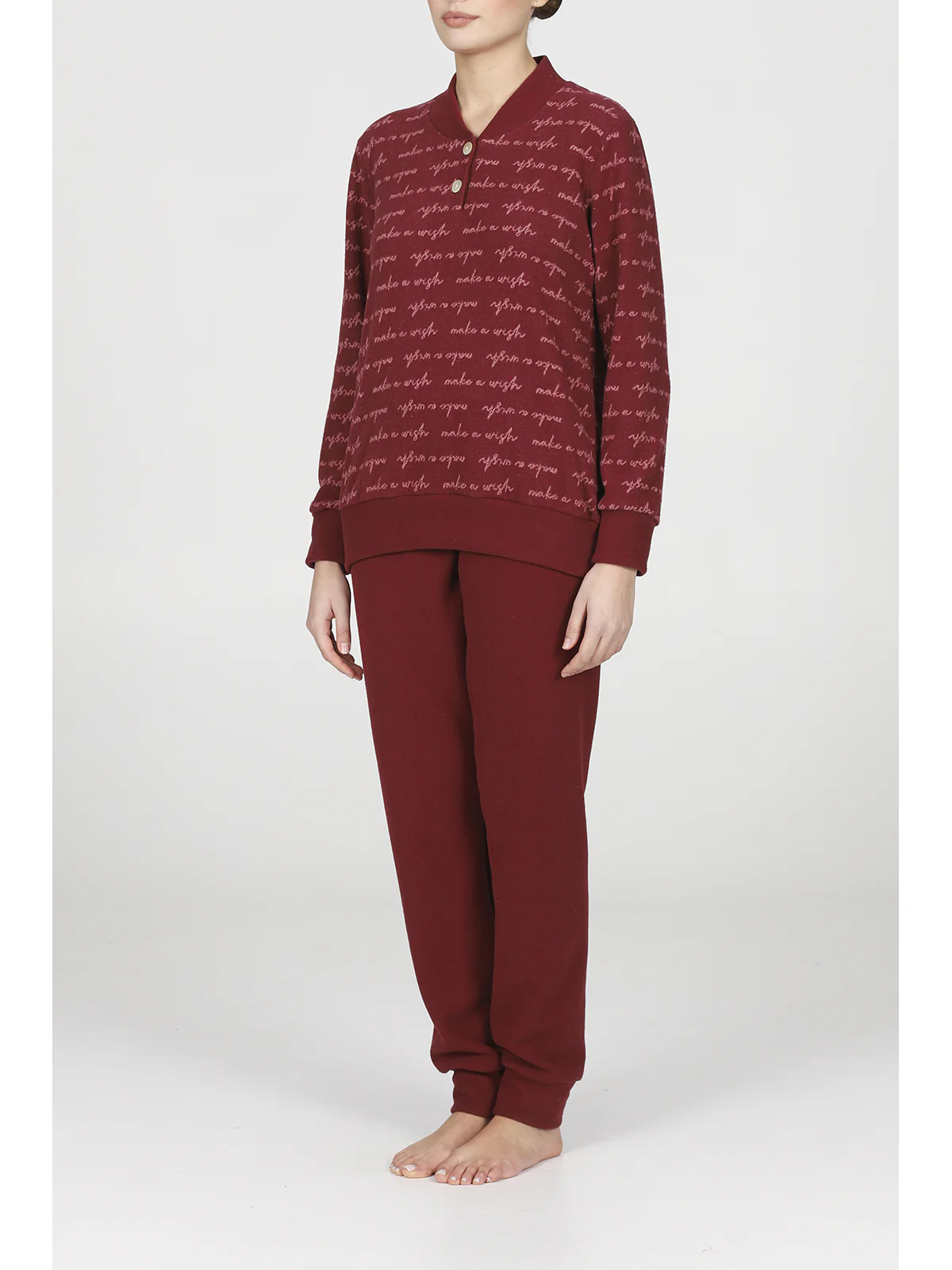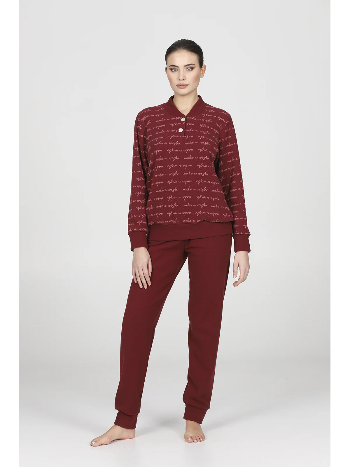 Pigiama donna in jacquard misto cotone: caldo e confortevole, adatto alla notte e allo stare in casa. Romantico disegno jacquard a fantasia scritte,modello serafino con polsini alle maniche, adatto ai freddolosi più esigenti. Pantaloni coordinati in tinta unita. Qualità e tradizione firmata Alpina.