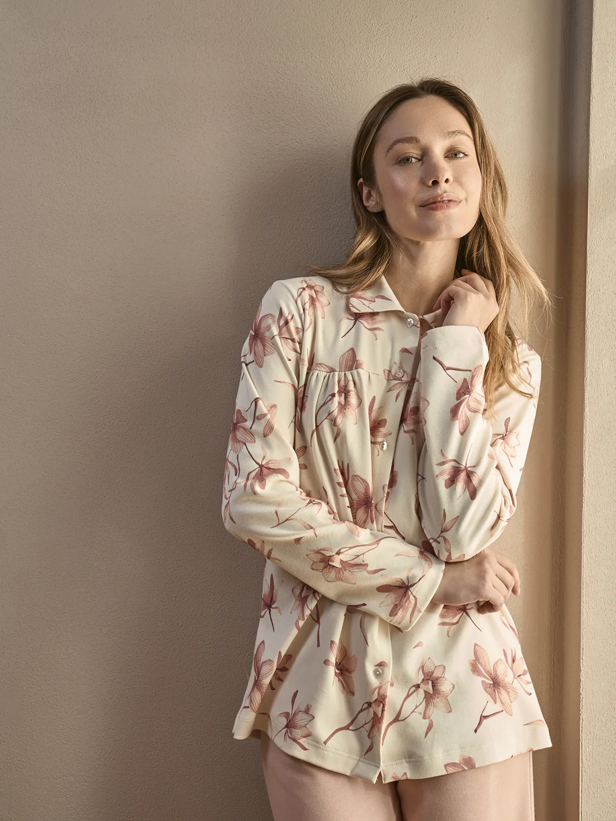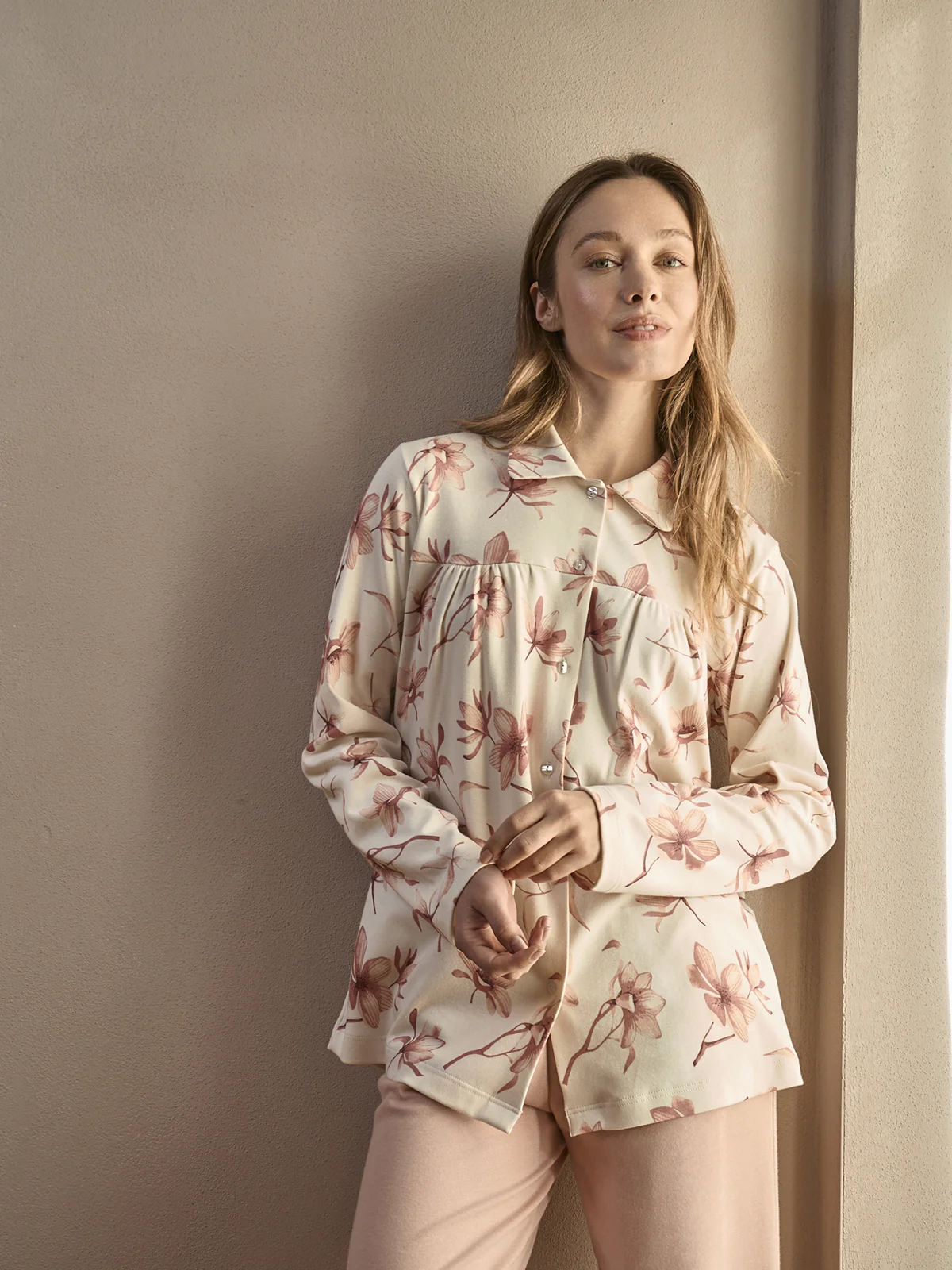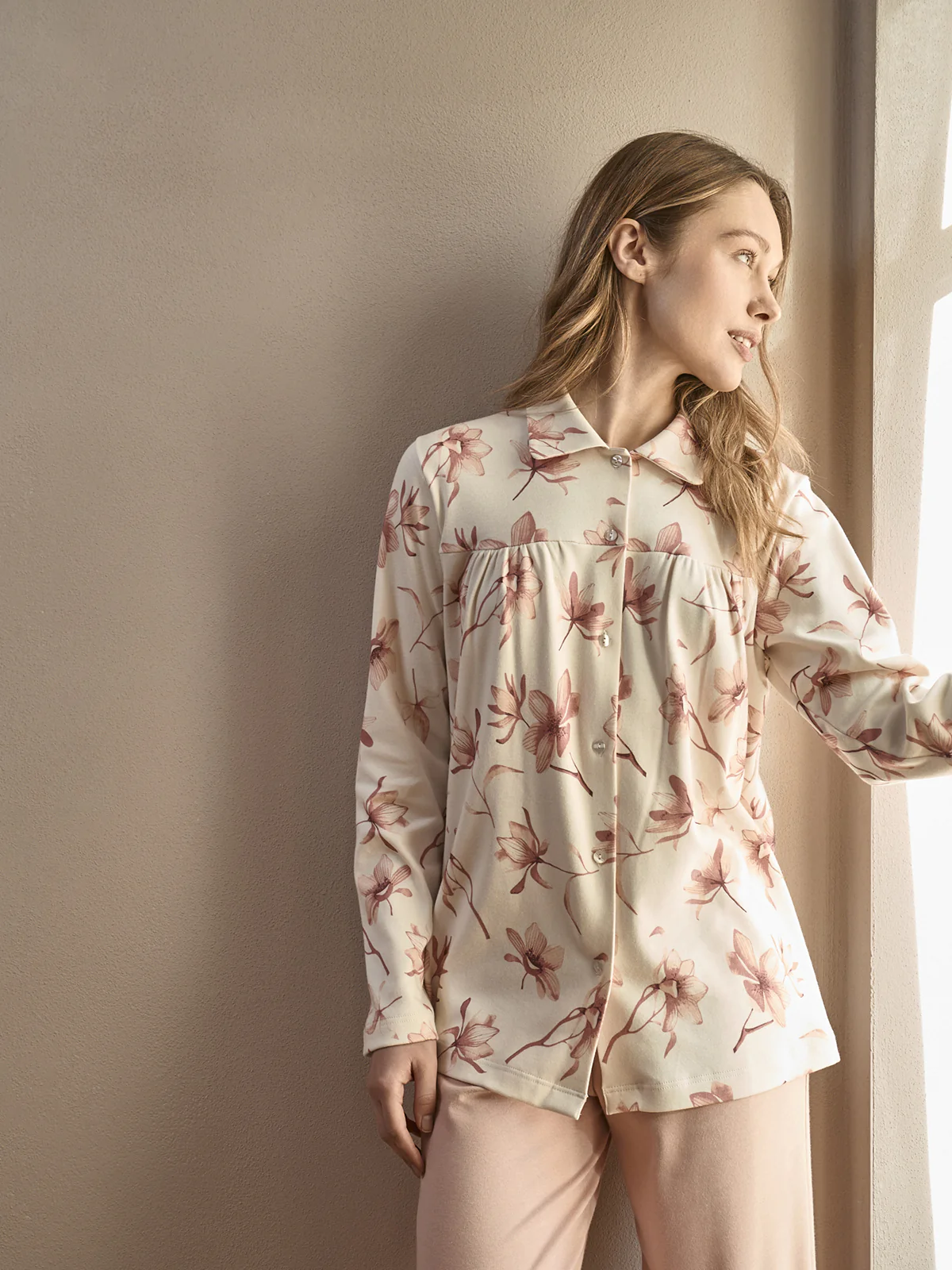 Pigiama donna in interlock 30/1 di puro cotone: caldo e confortevole, adatto alla notte e allo stare in casa. Modello cardigan con colletto. Giacca in tessuto con esclusiva fantasia a tema floreale su fondo panna e pantalone in tinta unita. Ideale per i soggetti più esigenti. Qualità e tradizione firmata Alpina.