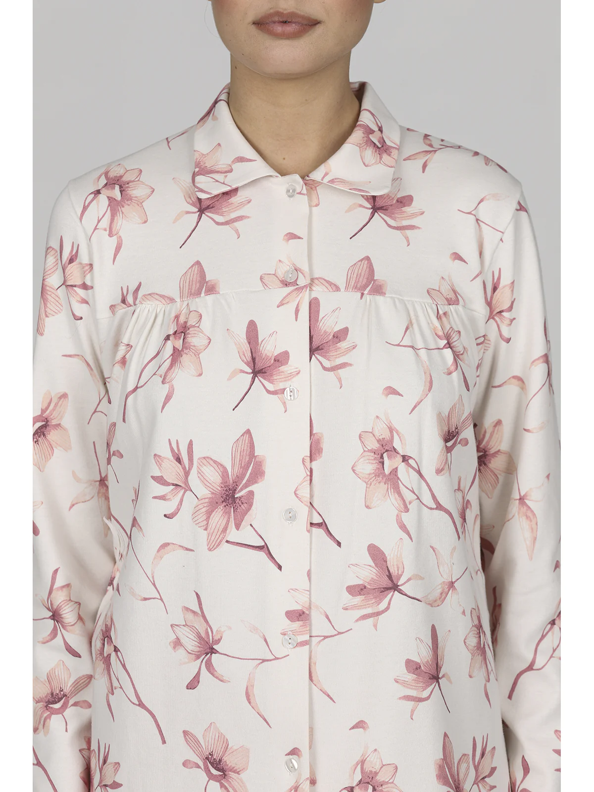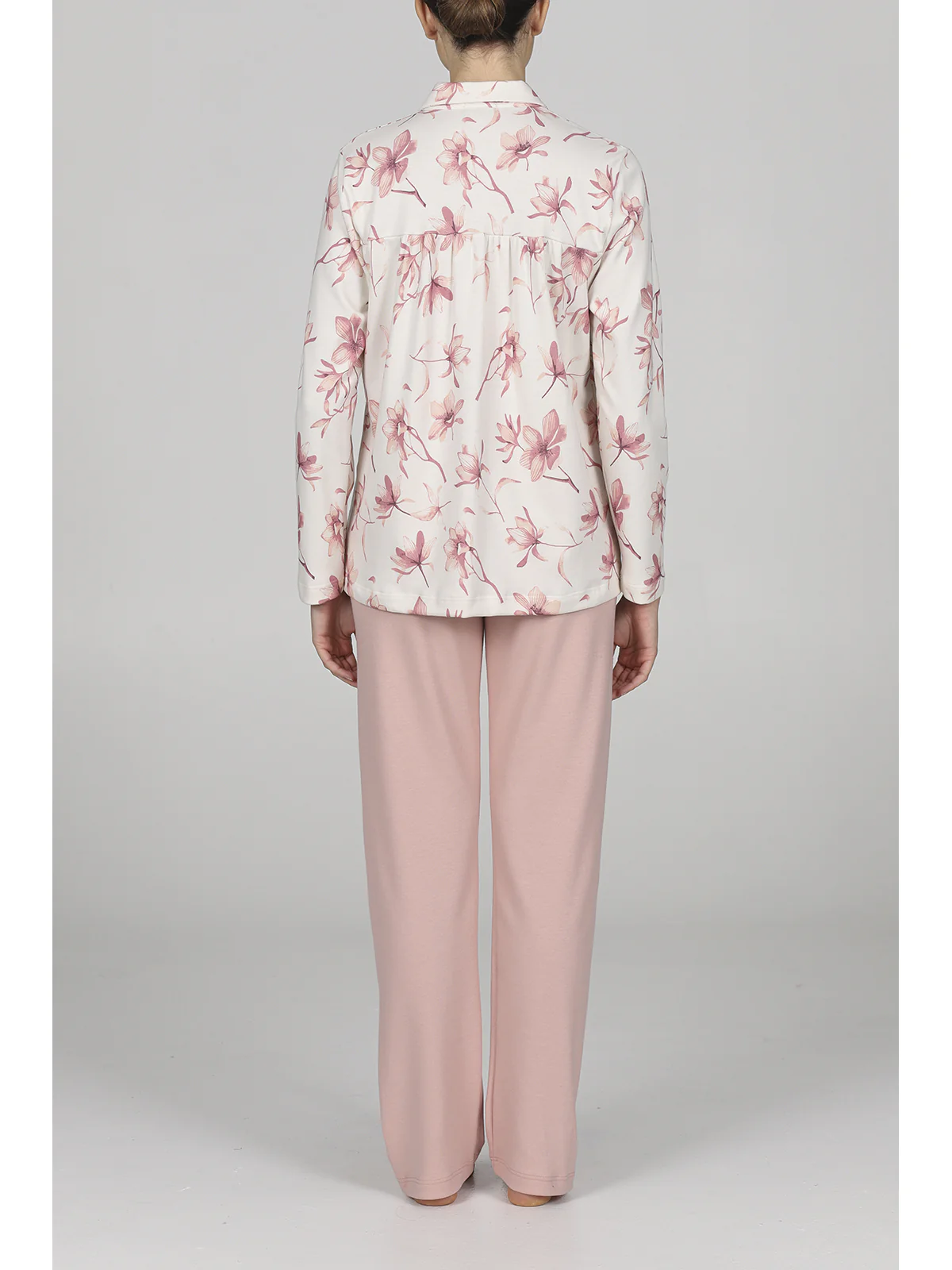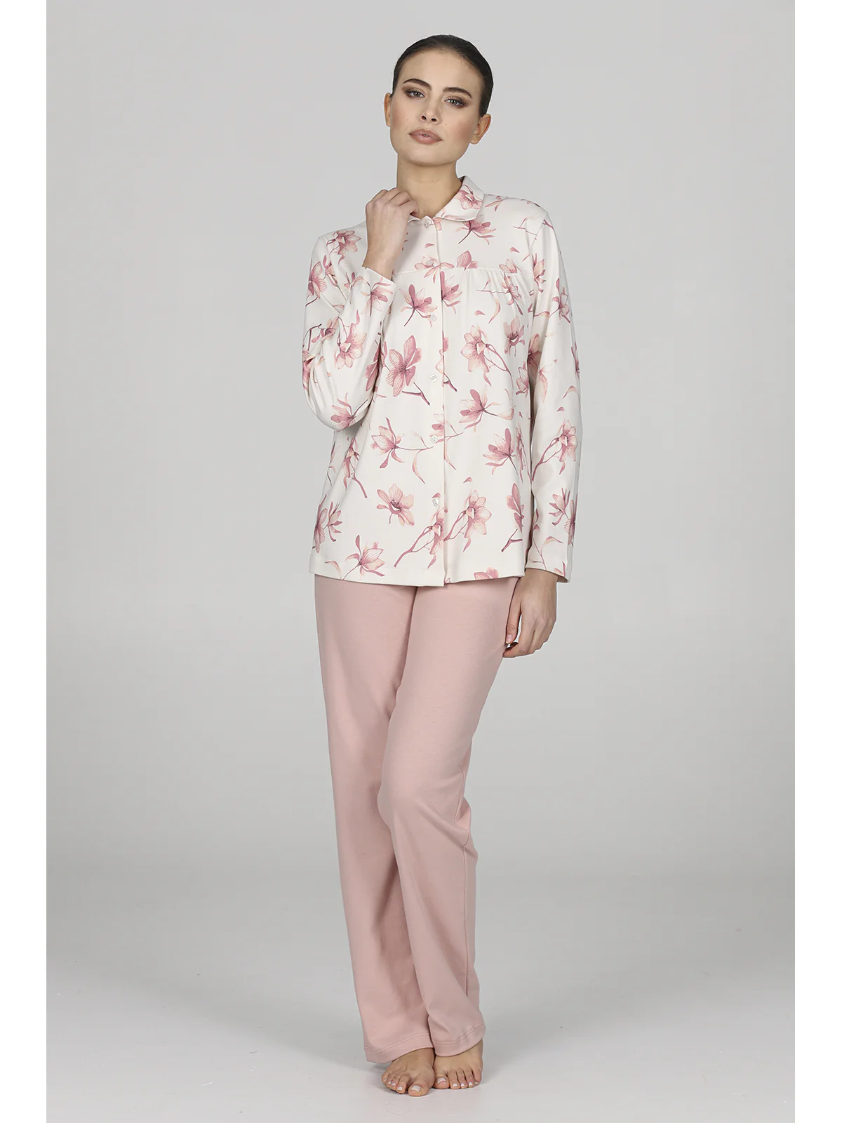 Pigiama donna in interlock 30/1 di puro cotone: caldo e confortevole, adatto alla notte e allo stare in casa. Modello cardigan con colletto. Giacca in tessuto con esclusiva fantasia a tema floreale su fondo panna e pantalone in tinta unita. Ideale per i soggetti più esigenti. Qualità e tradizione firmata Alpina.