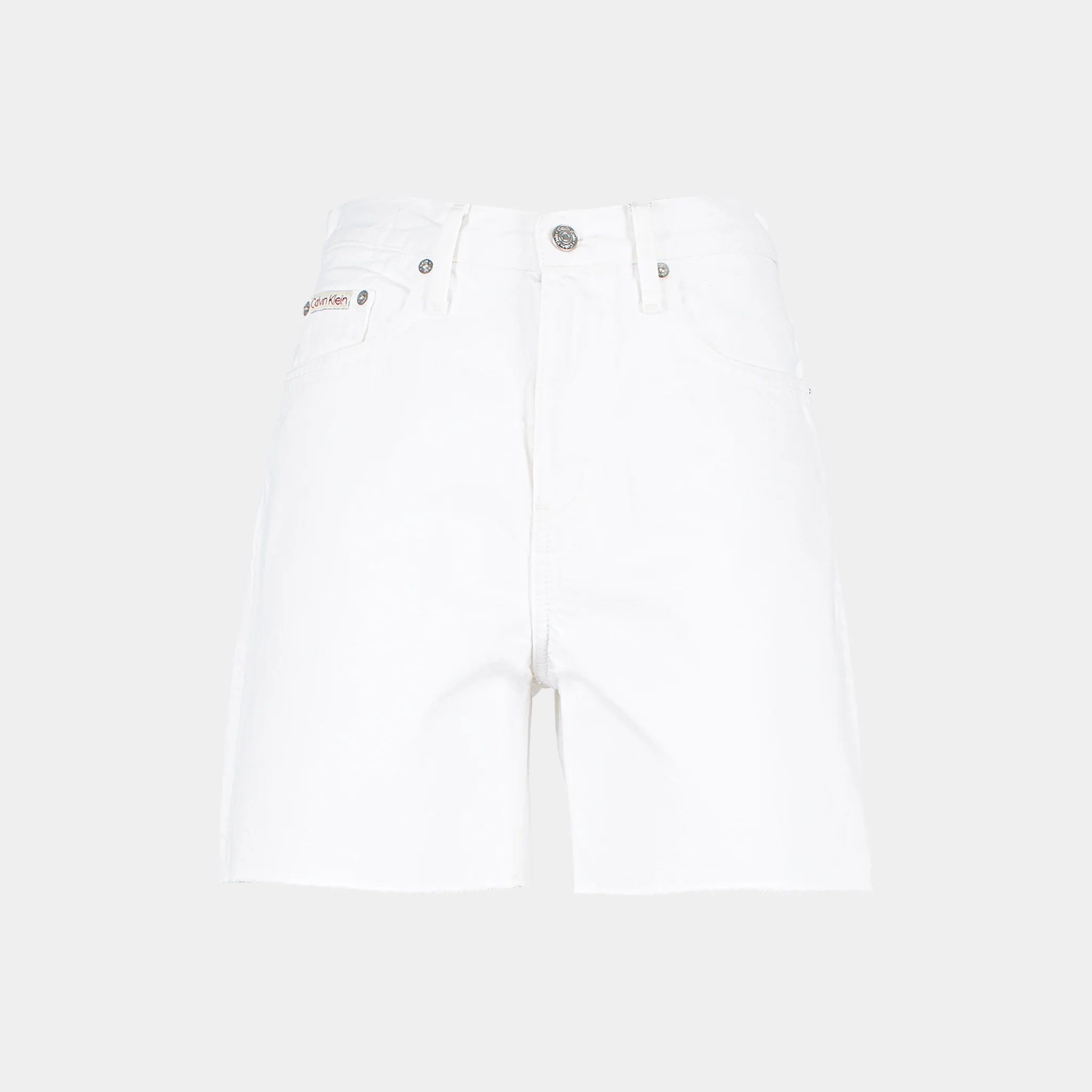 Denim di cotone rigidoTaglio relaxedVita da media a altaOrlo tagliatoPatta con cernieraModello cinque tascheClean wash biancoRivetti con logo Calvin Klein ed etichetta in pelle100% cotone J20J2252011AA