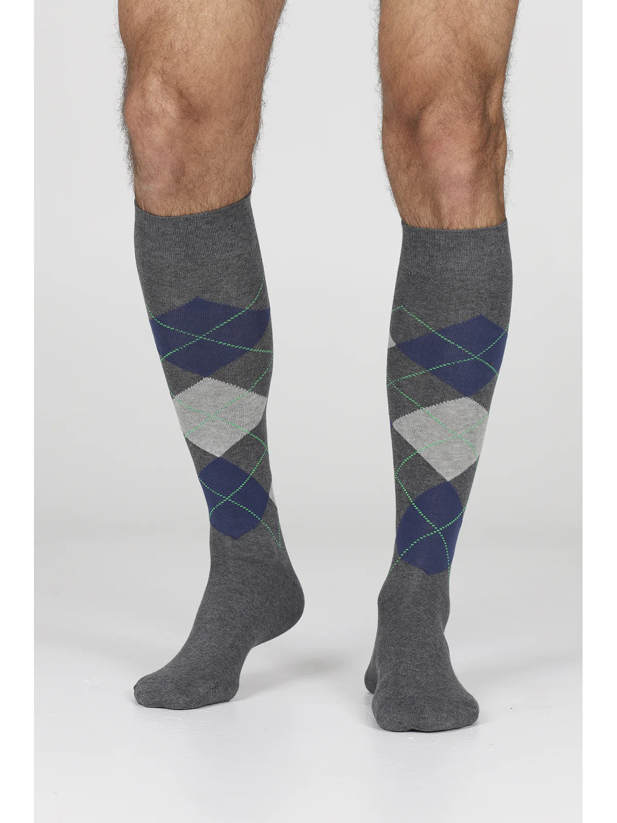 Calza uomo lunga in caldo cotone, morbida e calda, l’ideale per affrontare la giornata con il piede giusto! DISEGNO JACQUARD A LOSANGHE LUNGHEZZA SOTTO IL GINOCCHIO SULLA TUA PELLE SOLO COMFORT E NATURALEZZA MORBIDE E TRASPIRANTI
