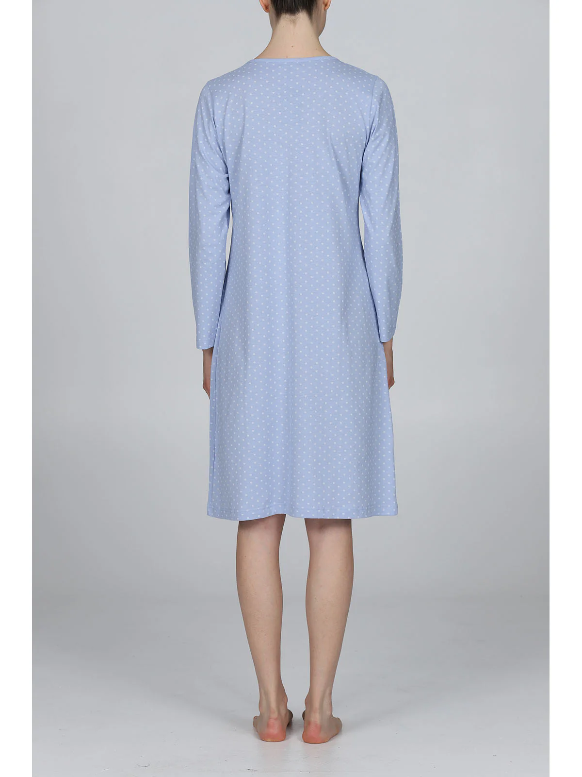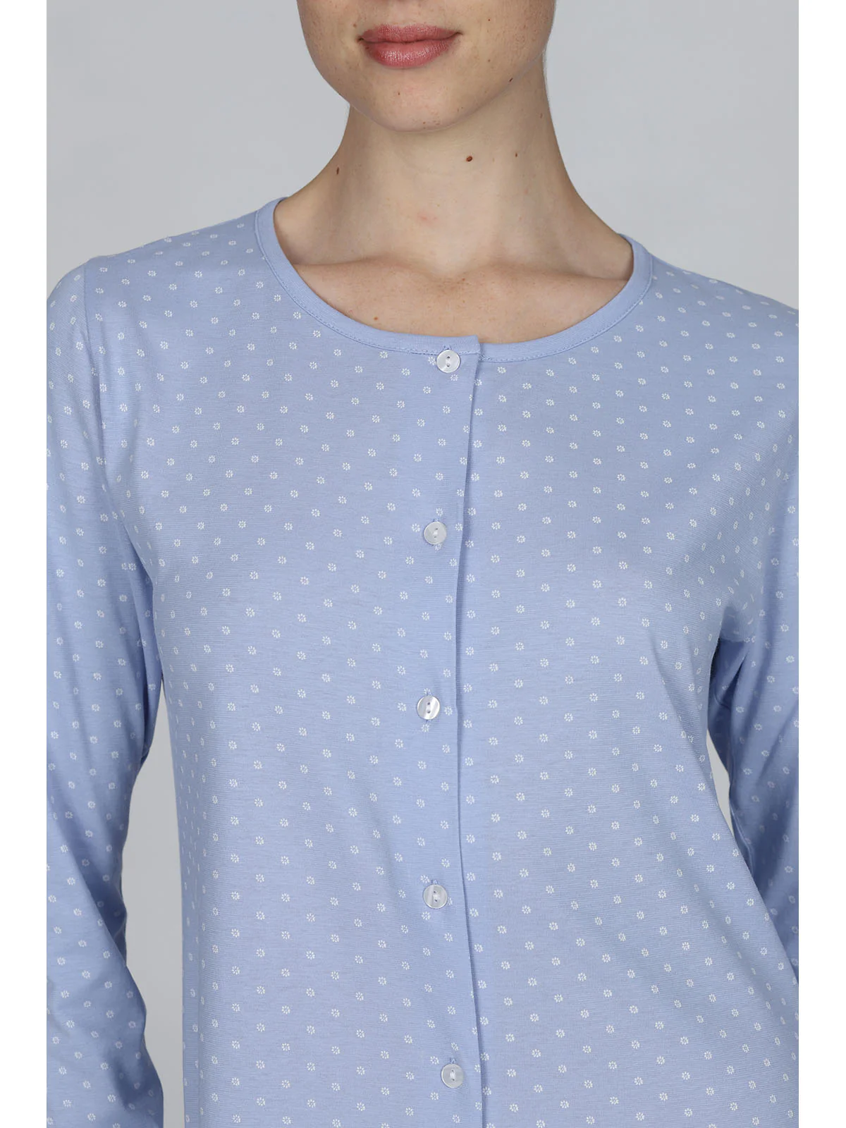 Camicia da notte donna in fresco jersey 36/1 di puro cotone pettinato. Maglia a manica corta, modello con bottoncini interamente apribile in deliziosa fantasia bollicine. Comfort moderno per una femminilità classica firmata Alpina. INTERAMENTE APRIBILE LUNGHEZZA 100CM. RAFFINATA FANTASIA BOLLICINA VESTIBILITA’ CLASSICA PRATICO E CONFORTEVOLE MORBIDO E NATURALE PURO COTONE TRASPIRANTE