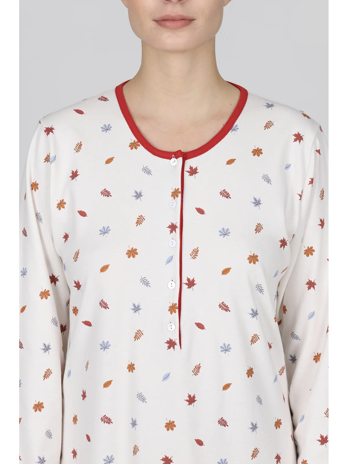 Camicia da notte donna in interlock 36/1 di puro cotone: caldo e confortevole, adatto alla notte e allo stare in casa. Modello con scollo serafino. Lunghezza cm.100. Tessuto con esclusiva fantasia a tema foglie in autunno nei toni dell’arancio. Ideale per i soggetti più esigenti. Qualità e tradizione firmata Alpina.