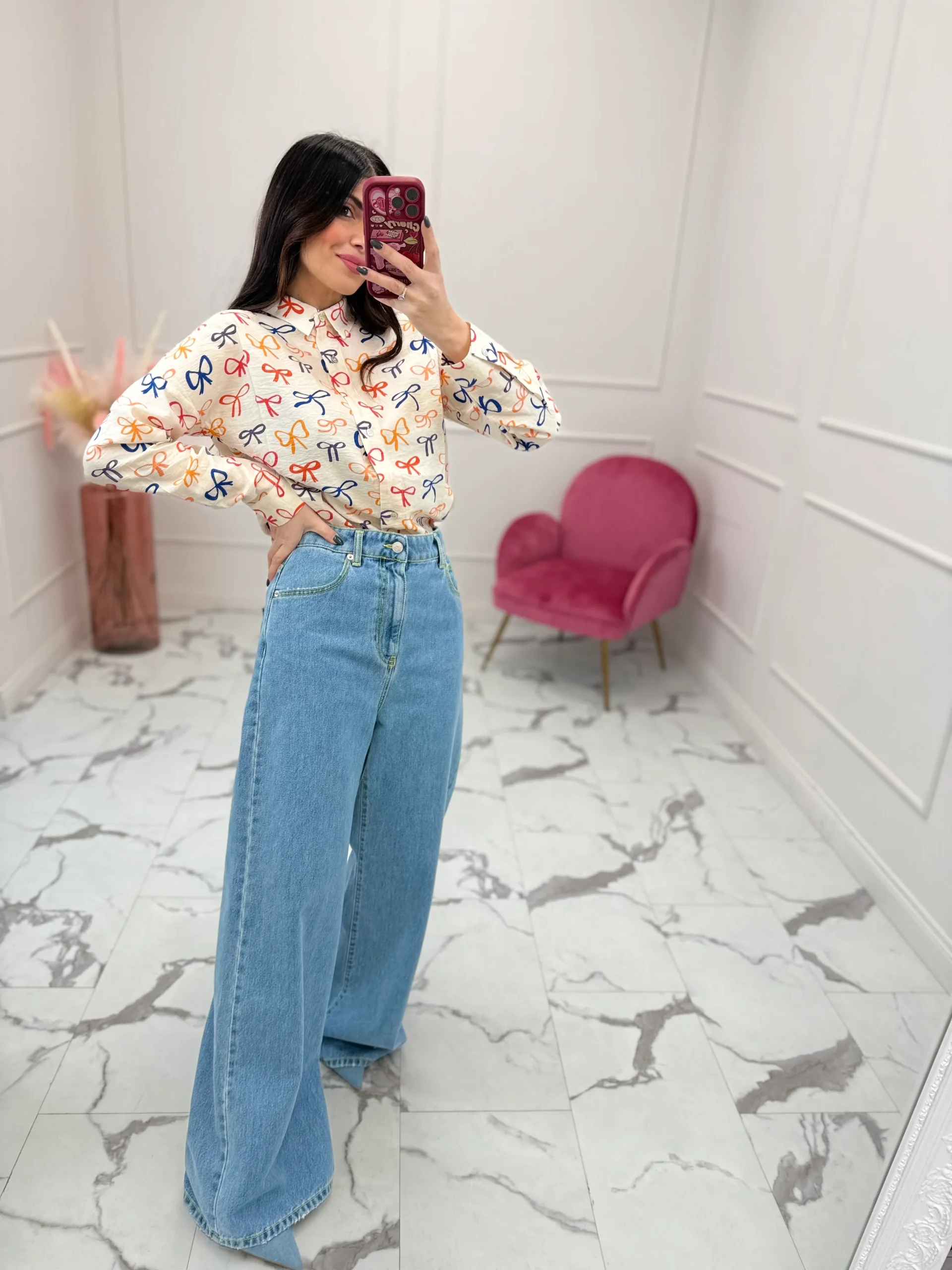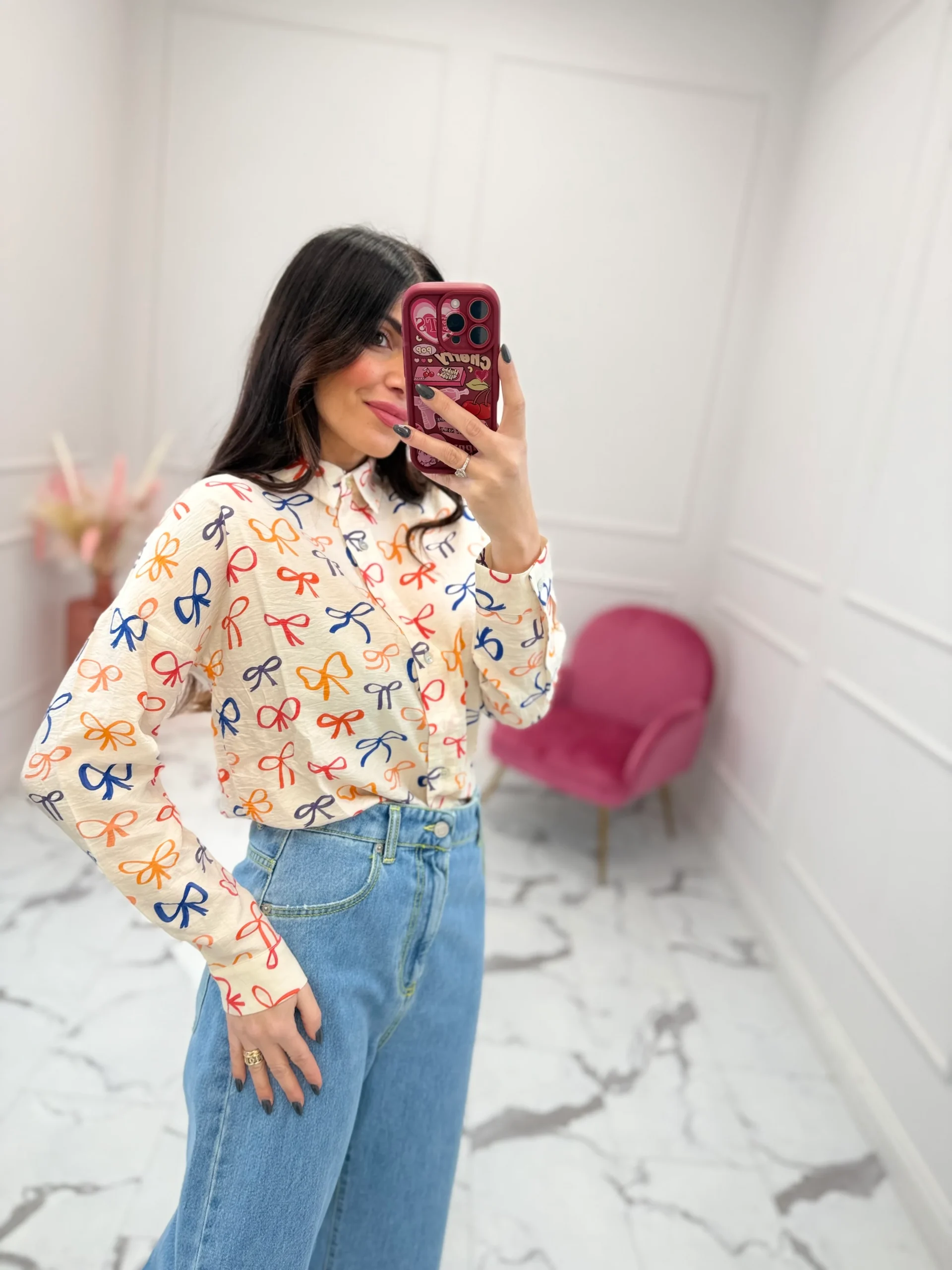 Camicia in fantasia fiocchi all over, spalla scesa, chiusura con abbottonatura sul davanti, vestibilità regolare. La modella indossa taglia XS.