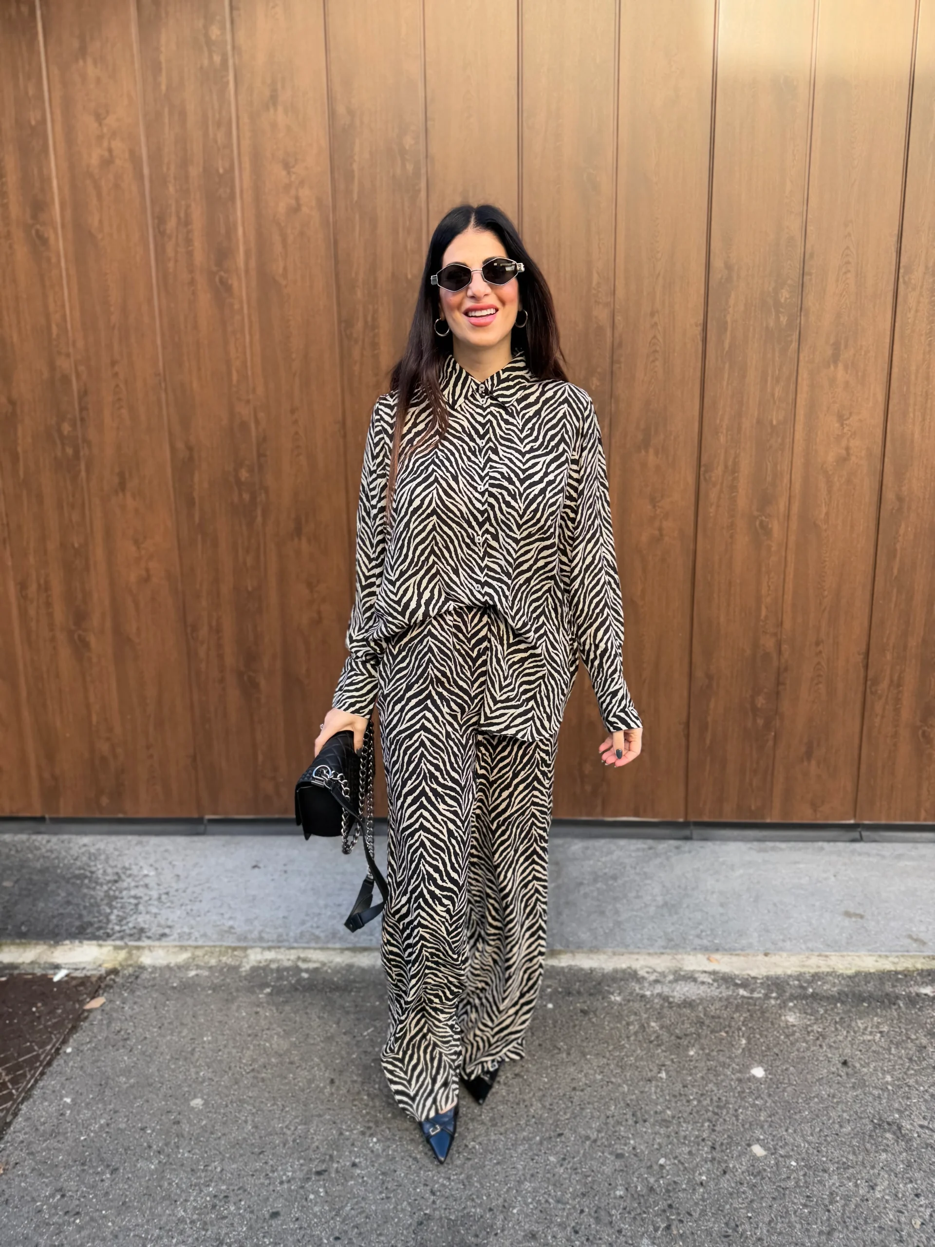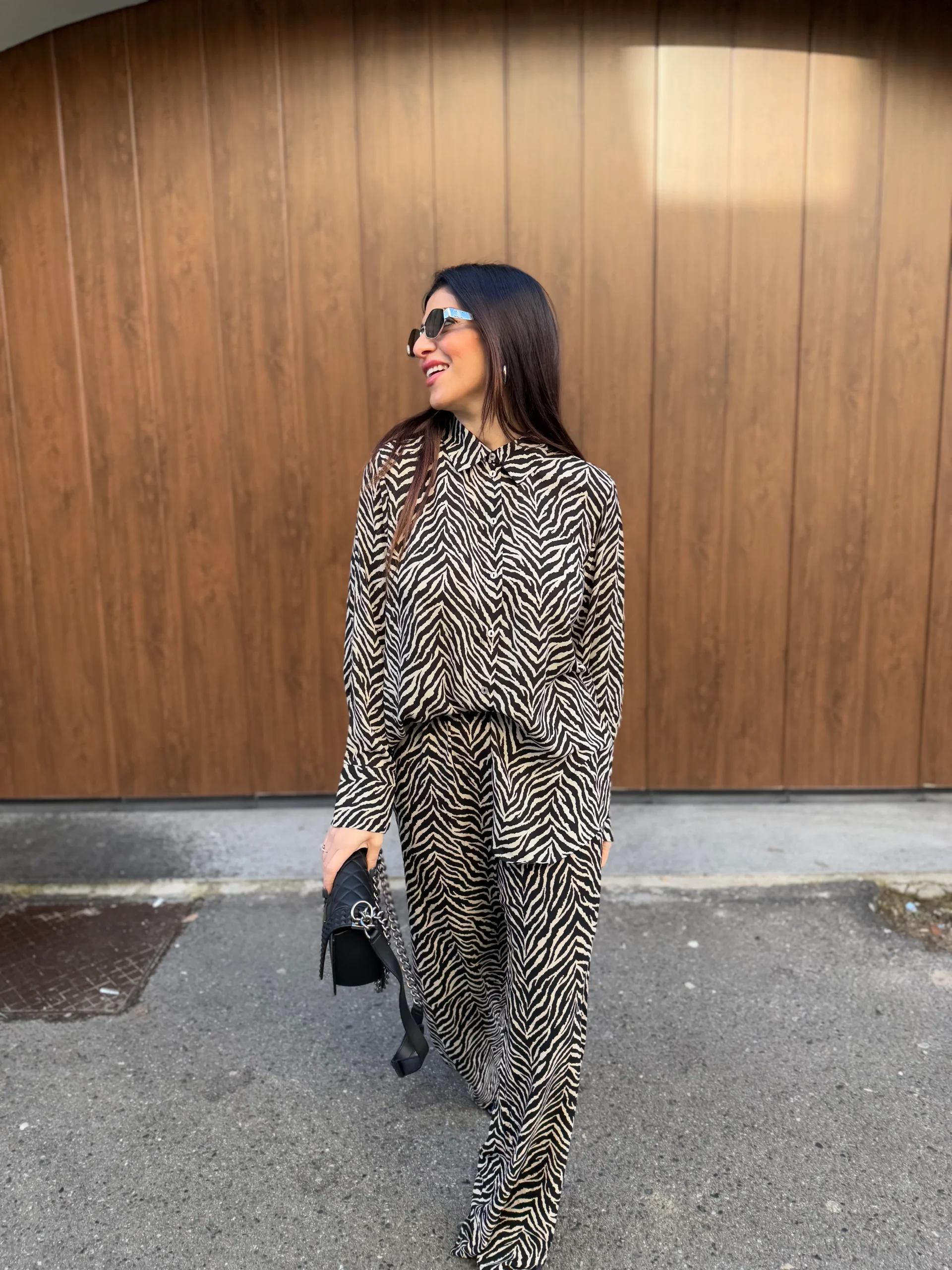 Camicia in fantasia zebrata, tessuto leggero, chiusura con abbottonatura sul davanti, maxi polsino con bottone, vestibilità regolare. La modella indossa taglia XS.