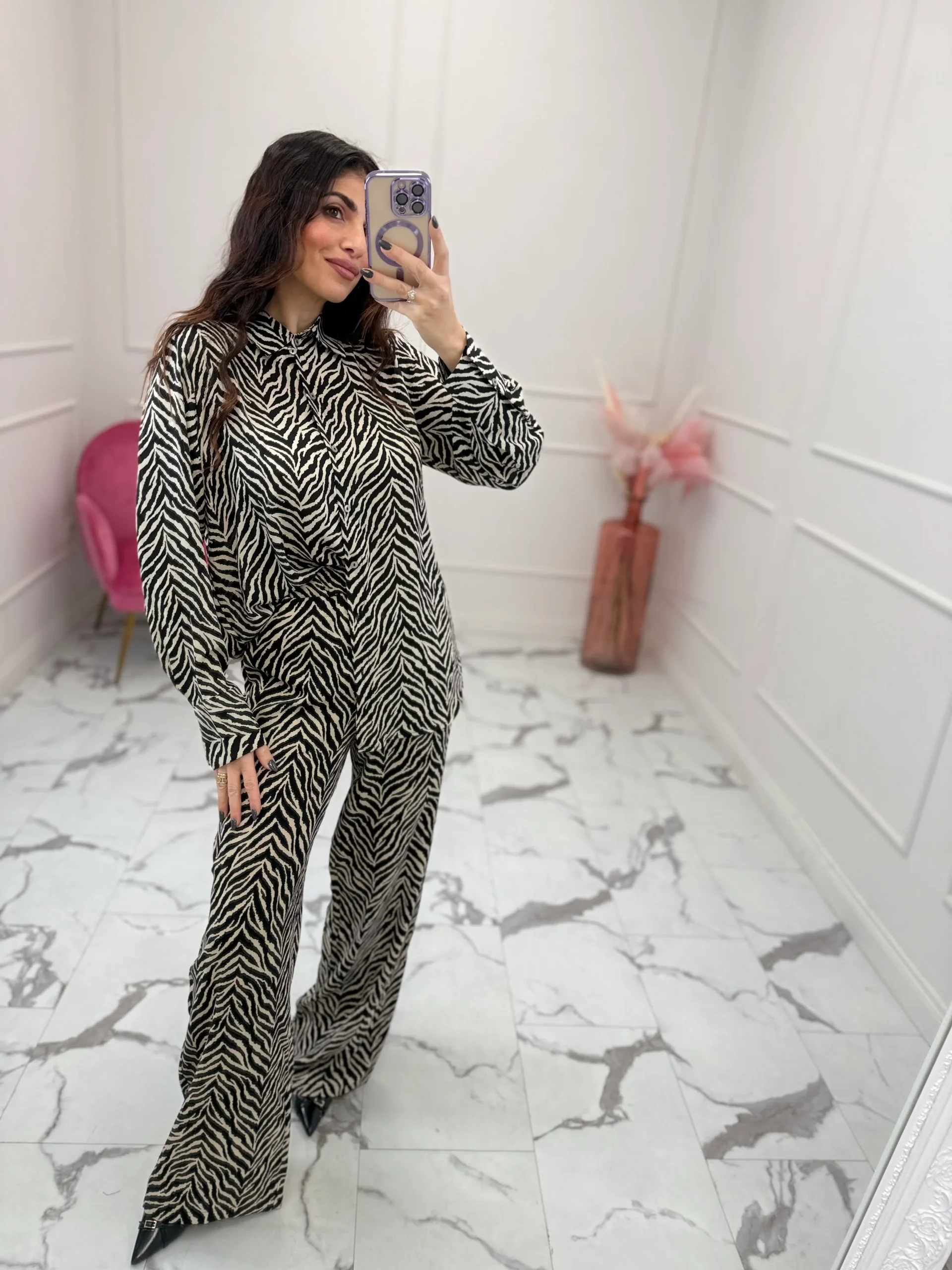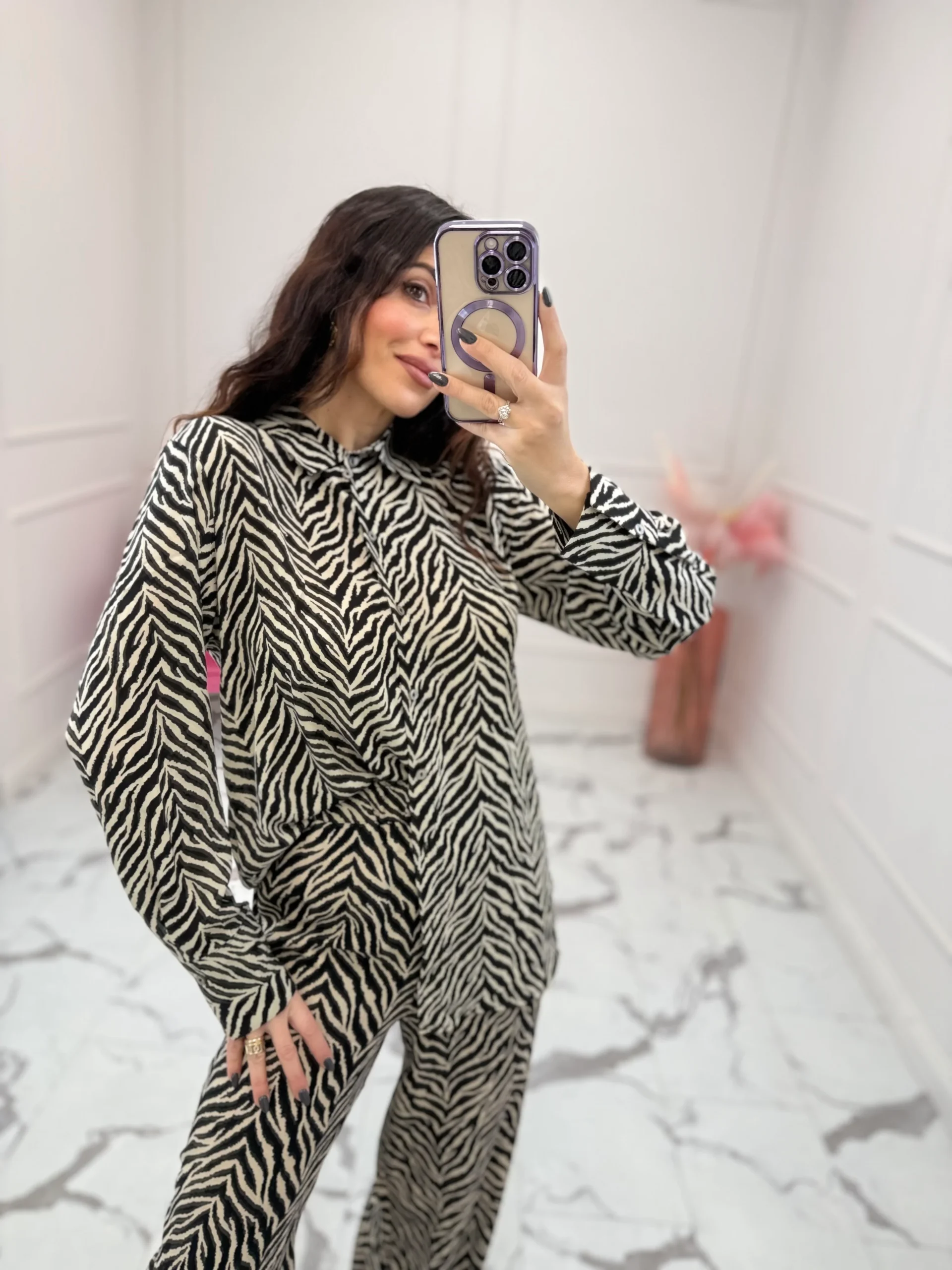 Camicia in fantasia zebrata, tessuto leggero, chiusura con abbottonatura sul davanti, maxi polsino con bottone, vestibilità regolare. La modella indossa taglia XS. composizione: 100% poliestere