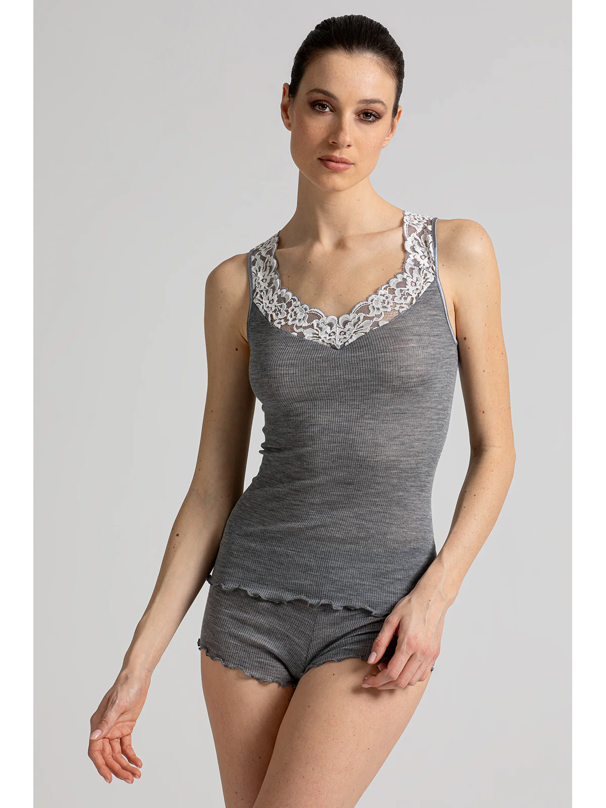 Canotta intima donna in pregiata e morbida lana e seta, modello con spallina largae scollo a V in esclusivo pizzo bicolore. Comfort raffinato, durevole e ineguagliabile. La seta conferisce leggerezza e traspirabilità, la lana il calore. Qualità e tradizione a marchio Alpina.