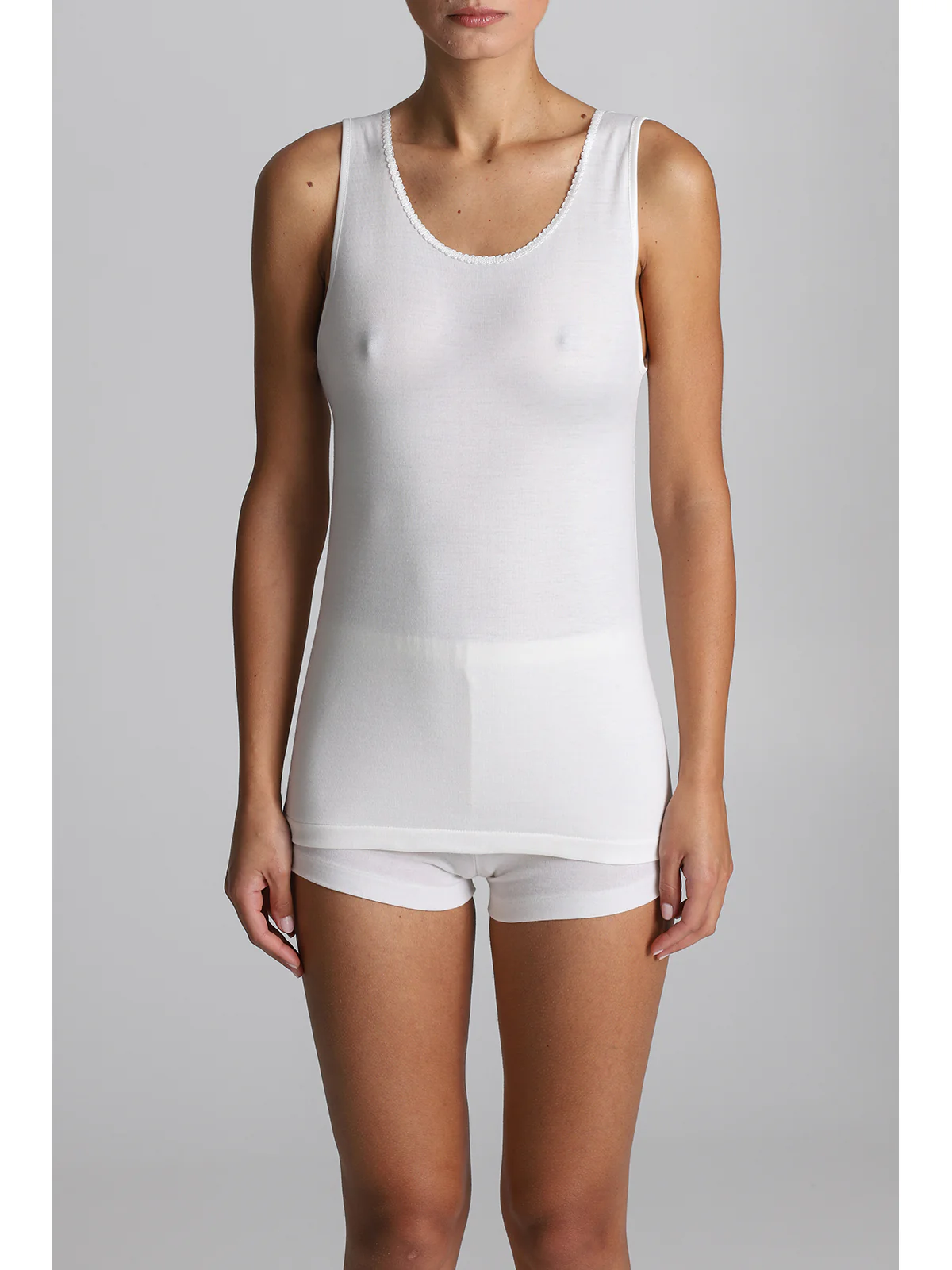 Canotta intima donna modello spallina larga in costina double di lana e cotone: calda lana fuori e morbido cotone sulla pelle. Elegante scollo con pizzo basso per una femminilità discreta.
