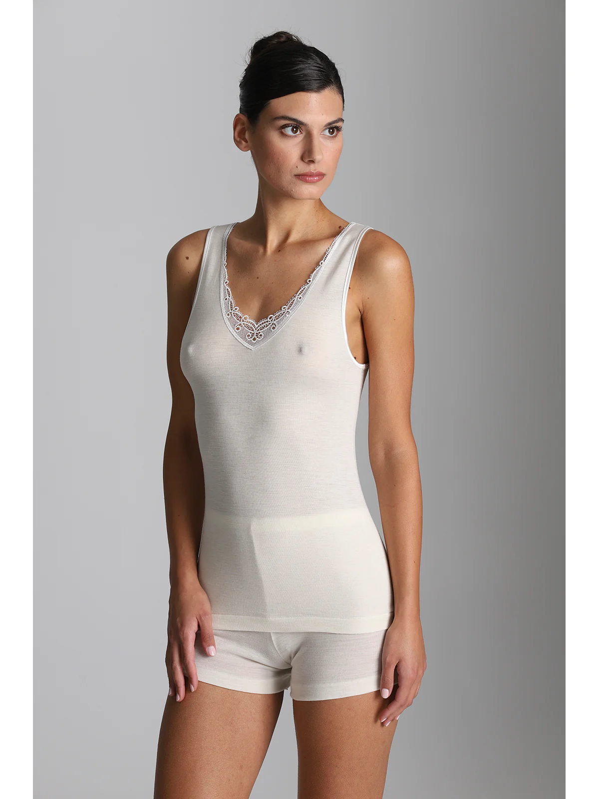 Canotta intima donna modello spallina larga in costina di lana e seta per un massimo comfort e calore. Tutto il tepore della lana senza rinunciare alla lucentezza della seta. Sulla tua pelle solo fibre naturali.