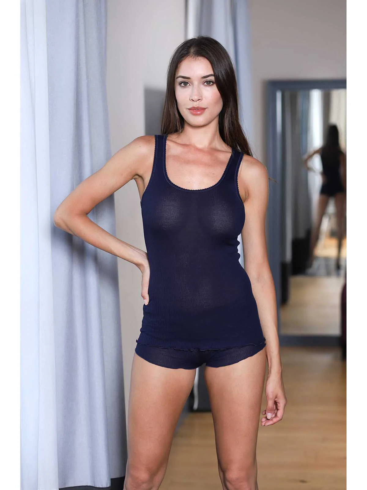 Canotta donna modello spallina stretta in filoscozia® di alta qualità Certificata. Morbido e piacevole al tatto, è uno dei tessuti più adatti ai soggetti allergici. Lucentezza, durata nel tempo e purezza delle fibre con proprietà antibatteriche, sono le sue migliori qualità.