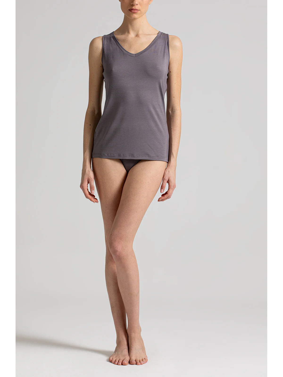 Canottiera donna a spallina larga con scollo a V in morbidissimo micromodal elasticizzato. Qualità e tradizione a marchio Alpina.