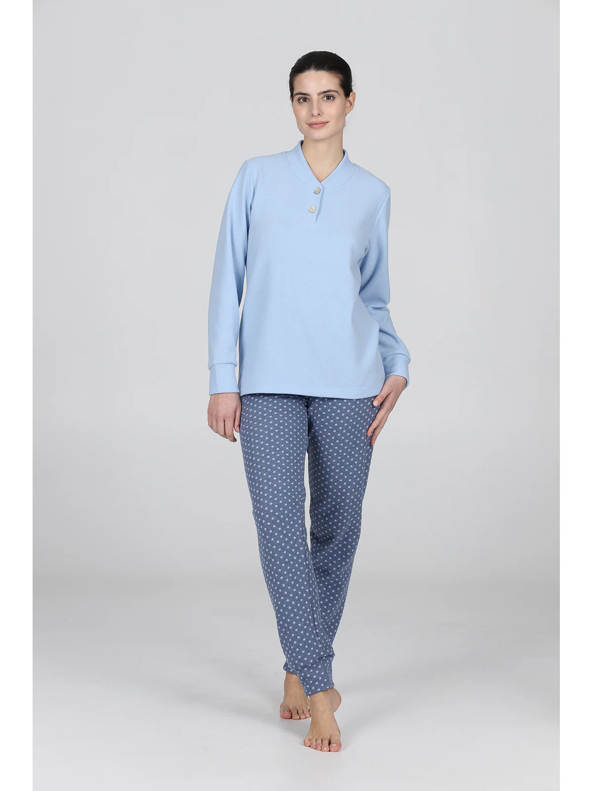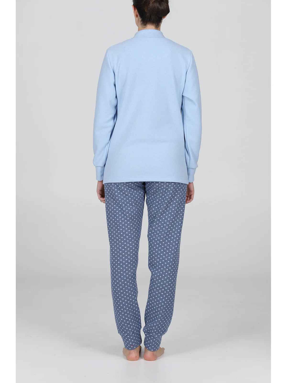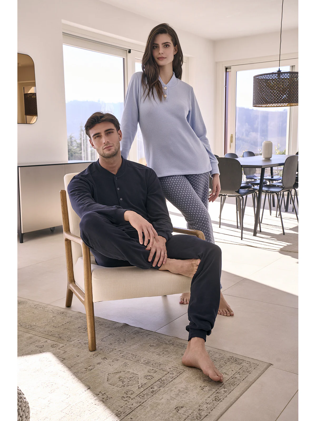 Pigiama donna in jacquard misto cotone: caldo e confortevole, adatto alla notte e allo stare in casa. Modello lungo serafino con esclusivo bordo collo. Giacca in tinta unita e pantaloni in deliziosa fantasia pois con bordi. Ideale per i soggetti più freddolosi. Qualità e tradizione firmata Alpina.