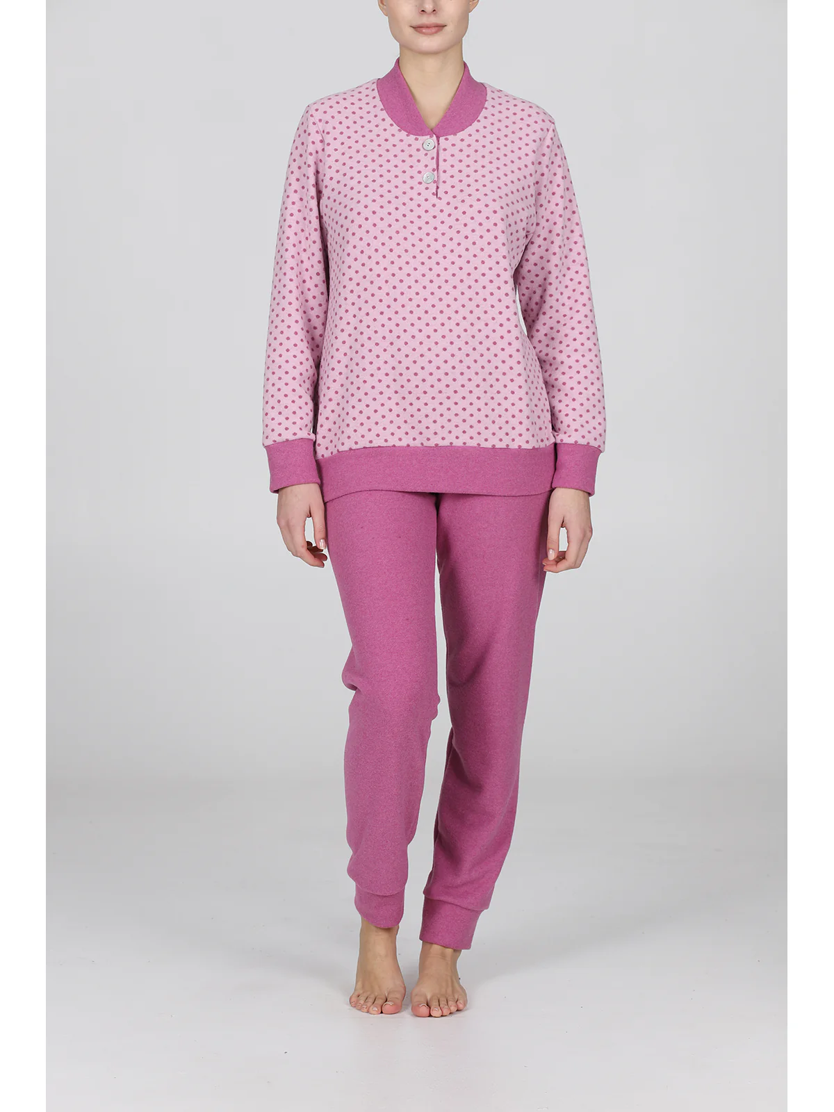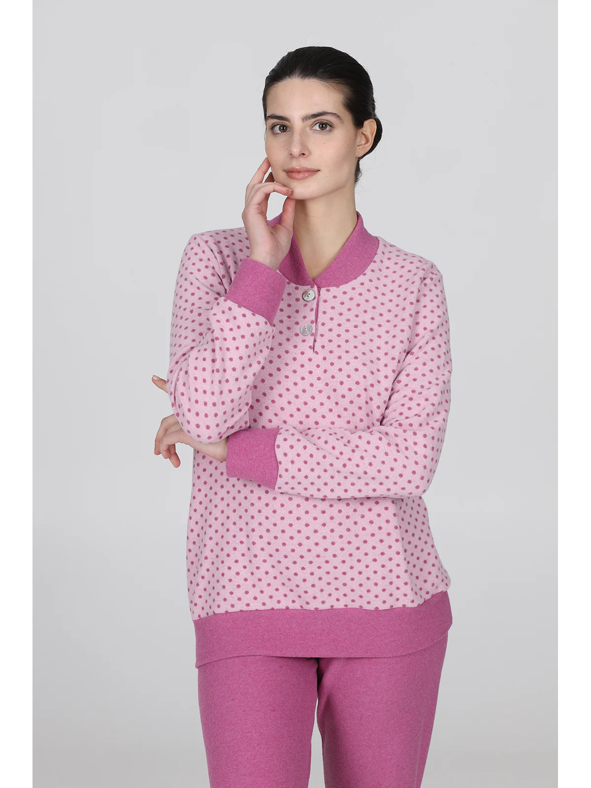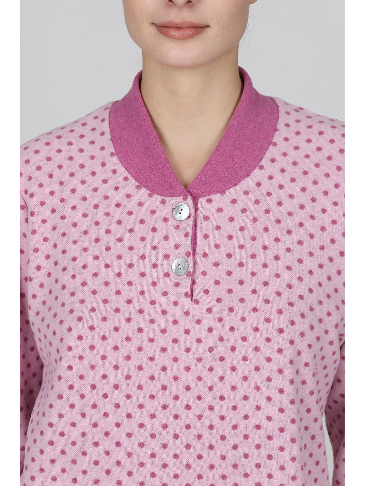 Pigiama donna in jacquard misto cotone: caldo e confortevole, adatto alla notte e allo stare in casa. Modello lungo serafino con esclusivo bordo collo in colore a contrasto. Giacca in deliziosa fantasia pois, colletto e pantaloni in tinta unita con bordi. Ideale per i soggetti più freddolosi. Qualità e tradizione firmata Alpina.