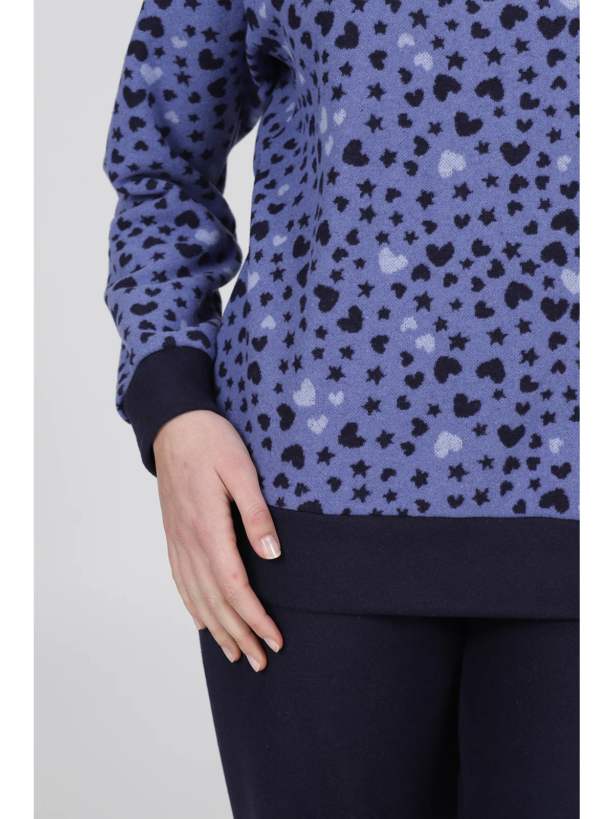 Pigiama donna in jacquard misto cotone: caldo e confortevole, adatto alla notte e allo stare in casa. Modello lungo serafino con esclusivo bordo collo in colore a contrasto. Giacca in fantasia cuoricini, colletto e pantaloni in tinta unita con bordi. Ideale per i soggetti più freddolosi. Qualità e tradizione firmata Alpina.