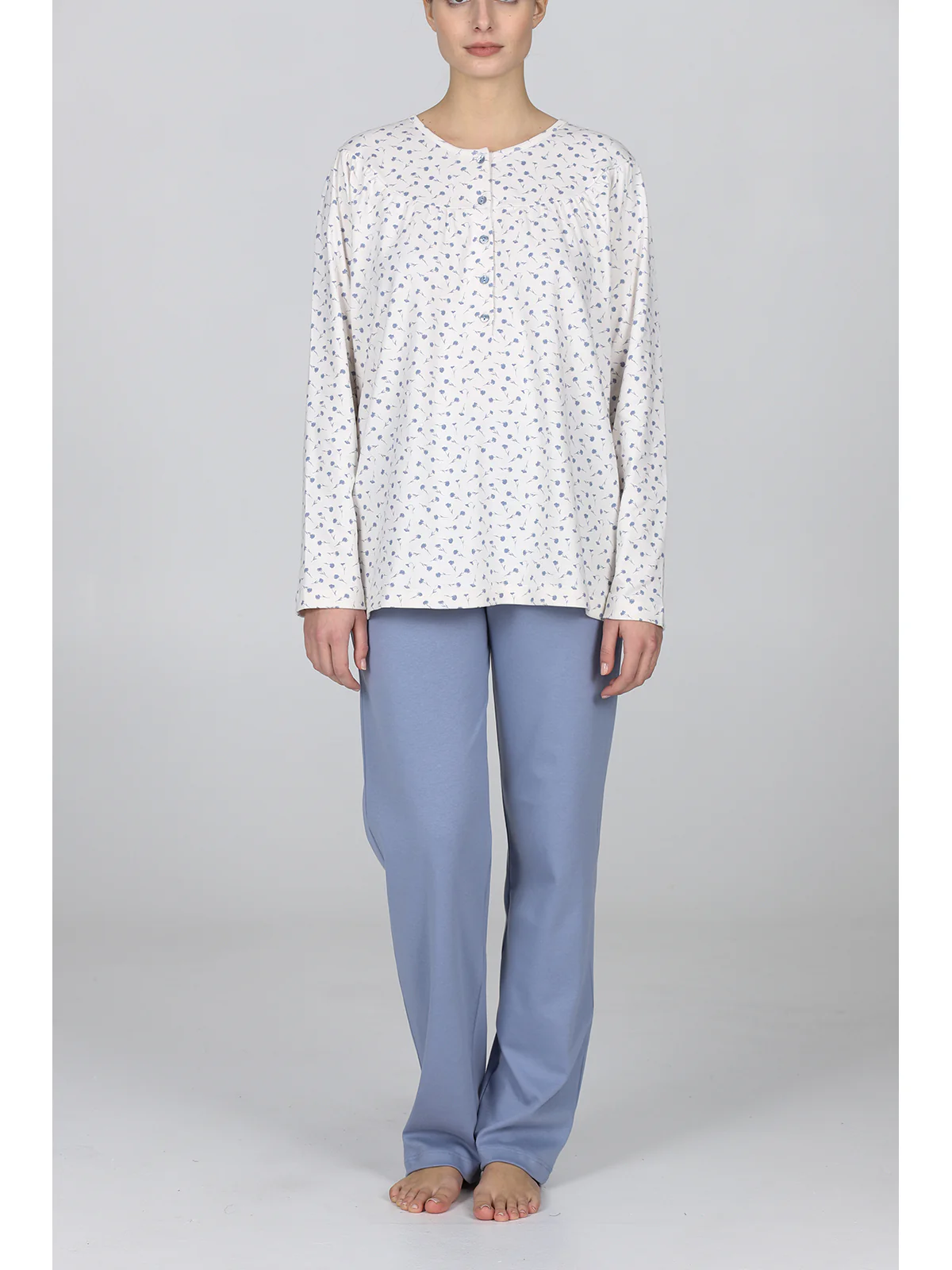 Pigiama donna in interlock 36/1 di puro cotone: caldo e confortevole, adatto alla notte e allo stare in casa. Modello lungo serafino con giacca in esclusiva stampa fiorellini abbinata a morbidi pantaloni in tinta unita. Ideale per i soggetti più esigenti. Qualità e tradizione firmata Alpina.