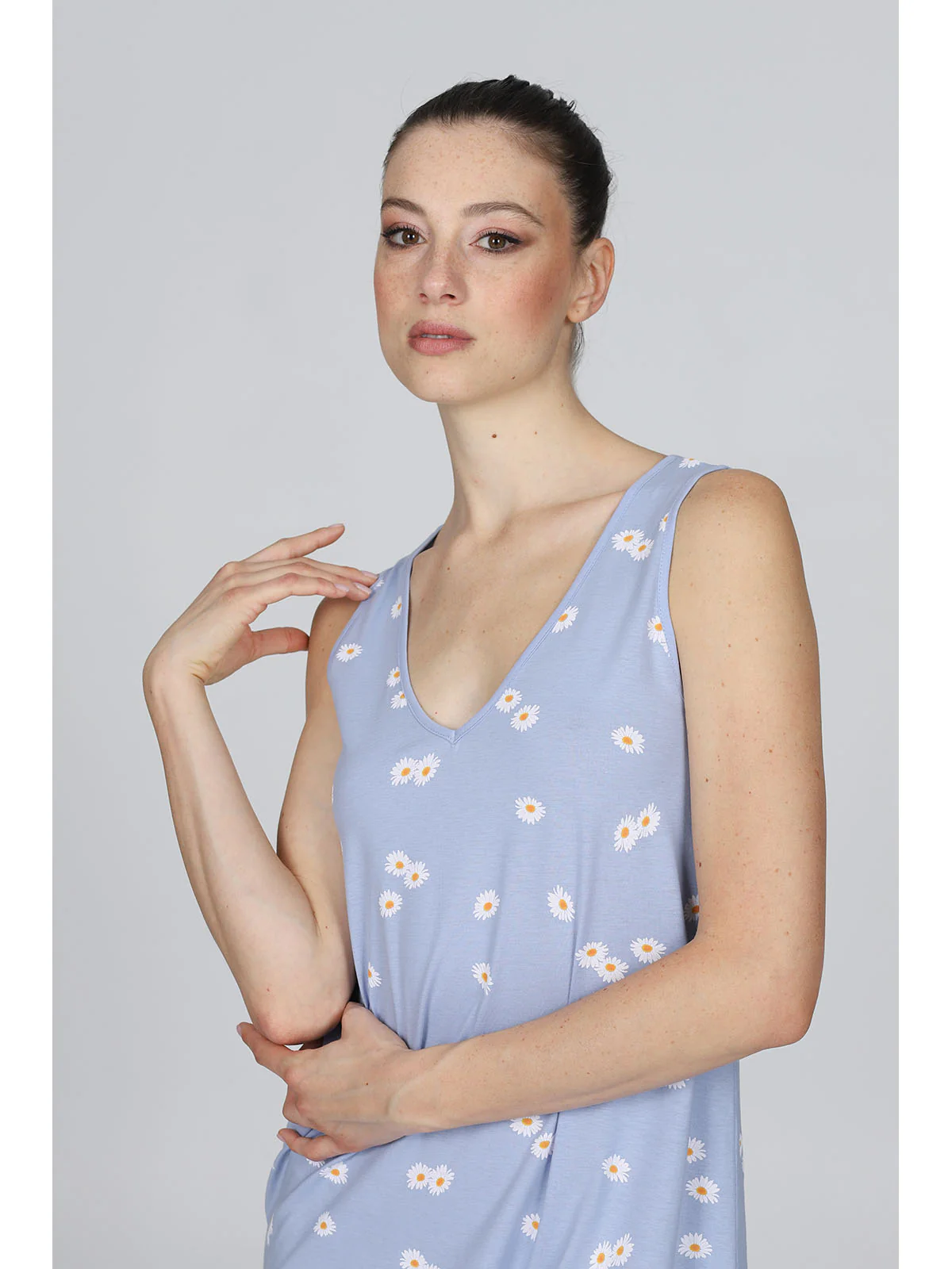 Camicia da notte donna in fresco jersey 36/1 di puro cotone pettinato. Tessuto stampato in raffinata fantasia floreale. Modello con spallina larga e scollo a V. Comfort moderno per una femminilità classica firmata Alpina.
