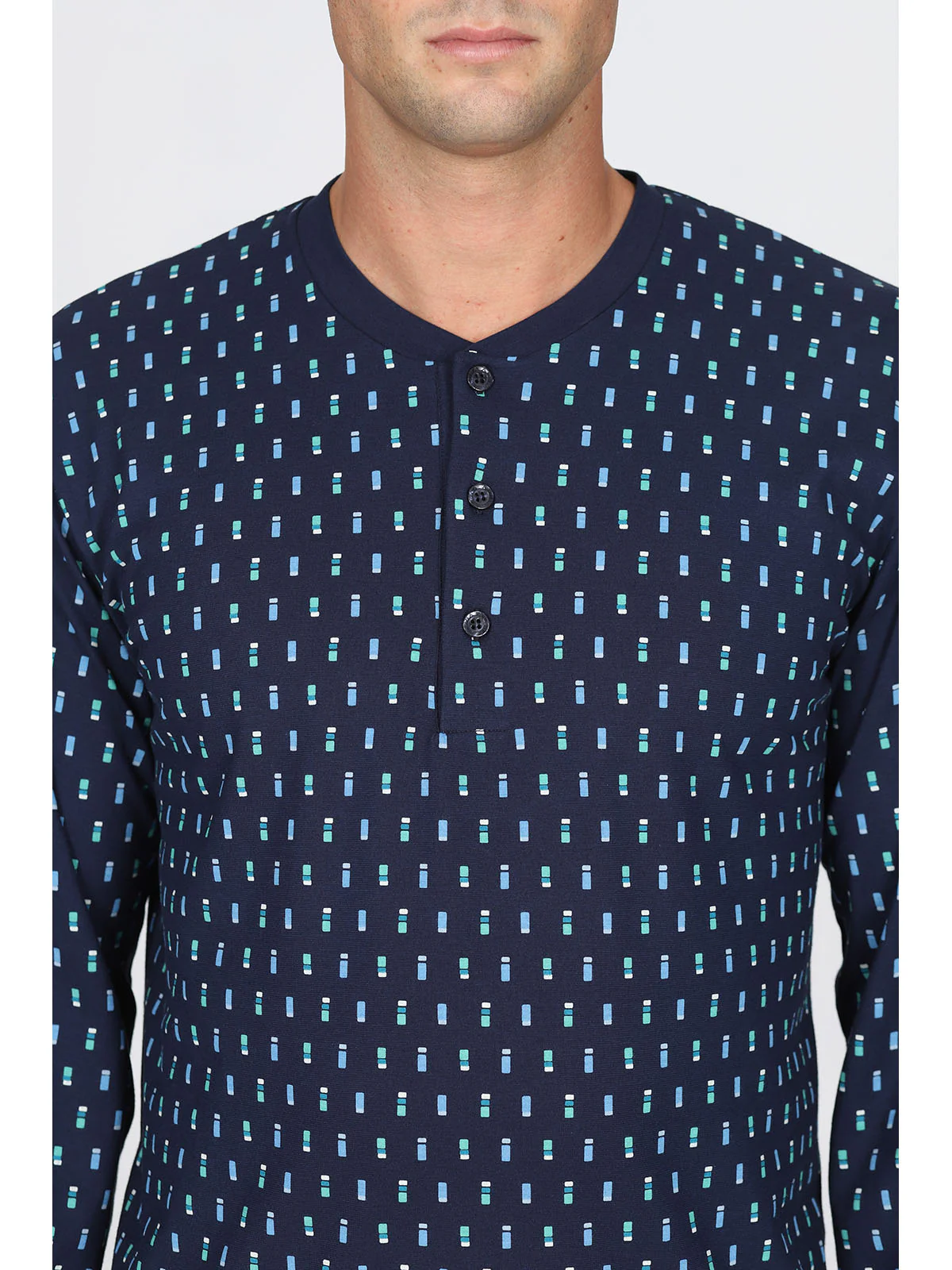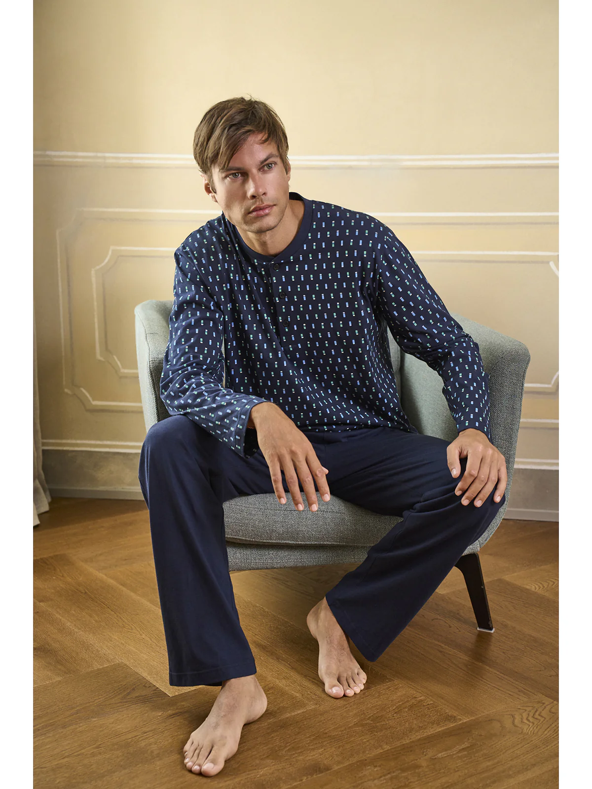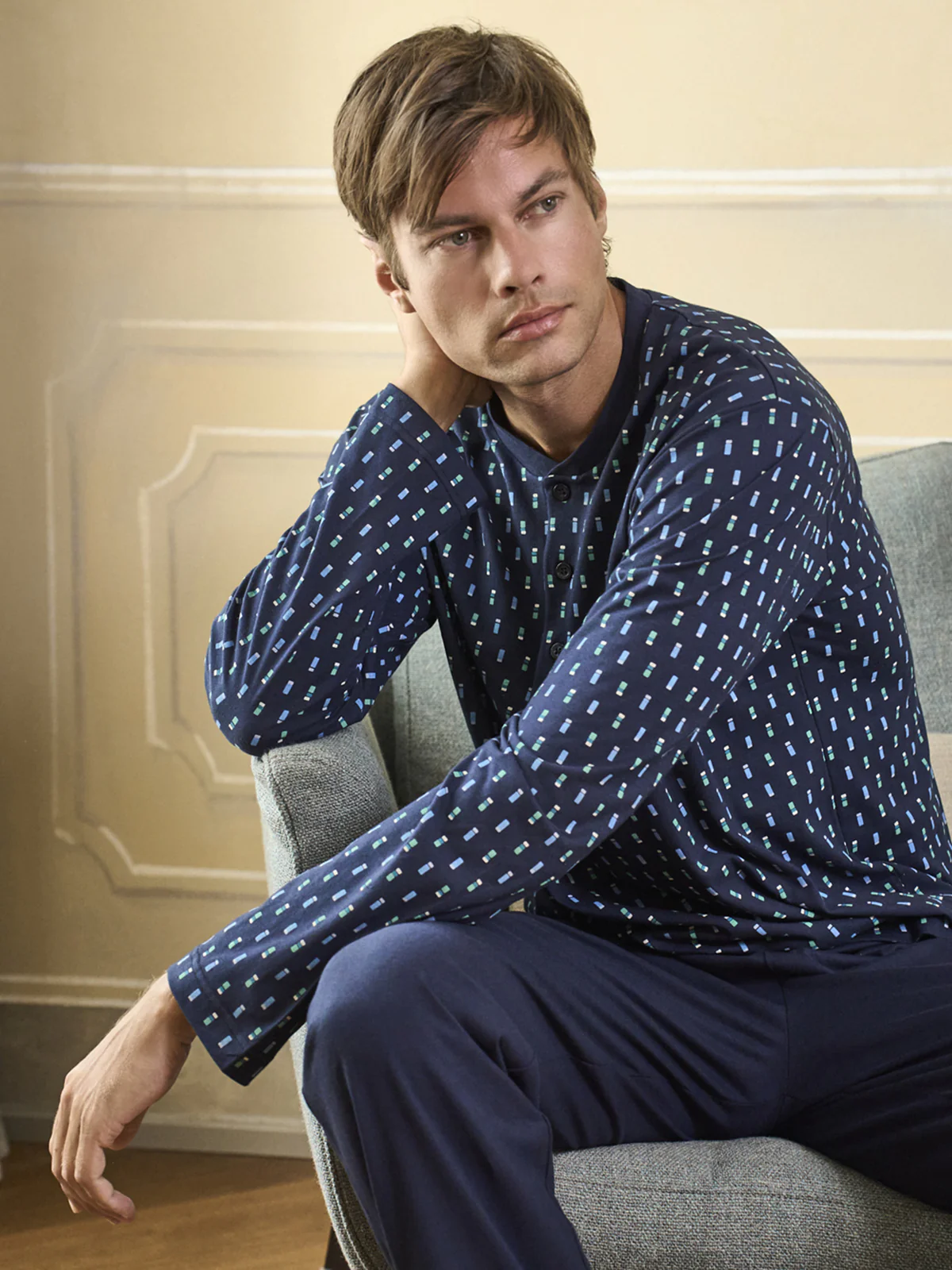 Pigiama lungo serafino uomo in fresco jersey 36/1 di puro cotone pettinato. Elegante e raffinato capo notte, completo con giacca in classica fantasia cravatteria e pantaloni in tinta unita.
