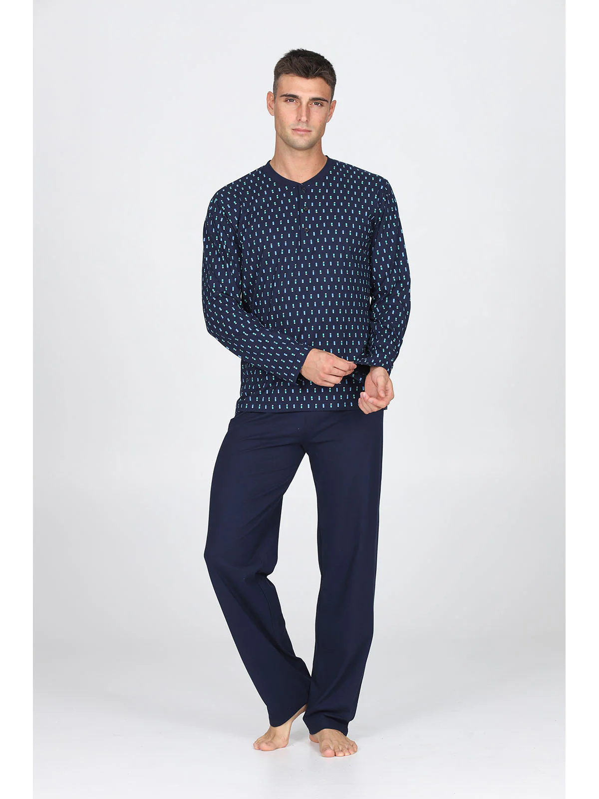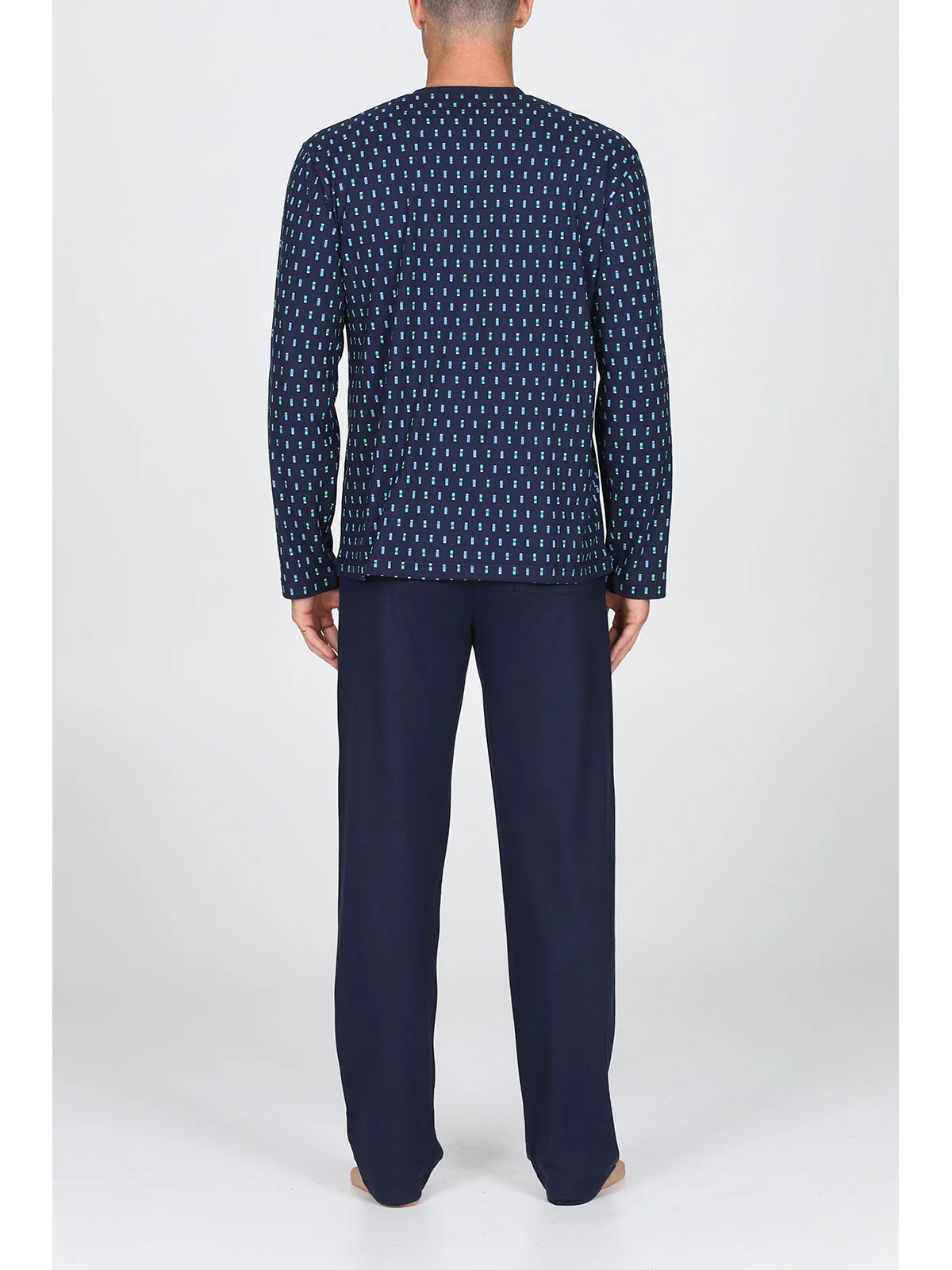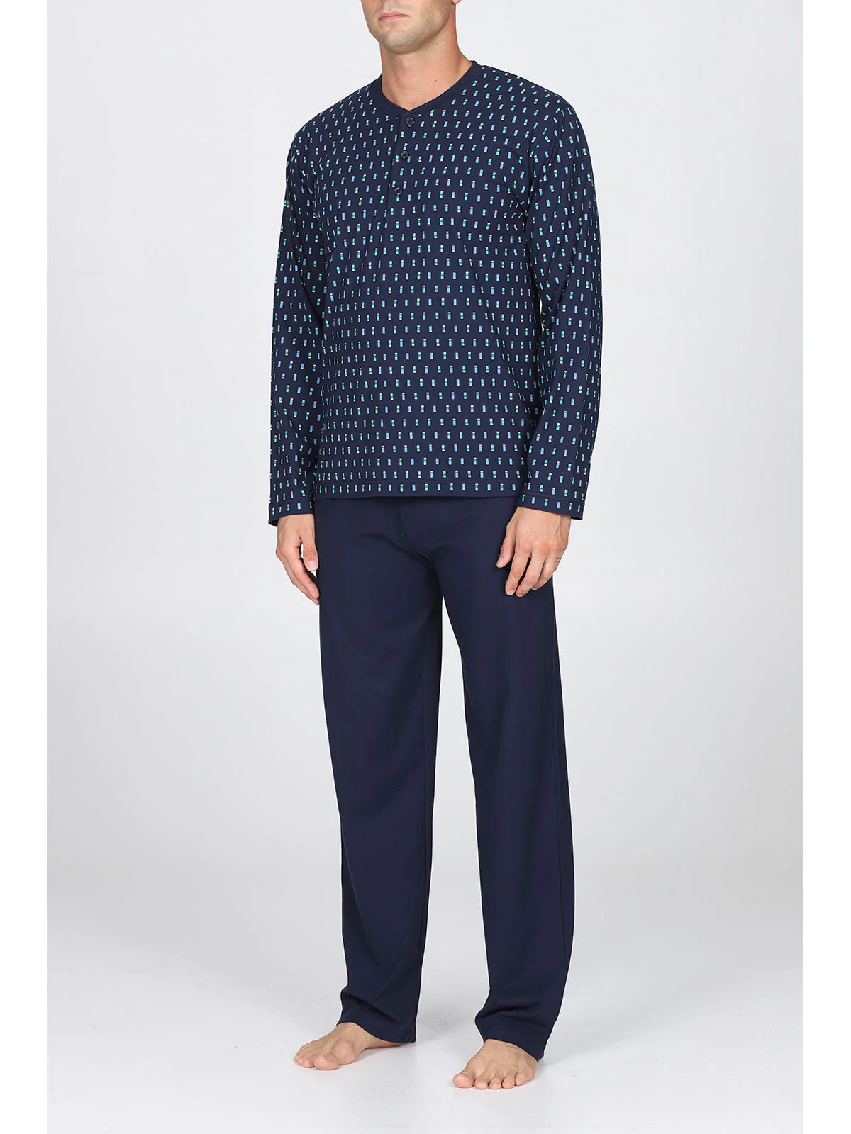 Pigiama lungo serafino uomo in fresco jersey 36/1 di puro cotone pettinato. Elegante e raffinato capo notte, completo con giacca in classica fantasia cravatteria e pantaloni in tinta unita.