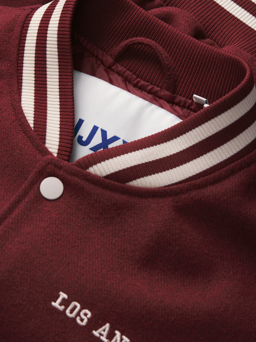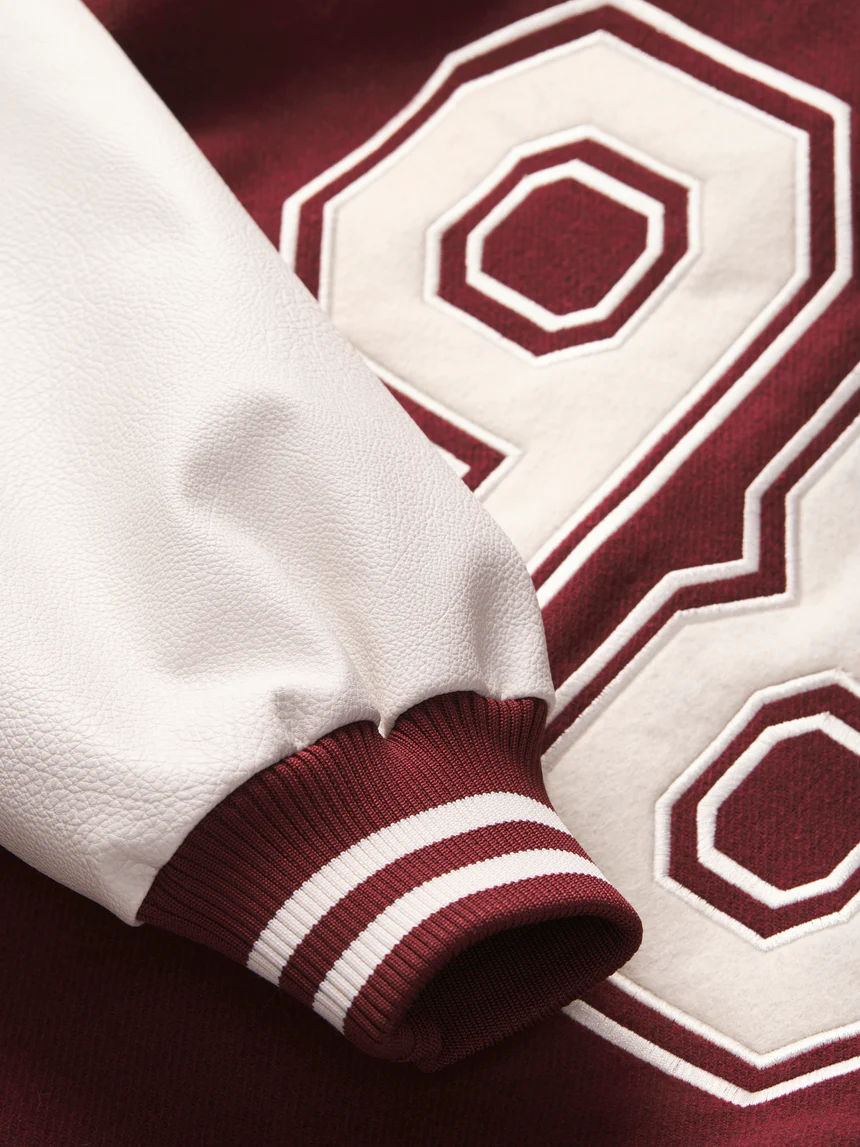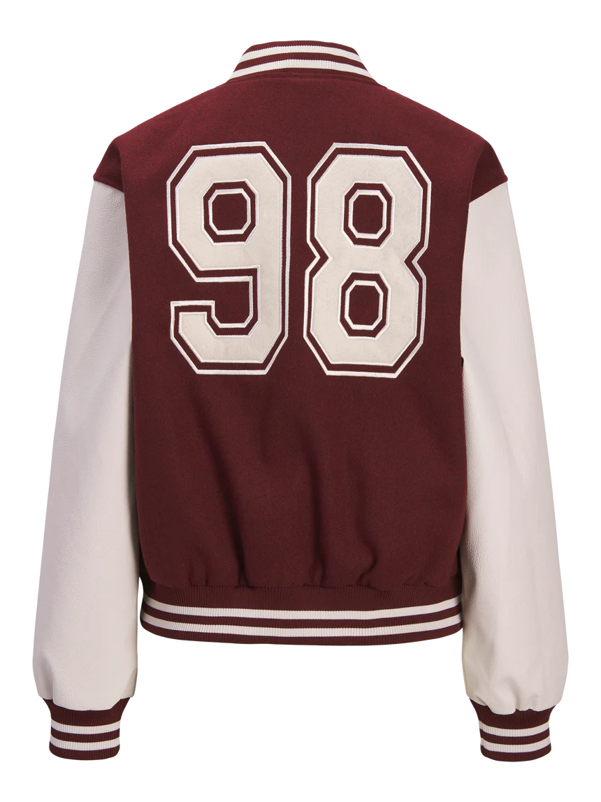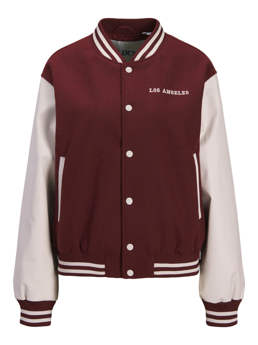 Giacca college modellino morbido, con maniche in ecopelle, bottoni e e tasche a contrasto, presenta elastico in vita, chiusura con bottoni poussoir. Con ricamo sul retro. Foderato internamente.