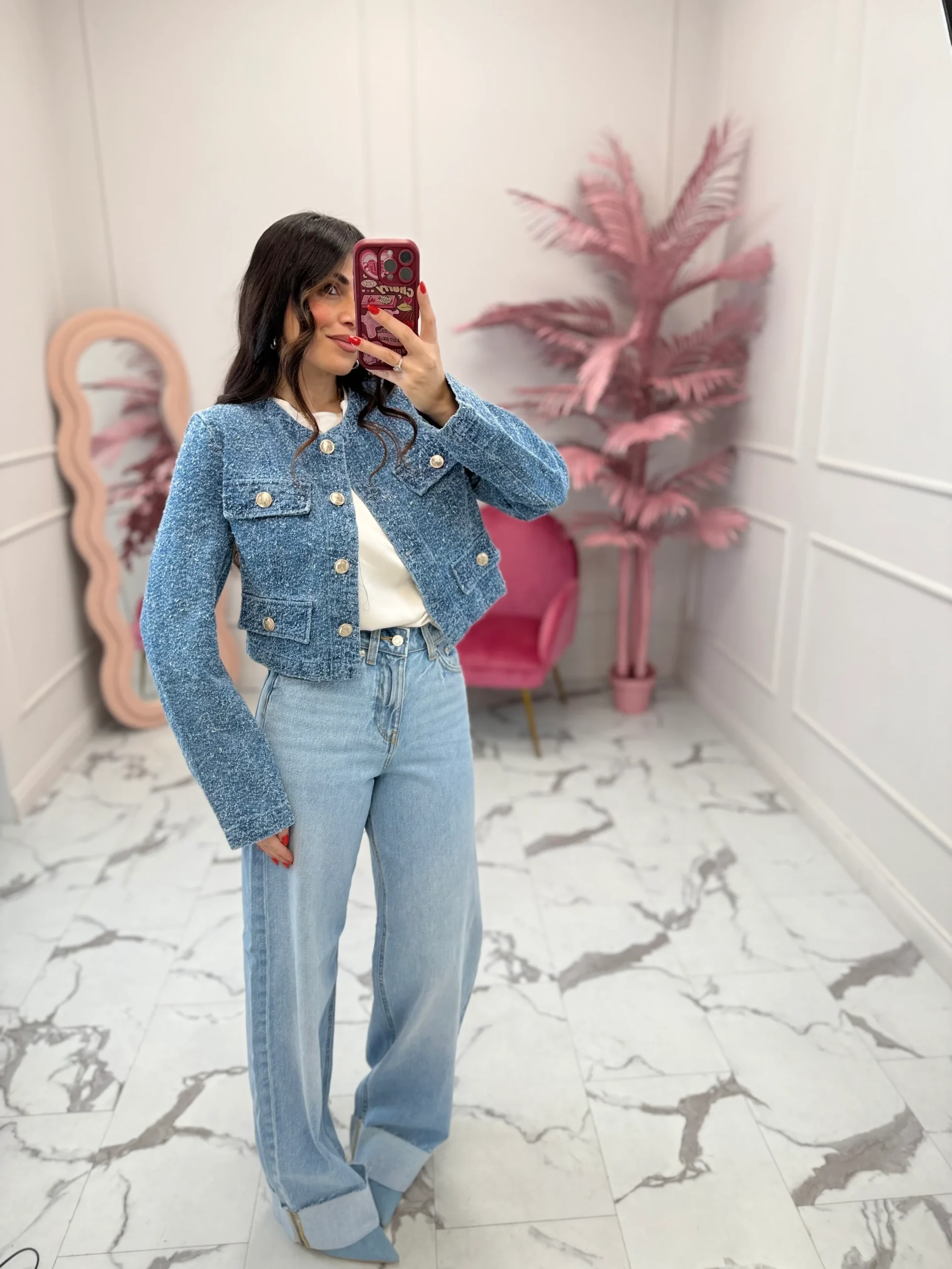 Giacca in denim effetto bouclè, modello corto, girocollo, presenta 4 tasche finte sul davanti con maxi bottoni, abbottonatura nella parte anteriore, vestibilità regolare. La modella indossa taglia S.