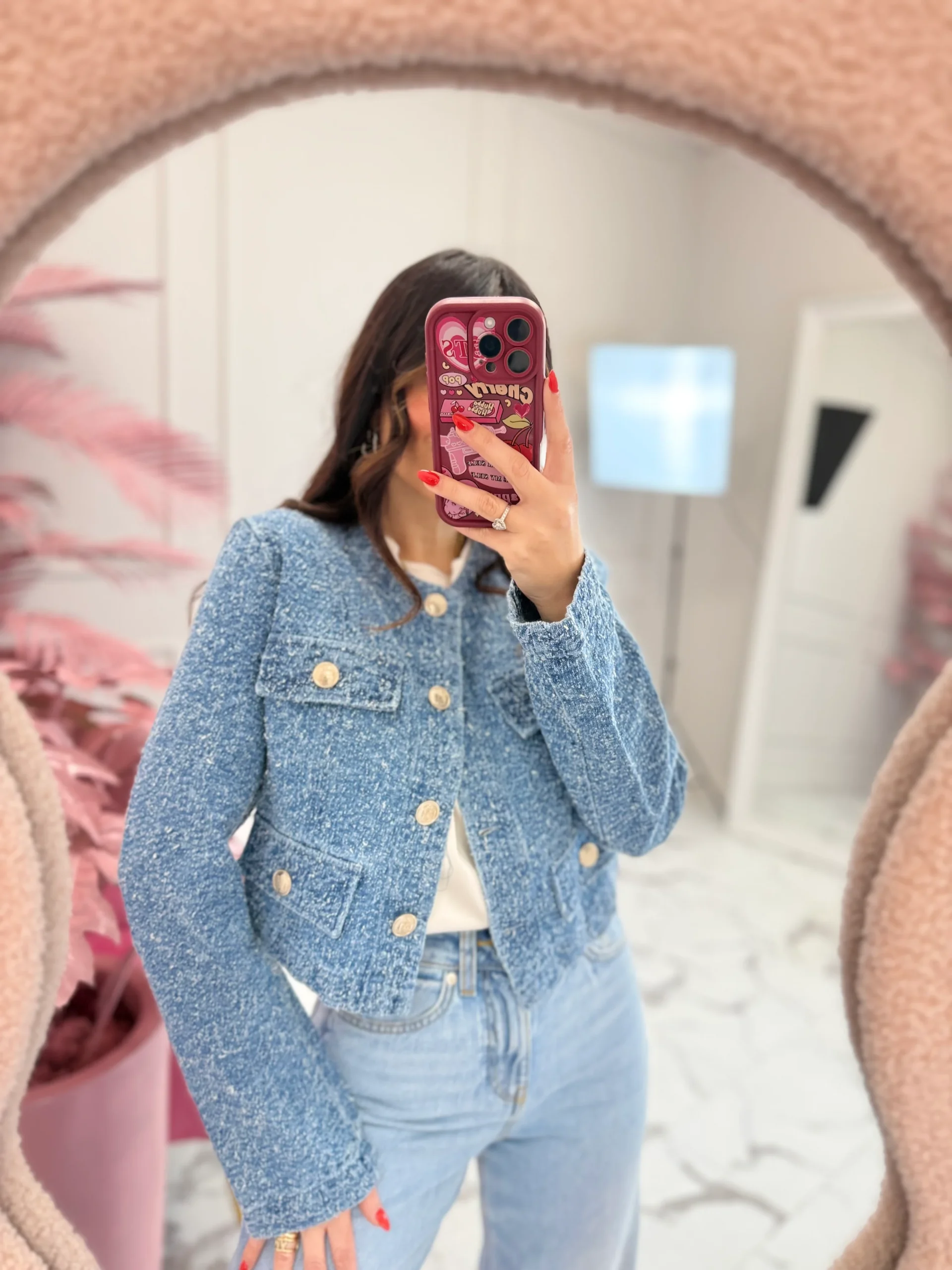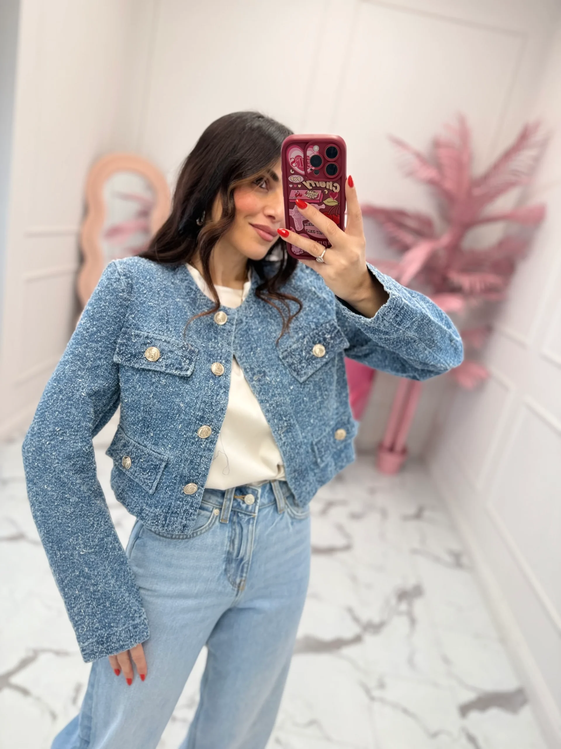 Giacca in denim effetto bouclè, modello corto, girocollo, presenta 4 tasche finte sul davanti con maxi bottoni, abbottonatura nella parte anteriore, vestibilità regolare. La modella indossa taglia S. composizione: 100% cotone