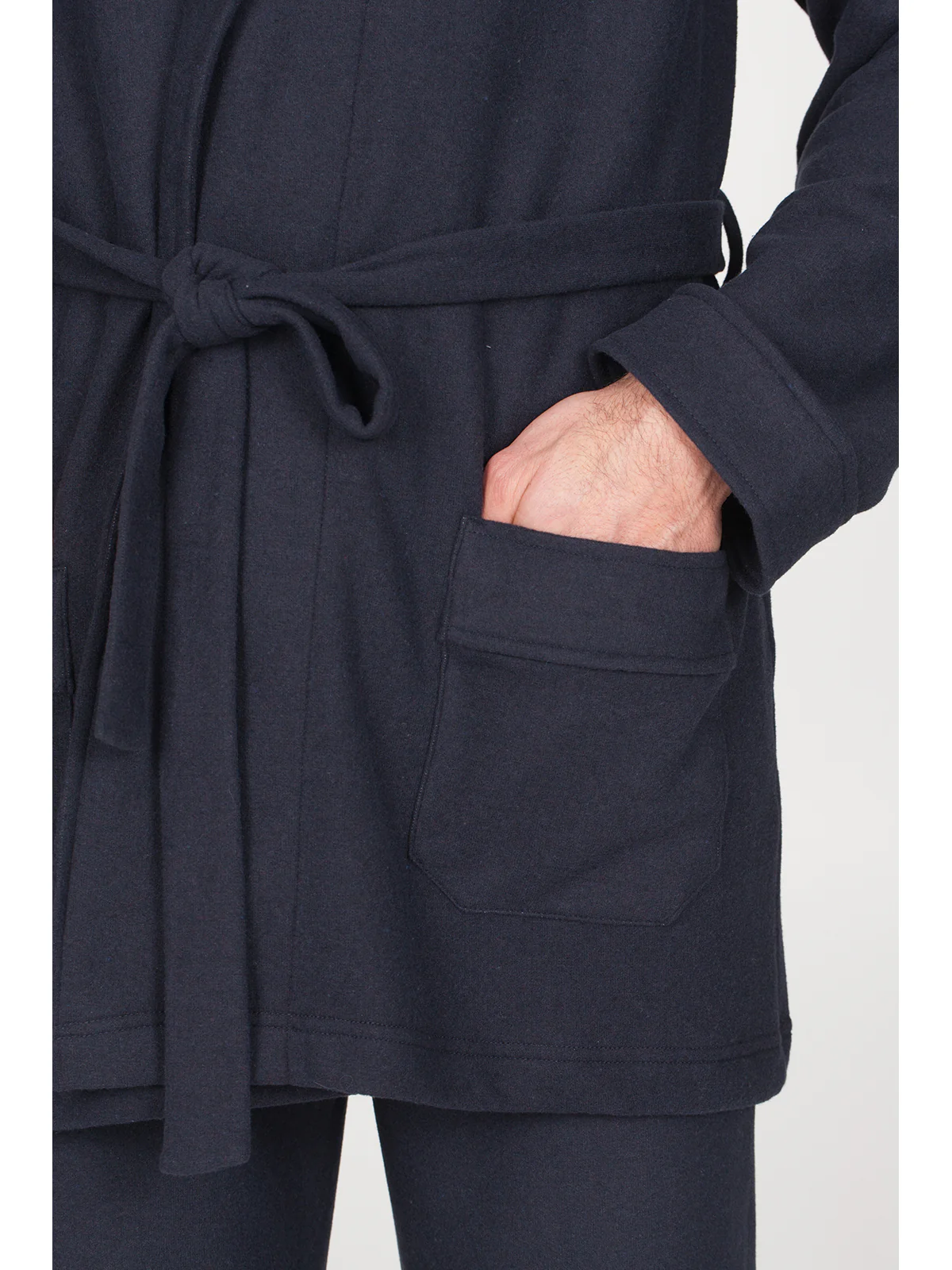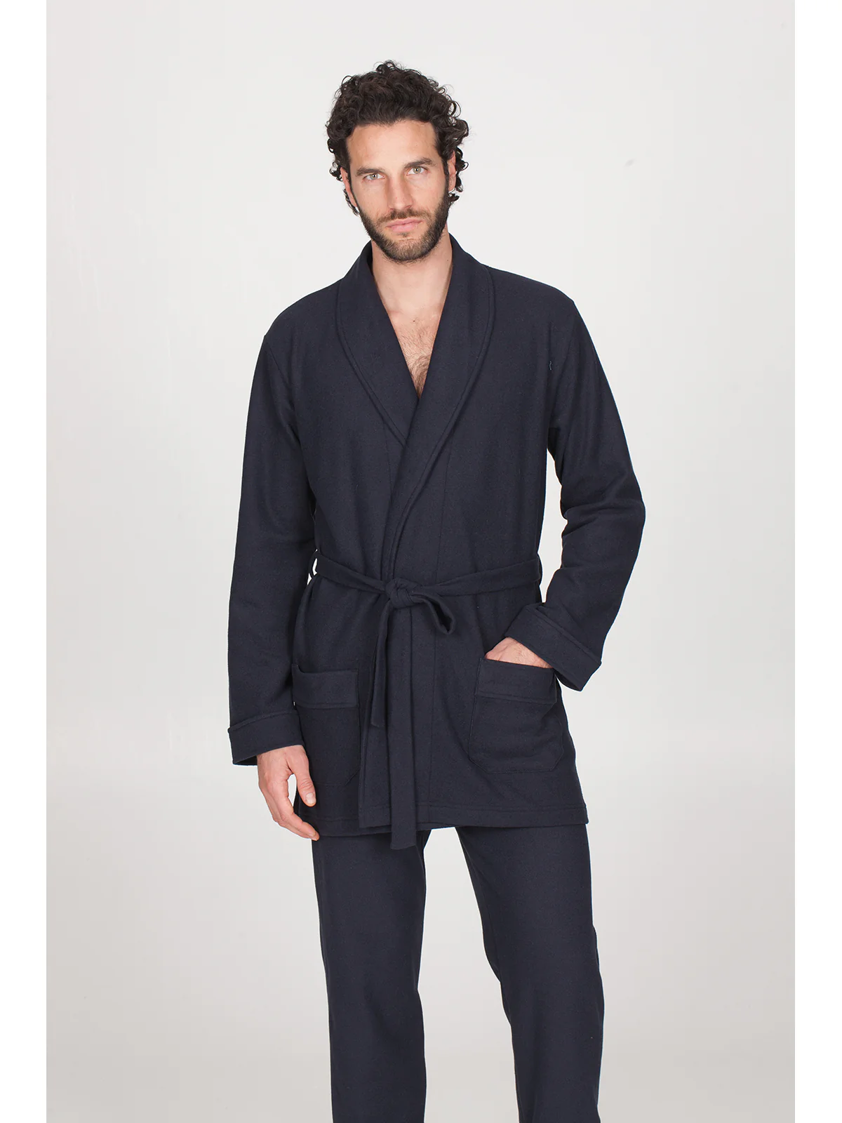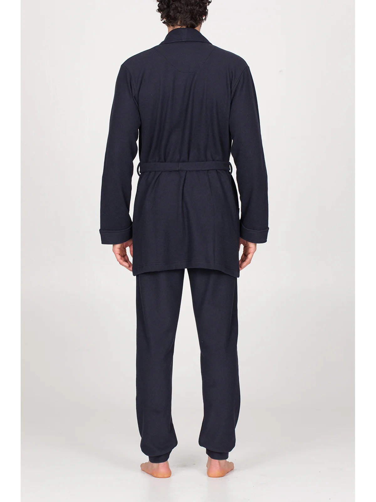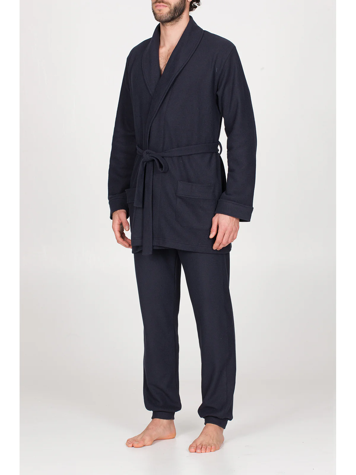 Giacca da camera uomo in punto milano di cotone: caldo e confortevole, adatto alla notte e allo stare in casa. Modello corto con collo sciallato, pratiche tasche laterali inserite nel fianco e chiusura con cintura e passanti. Ideale per i soggetti più freddolosi. Qualità e tradizione firmata Alpina.