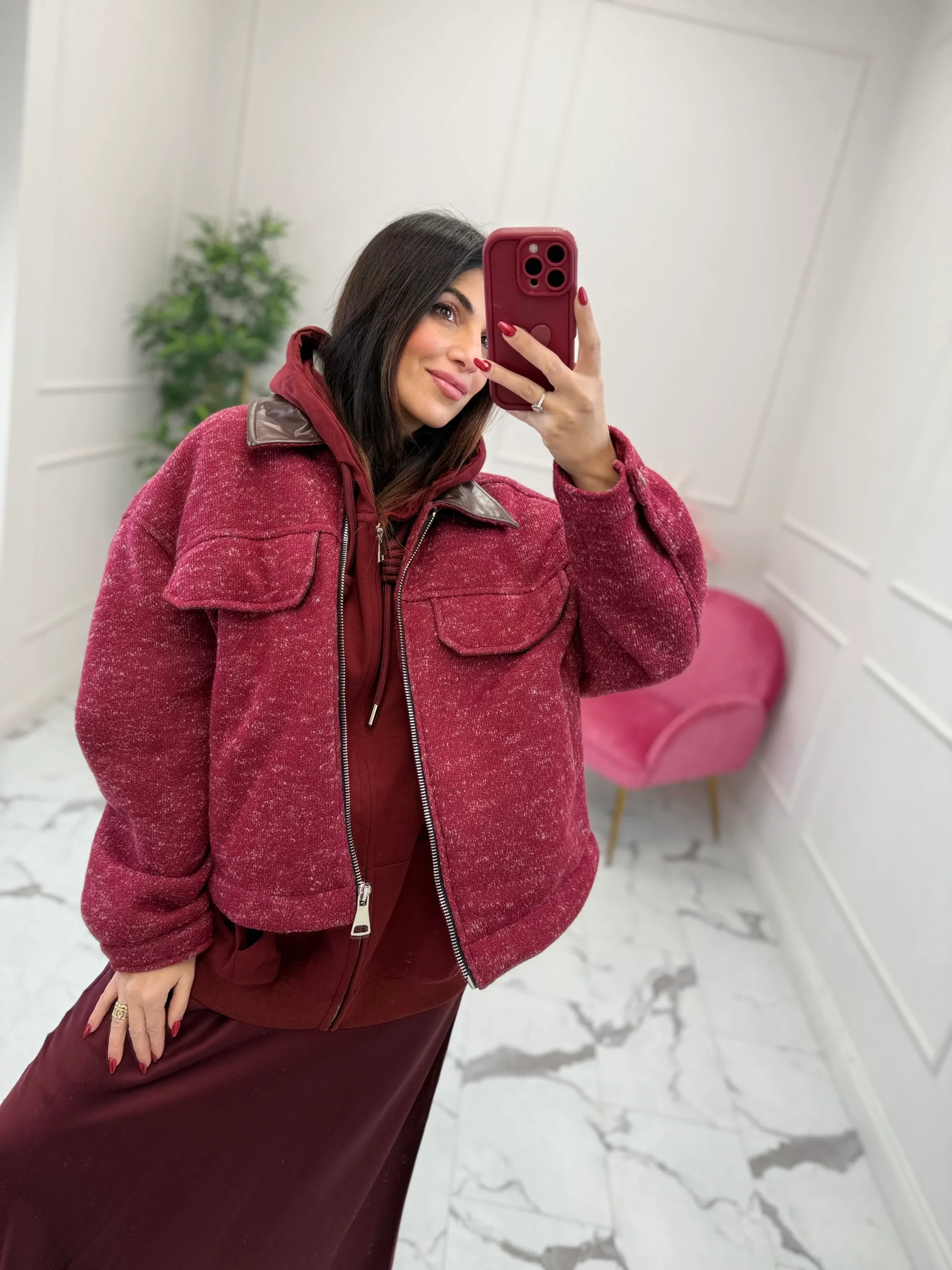 Giacca imbottita effeto fiammato, colletto in ecopelle a contrasto. Presenta tasche e taschino finto su lato sinistro. Vestibilità regolare. Composizione :95% poliestere, 5% cotone, 50% poliuretano. La modella indossa taglia S/M