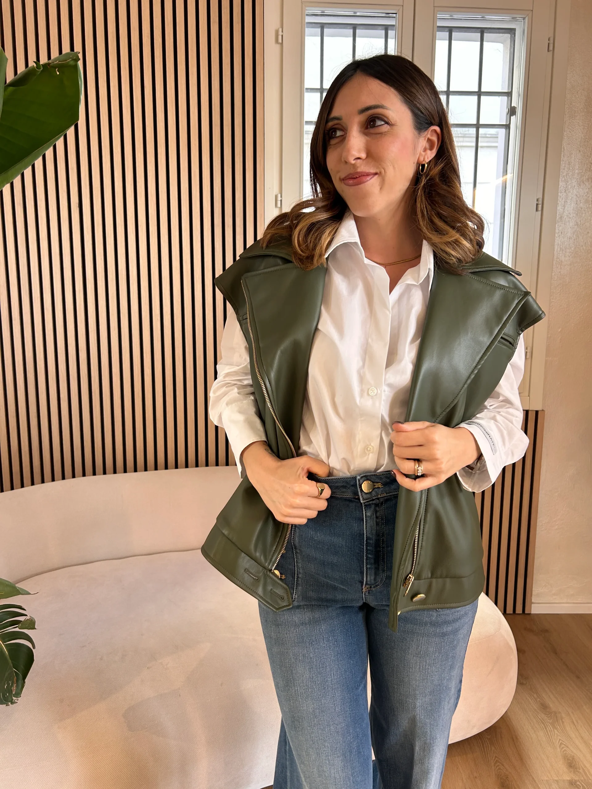 Gilet smanicato in ecopelle verde militare di Haveone con zip, morbido e perfetto come capospalla primaverile.